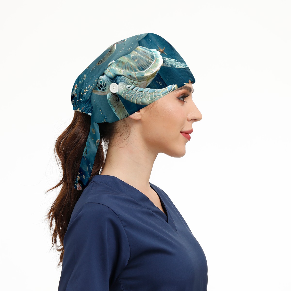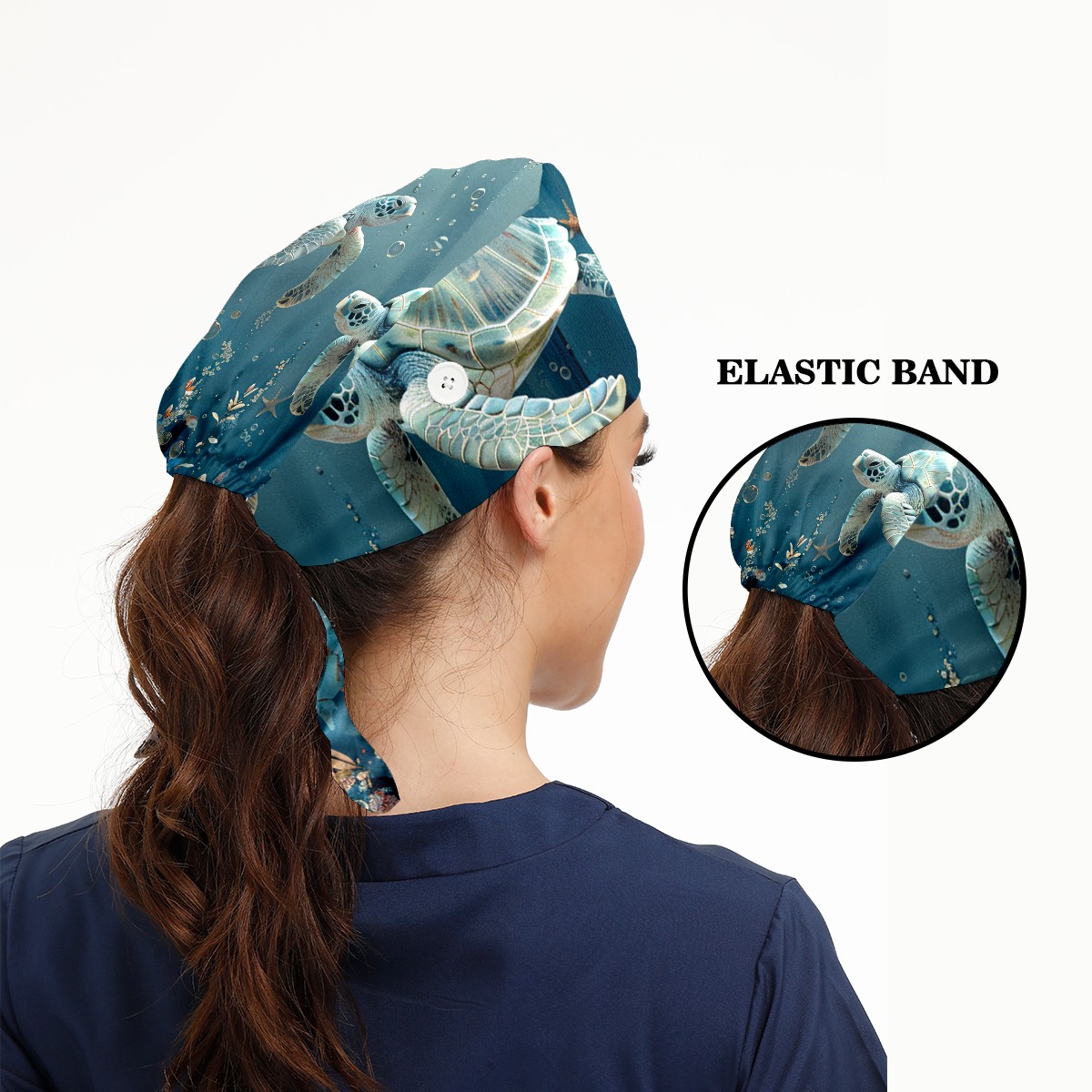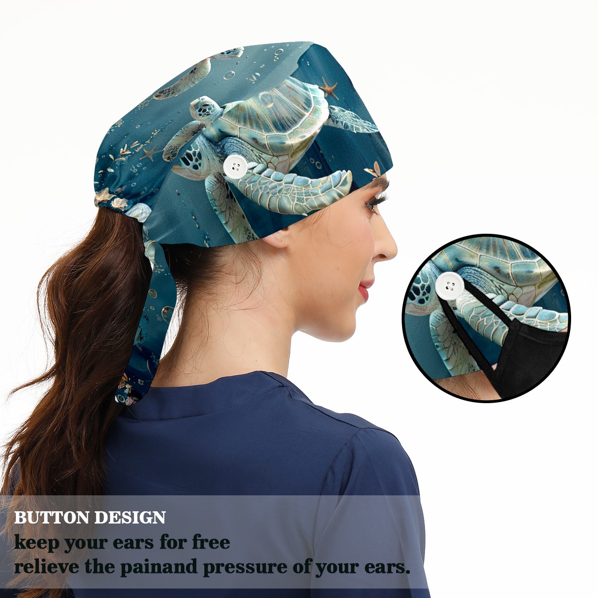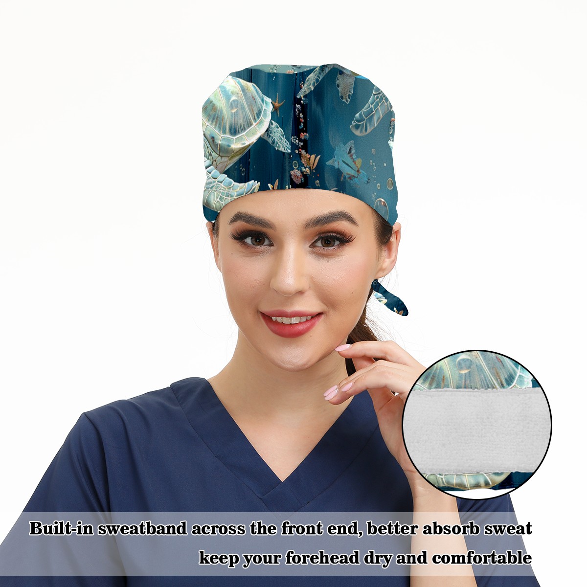 Working Caps with Button & Sweatband Satin Lined Cotton Adjustable Nurse Hats Elastic Band Scrub Cap Surgeon Hat Turtle