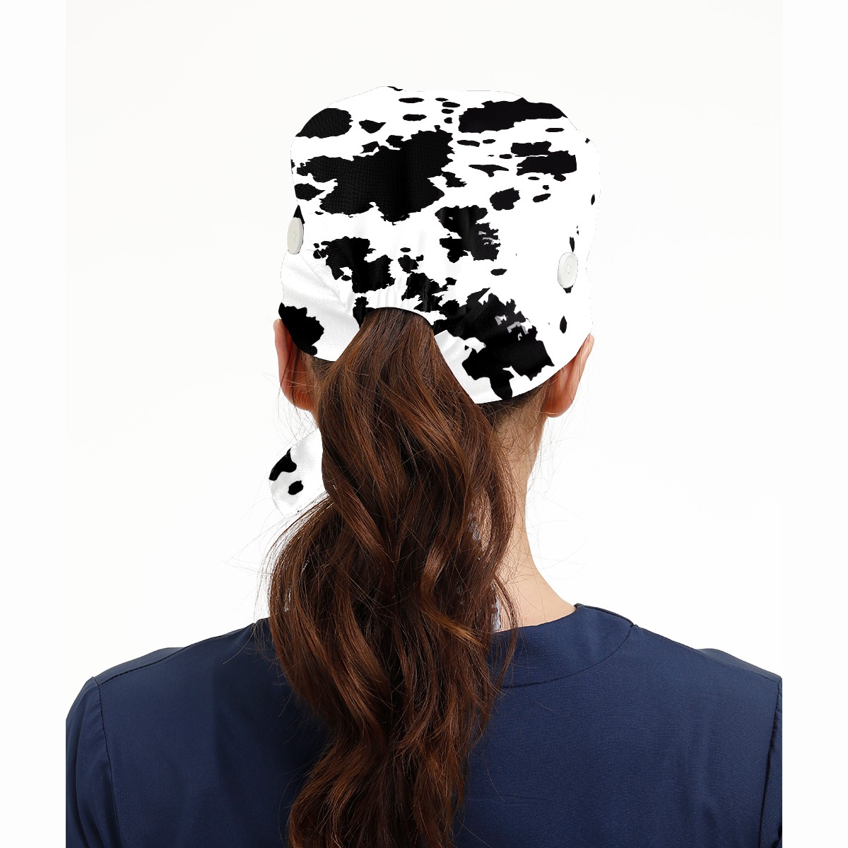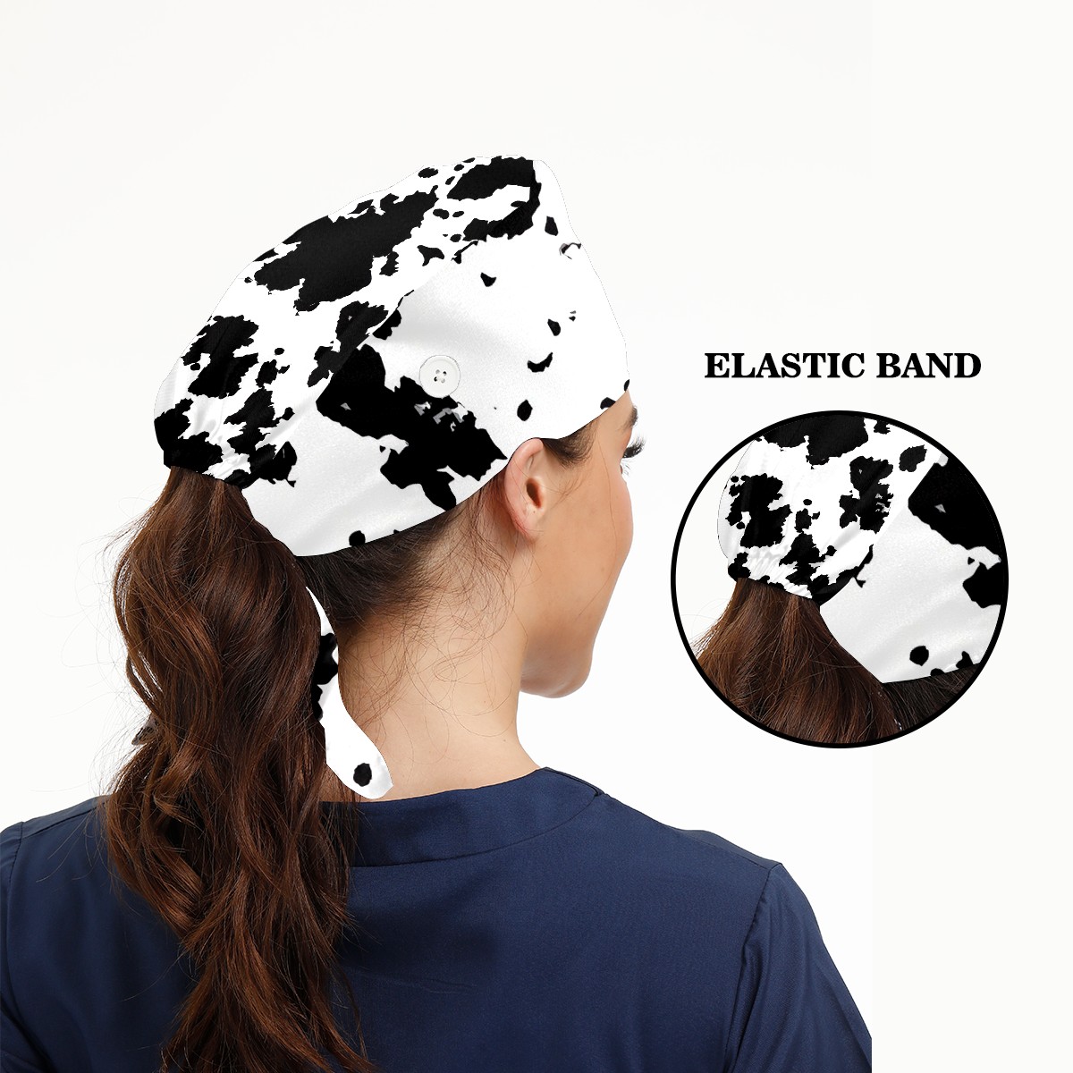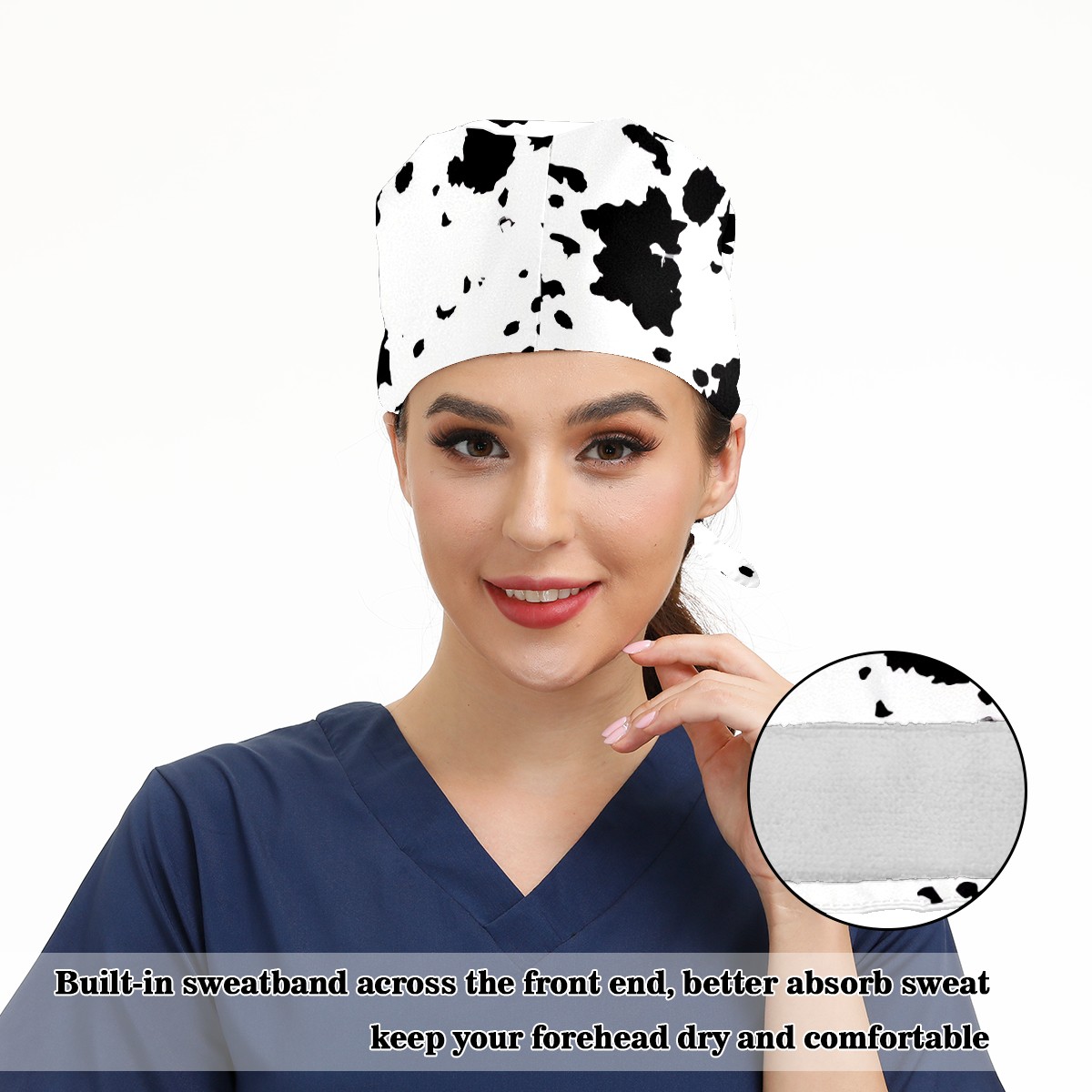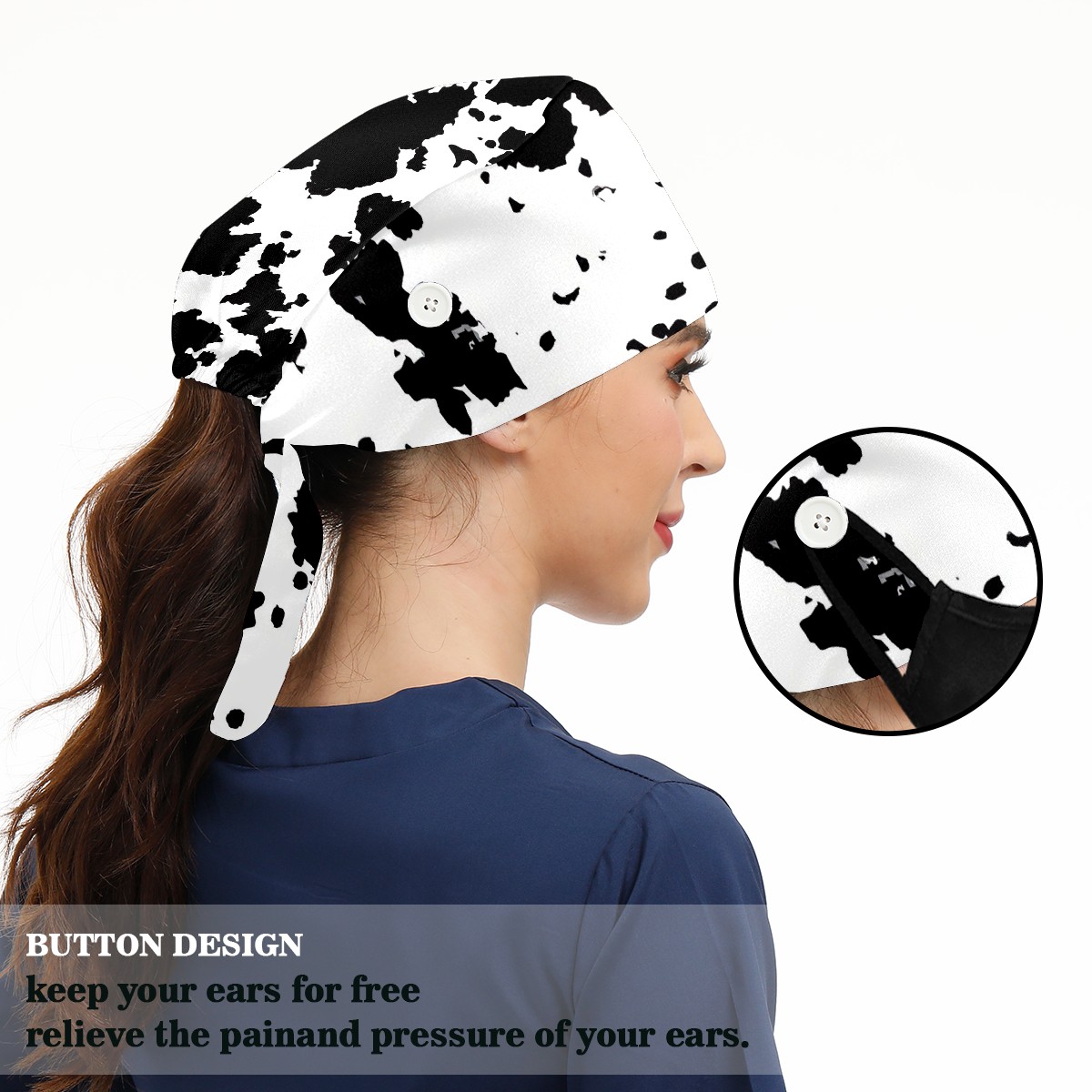 Working Caps with Button & Sweatband Satin Lined Cotton Adjustable Nurse Hats Elastic Band Scrub Cap Surgeon Hat Western Black And White Cow Print
