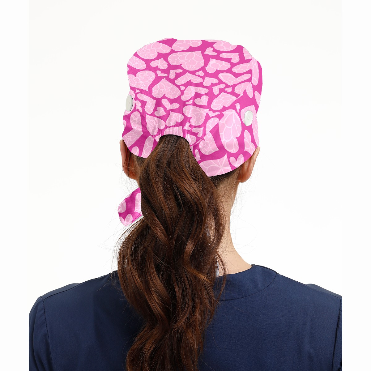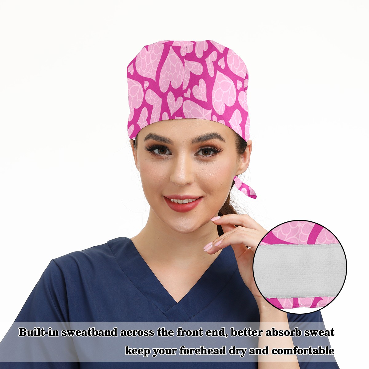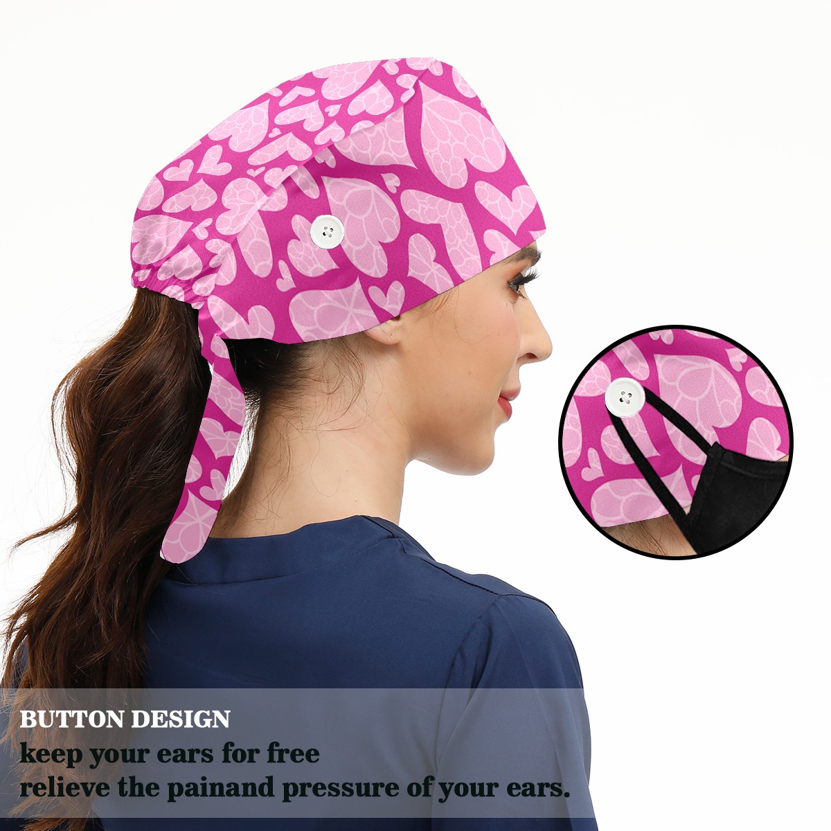 Working Caps with Button & Sweatband Satin Lined Cotton Adjustable Nurse Hats Elastic Band Scrub Cap Surgeon Hat Pink Floral Hearts (2)