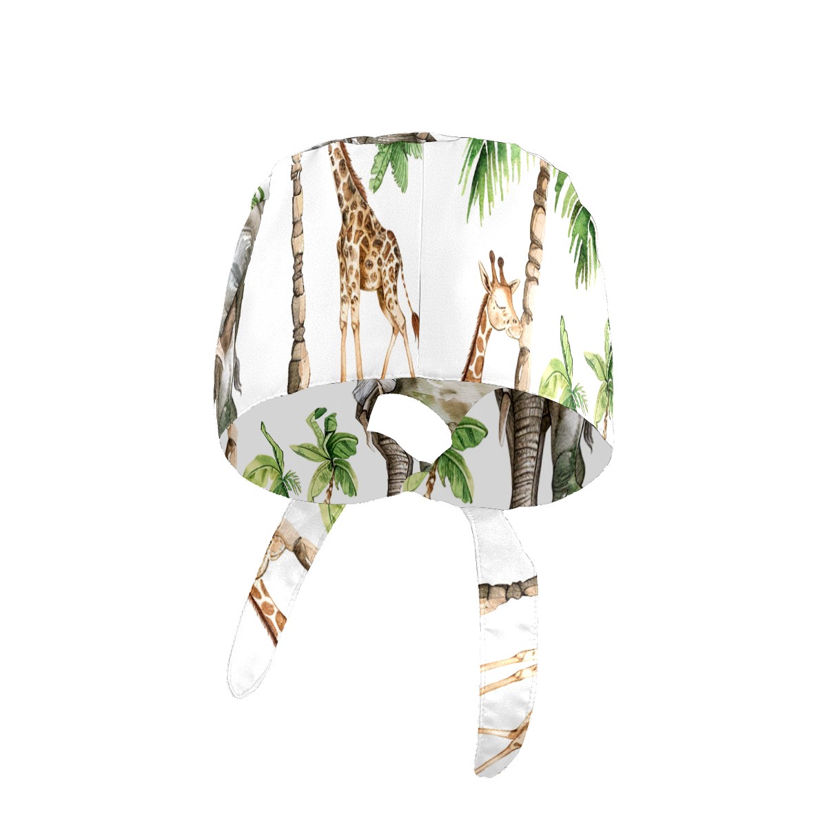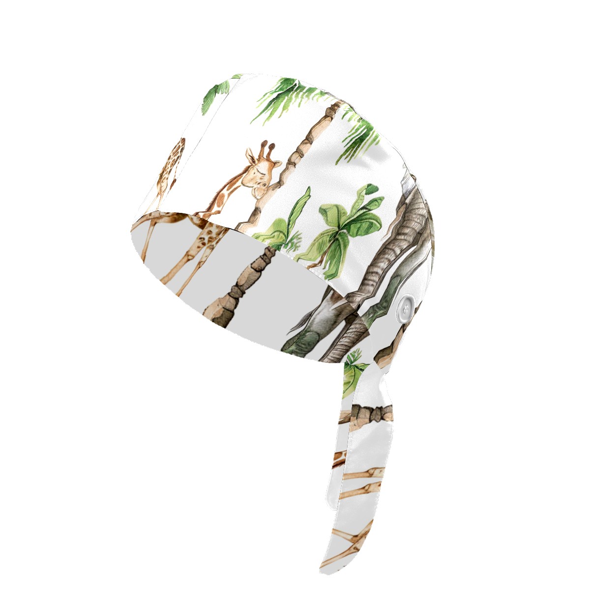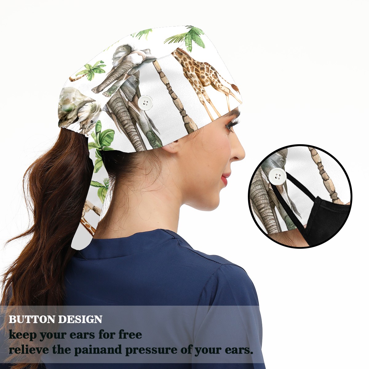 Working Caps with Button & Sweatband Satin Lined Cotton Adjustable Nurse Hats Elastic Band Scrub Cap Surgeon Hat Watercolor Jungle With Palm Trees Giraffe And Elephant (1)