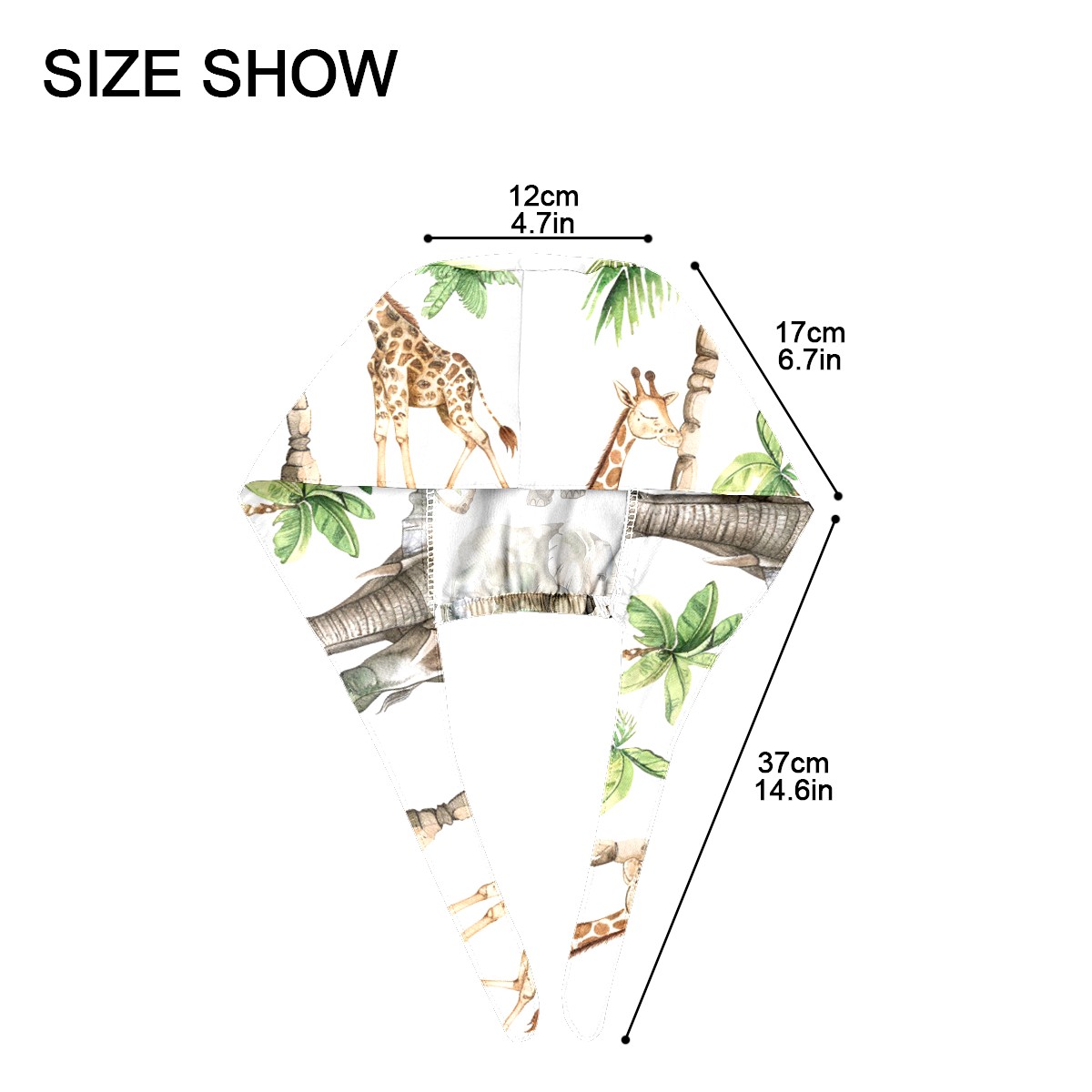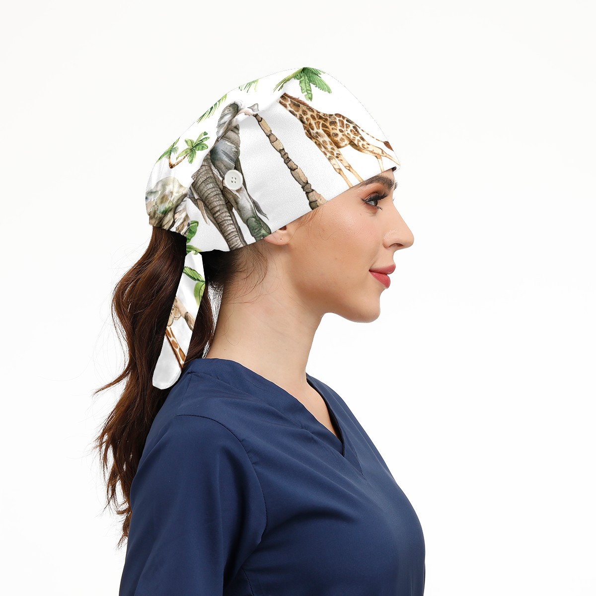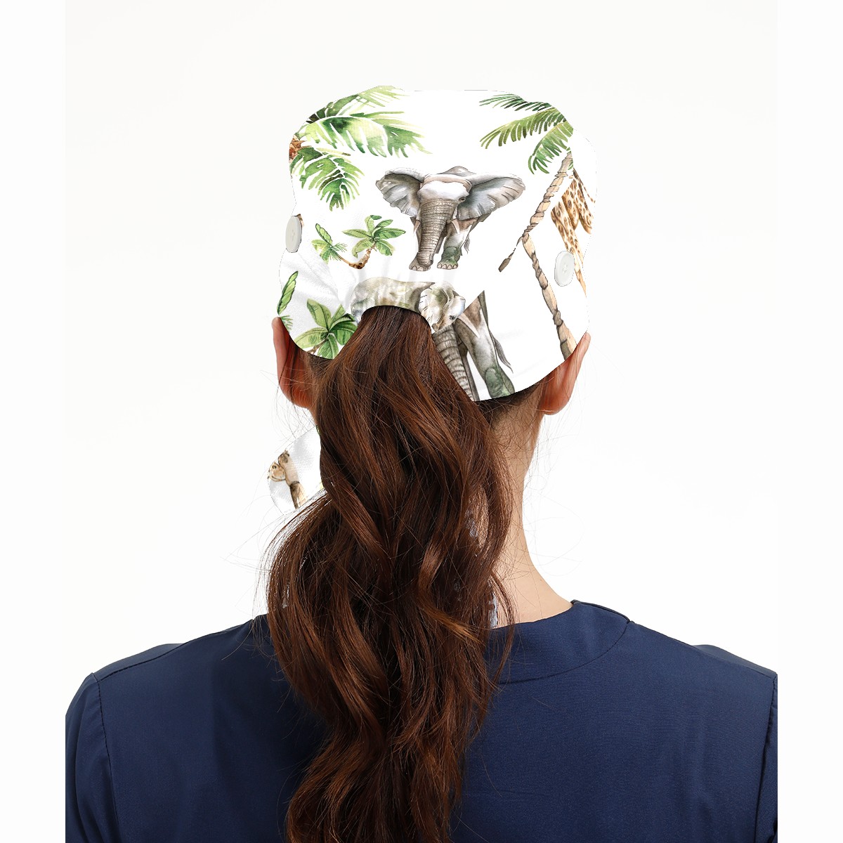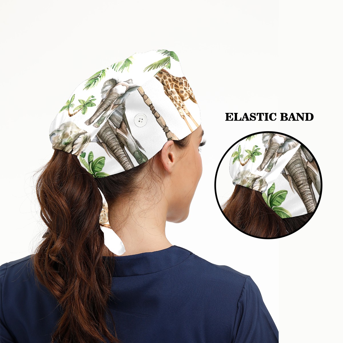Working Caps with Button & Sweatband Satin Lined Cotton Adjustable Nurse Hats Elastic Band Scrub Cap Surgeon Hat Watercolor Jungle With Palm Trees Giraffe And Elephant (1)