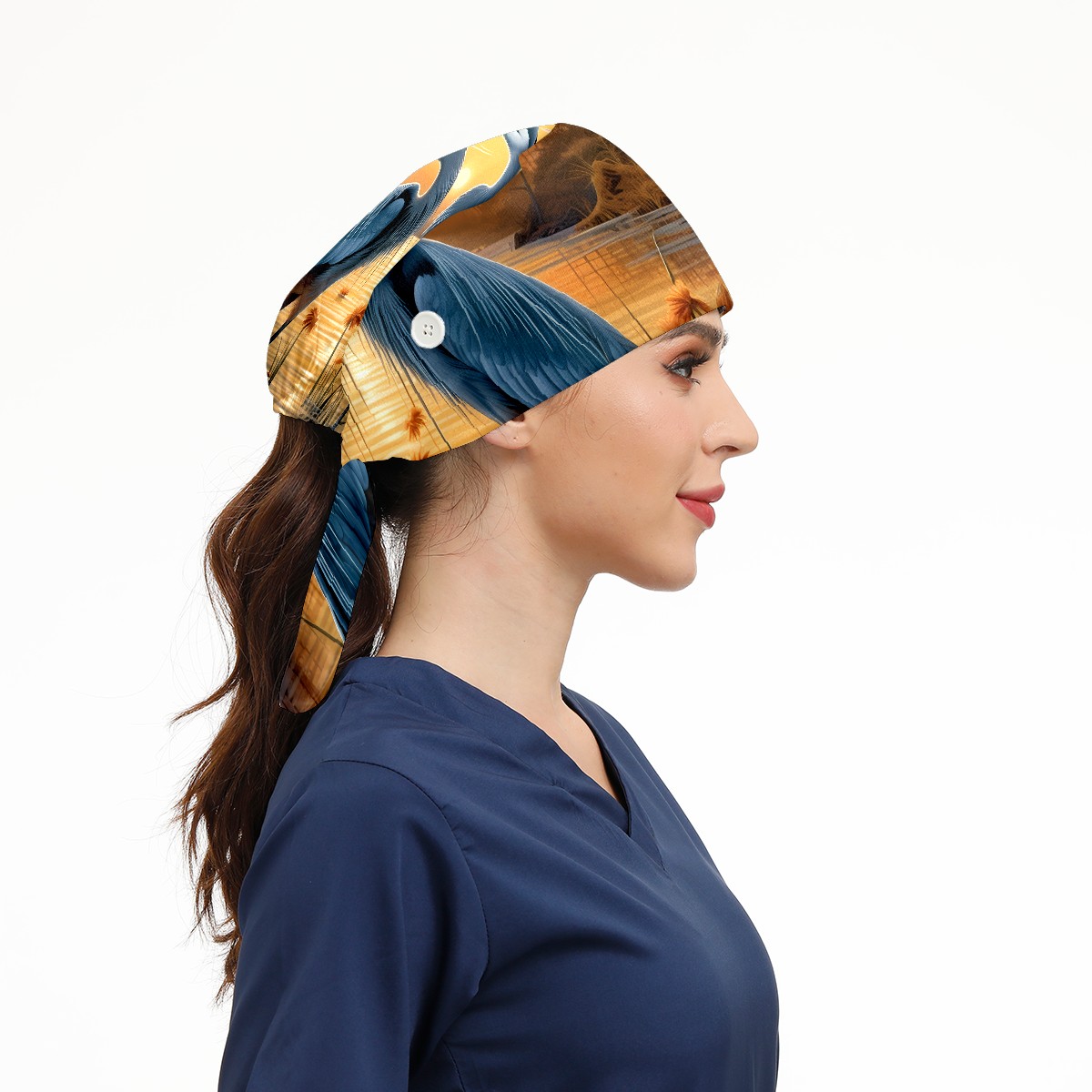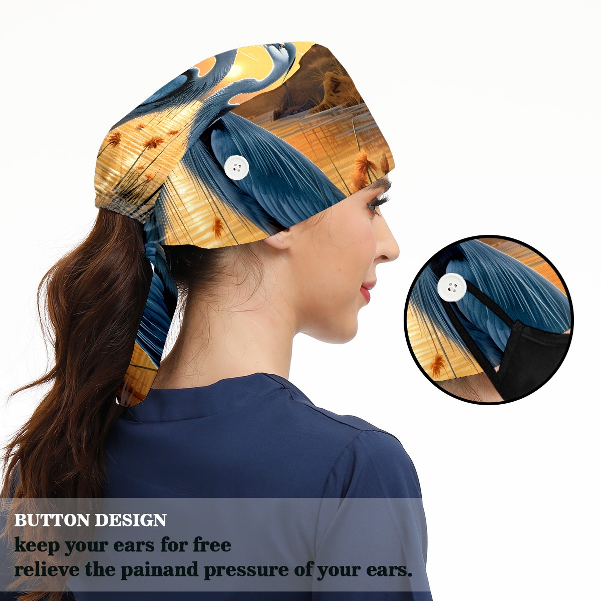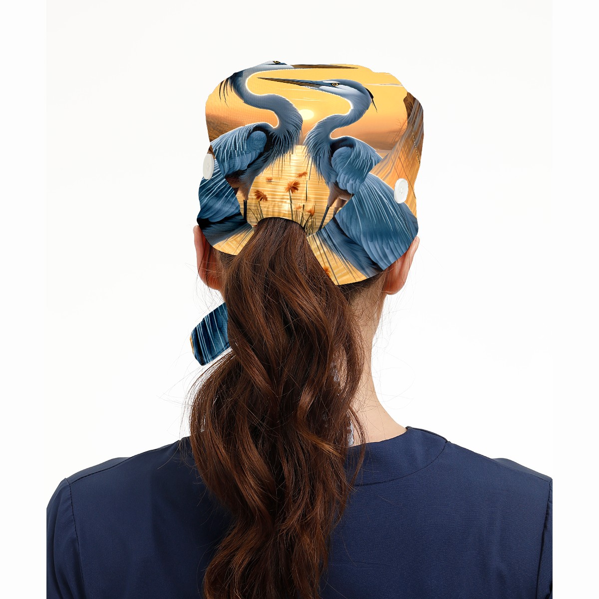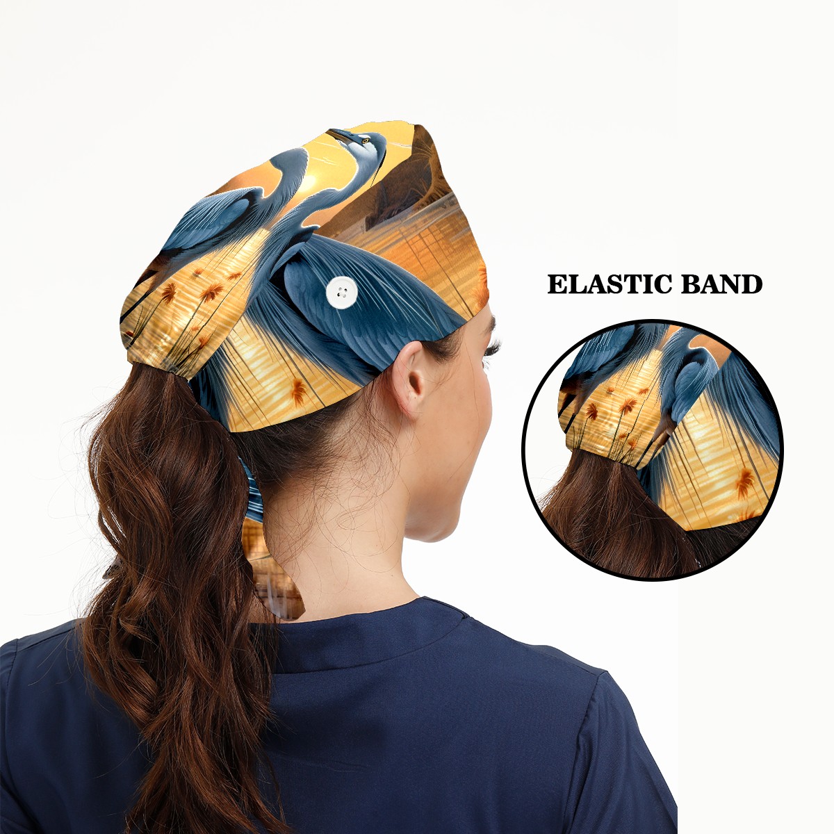 Working Caps with Button & Sweatband Satin Lined Cotton Adjustable Nurse Hats Elastic Band Scrub Cap Surgeon Hat Two Blue Herons Standing