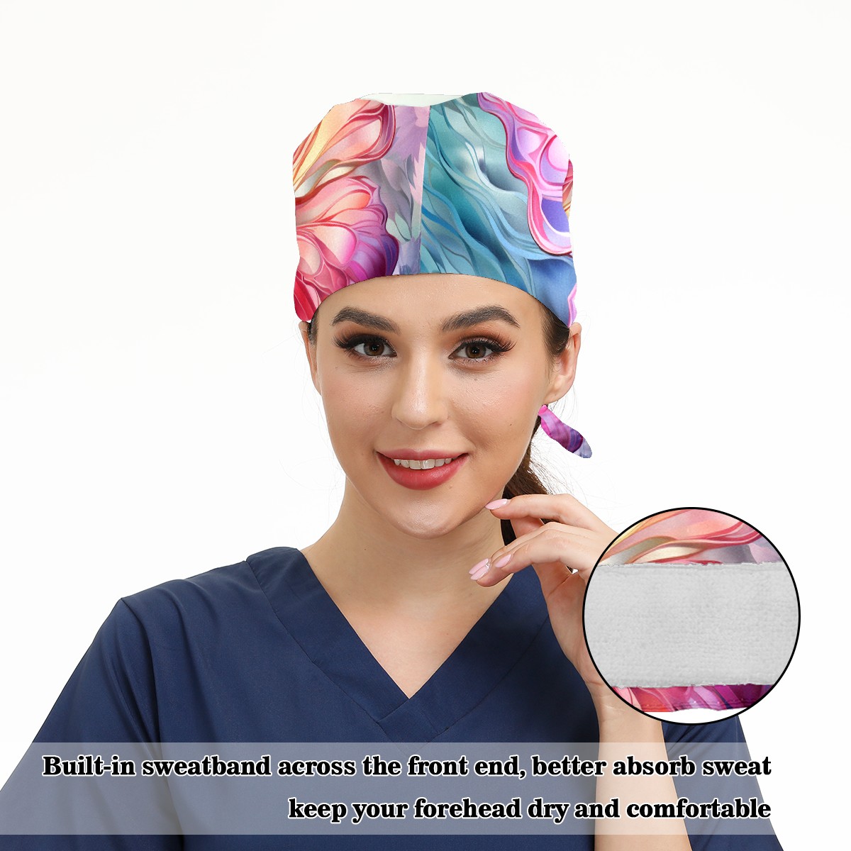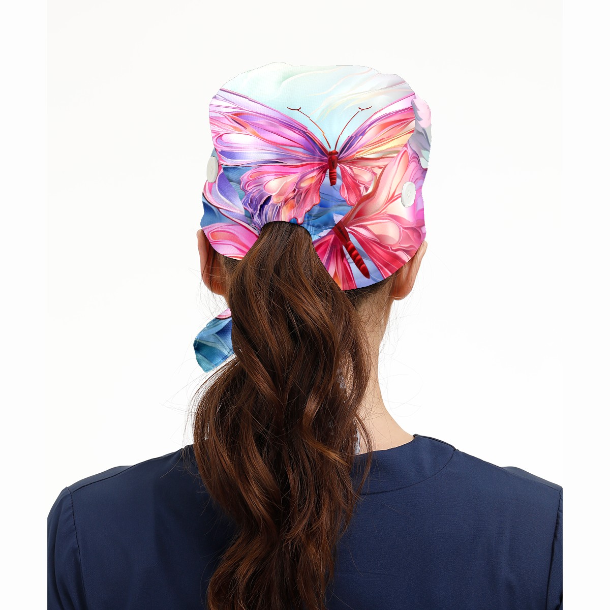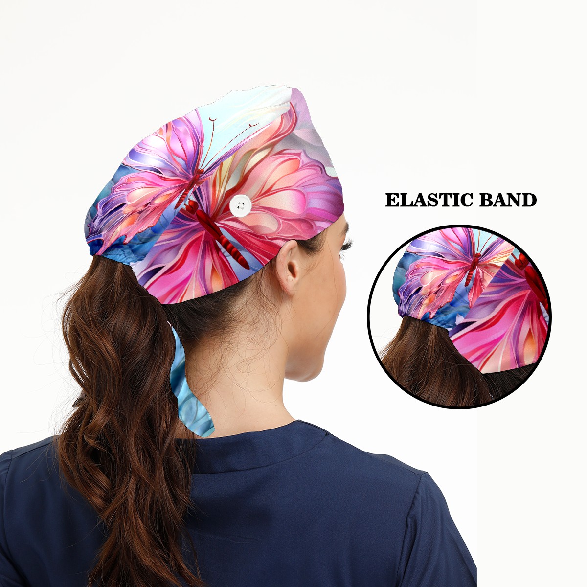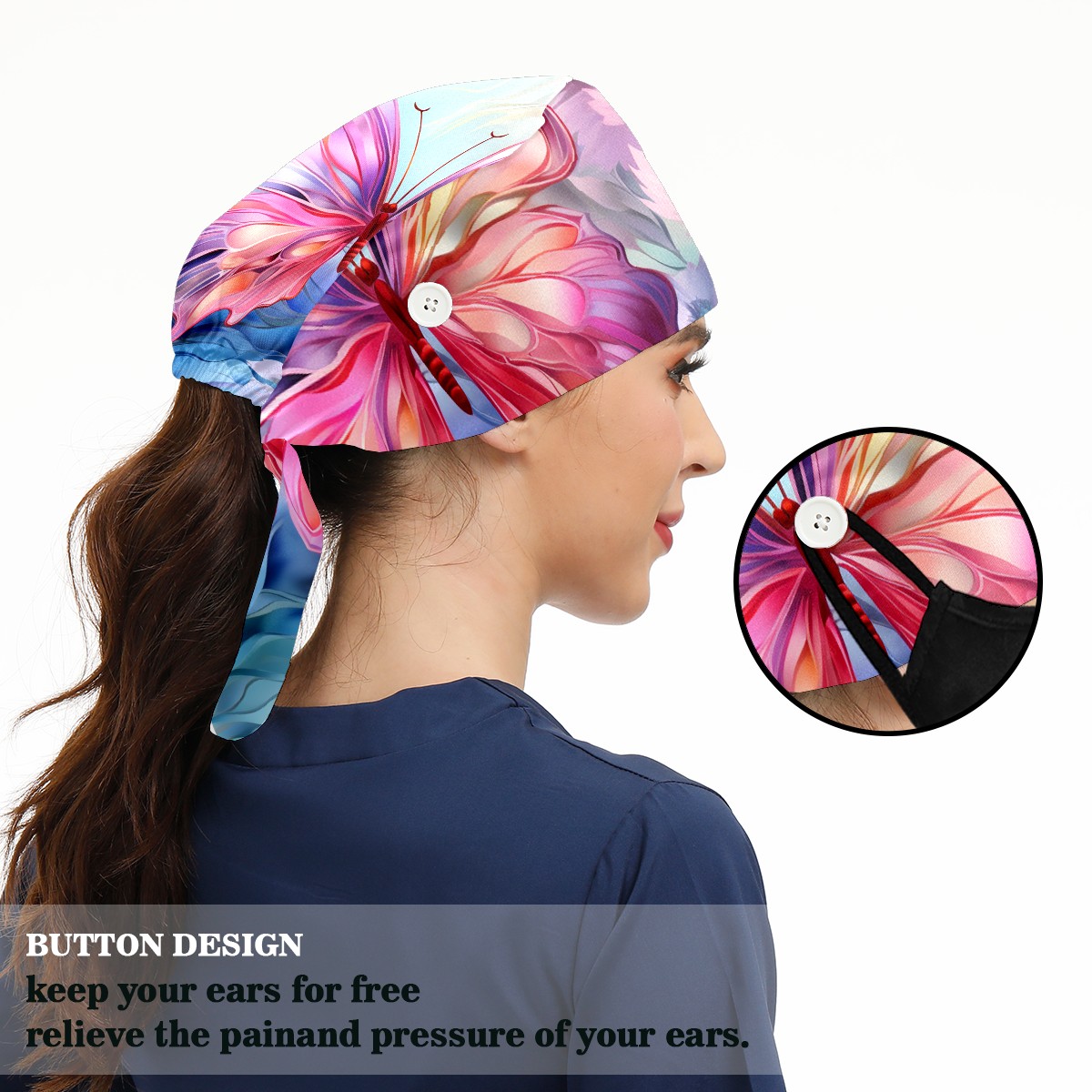 Working Caps with Button & Sweatband Satin Lined Cotton Adjustable Nurse Hats Elastic Band Scrub Cap Surgeon Hat Butterfly (16)
