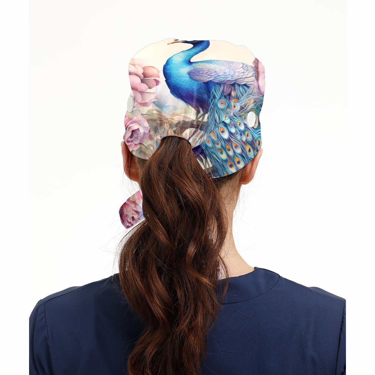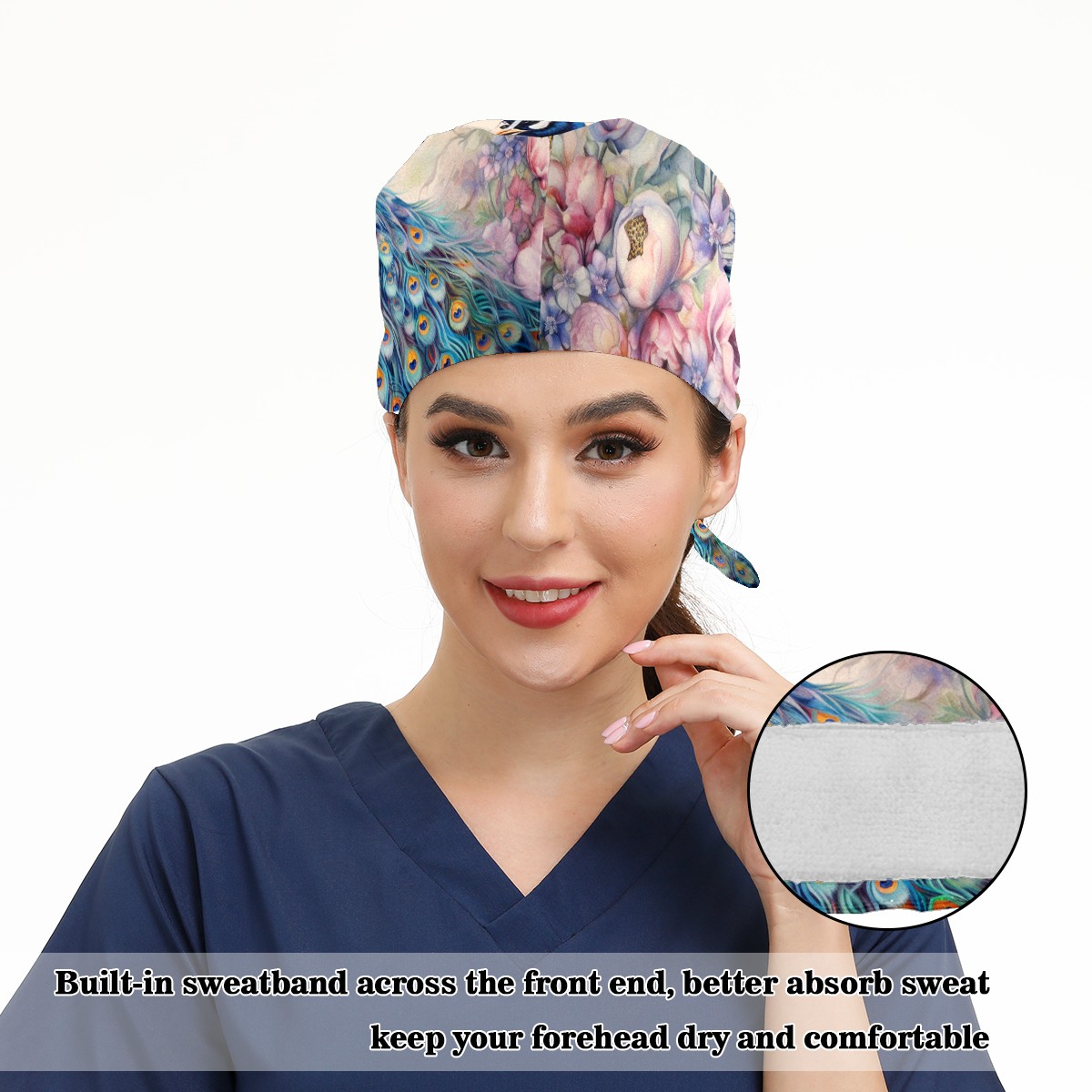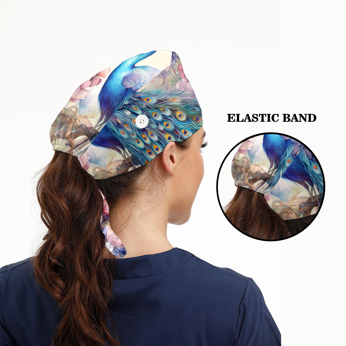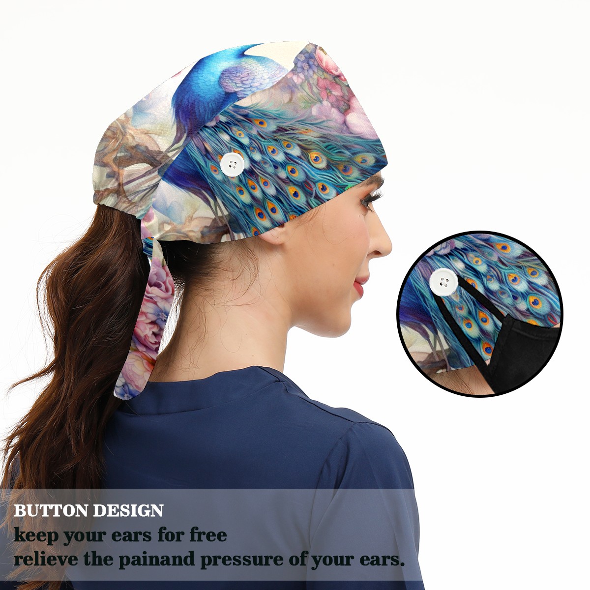 Working Caps with Button & Sweatband Satin Lined Cotton Adjustable Nurse Hats Elastic Band Scrub Cap Surgeon Hat Peacock (18)