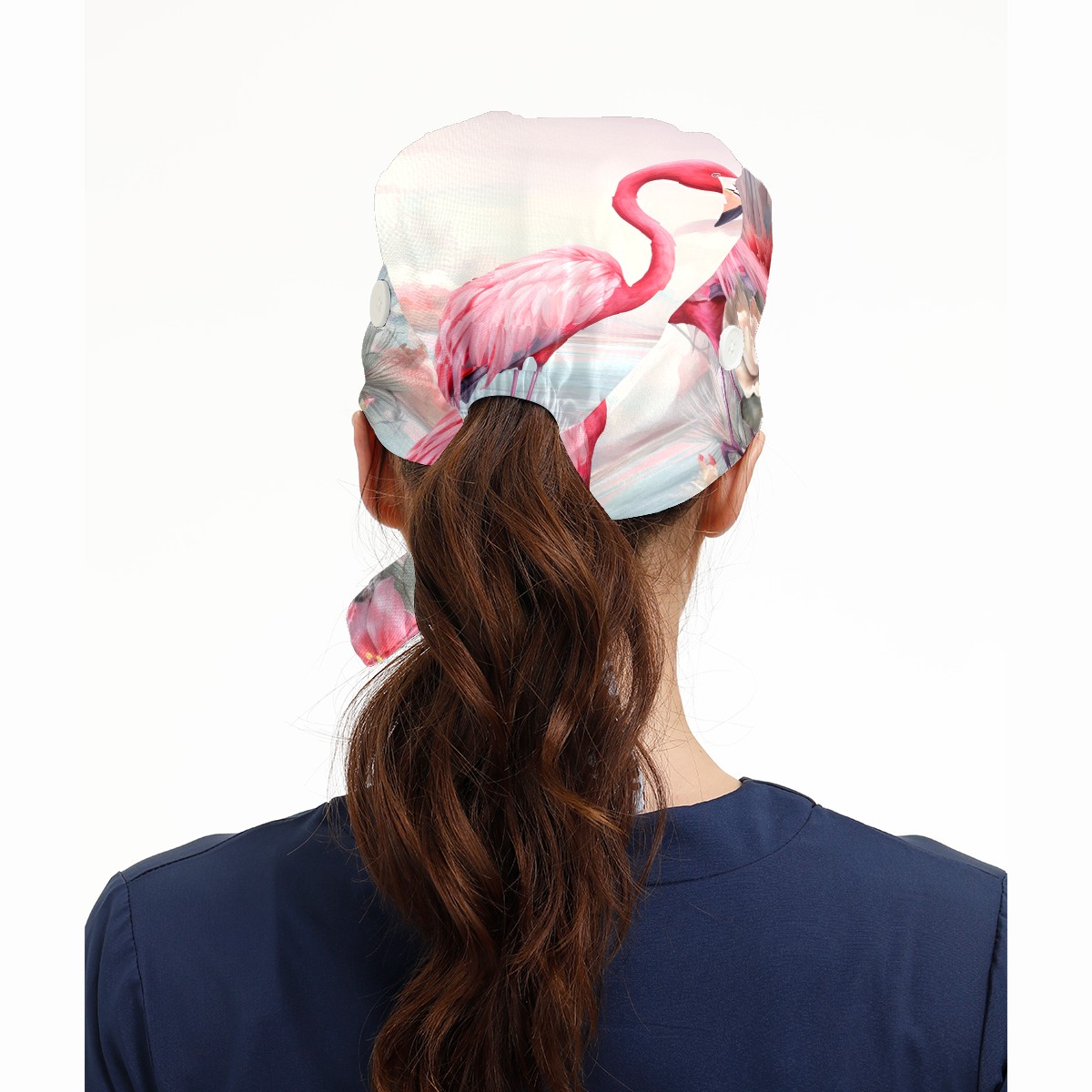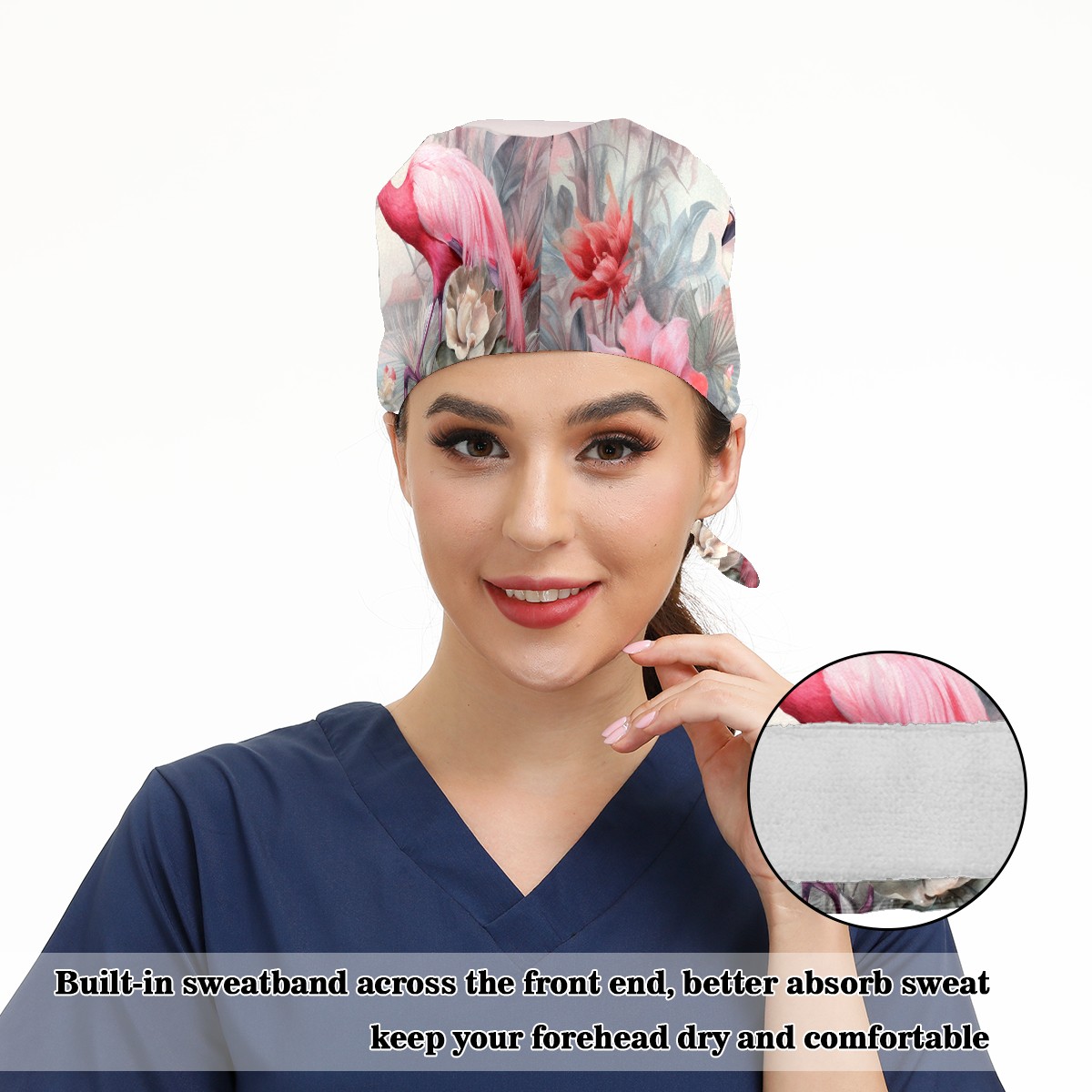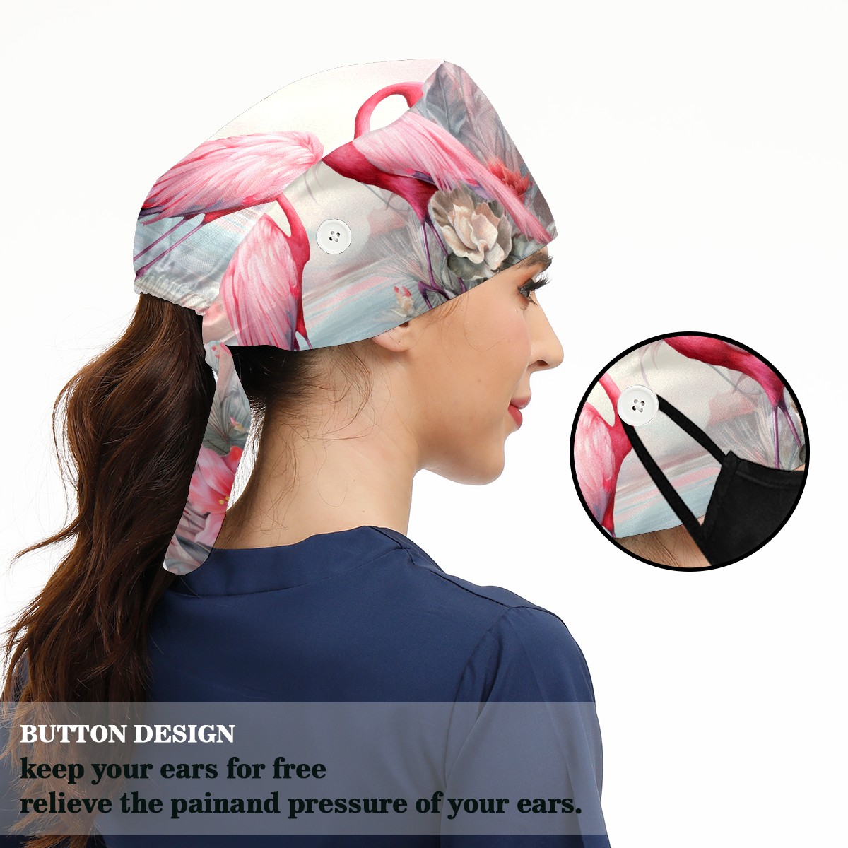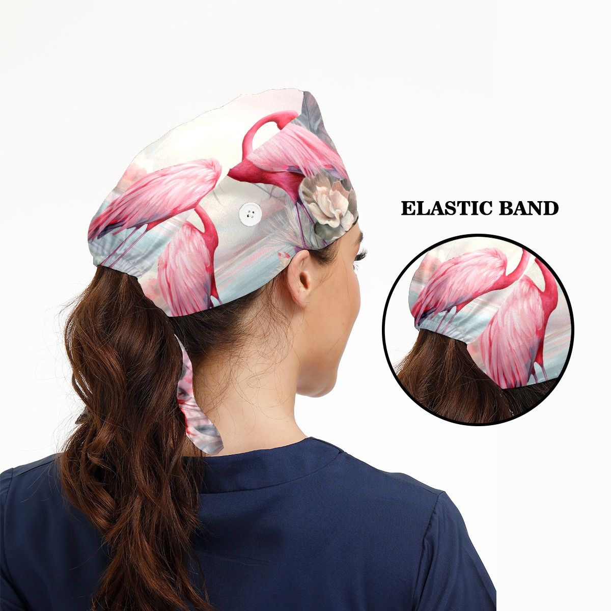 Working Caps with Button & Sweatband Satin Lined Cotton Adjustable Nurse Hats Elastic Band Scrub Cap Surgeon Hat Flamingo (2)