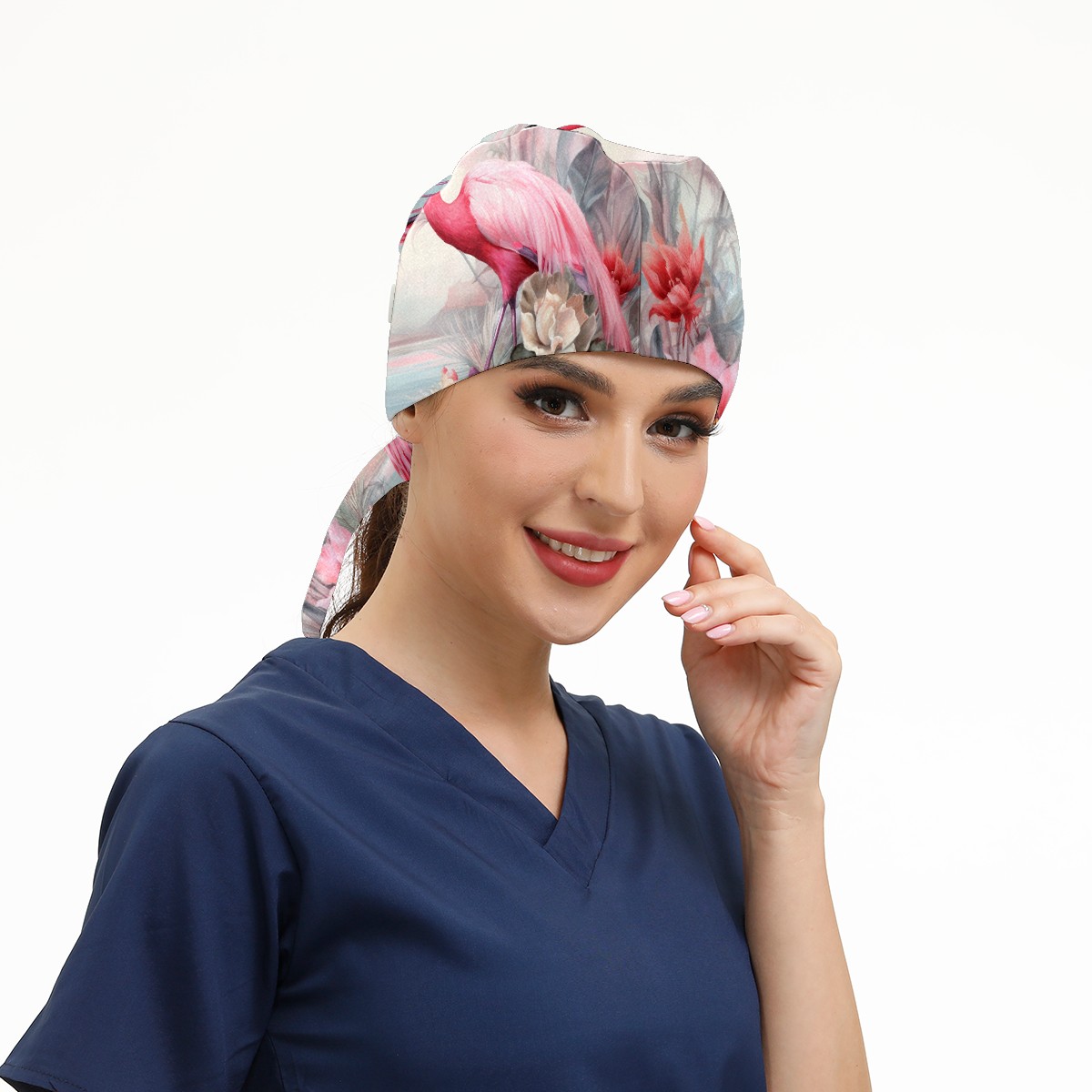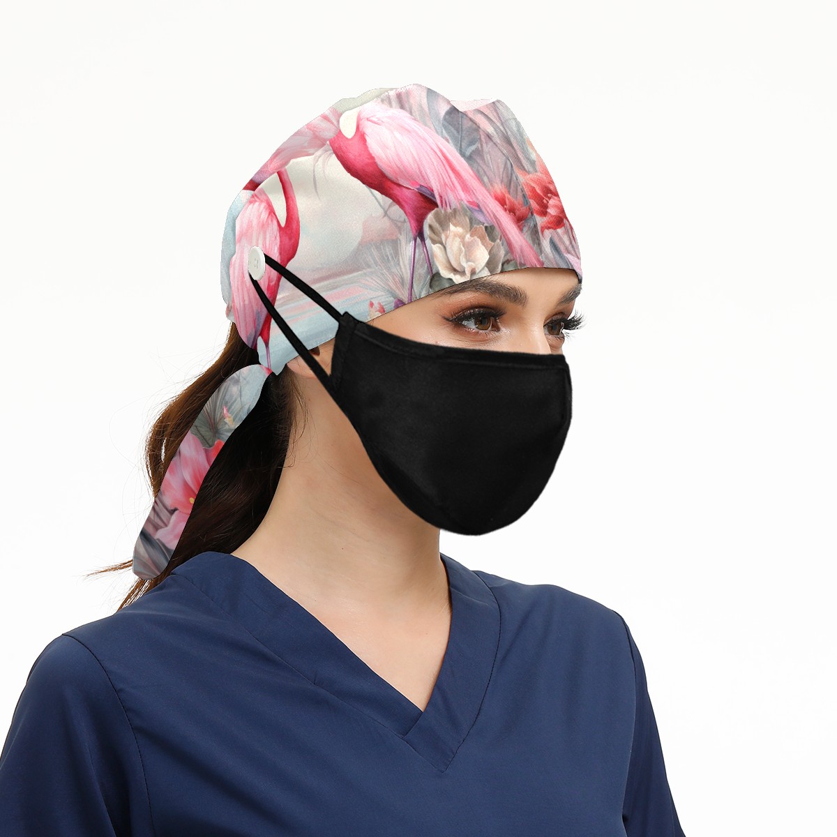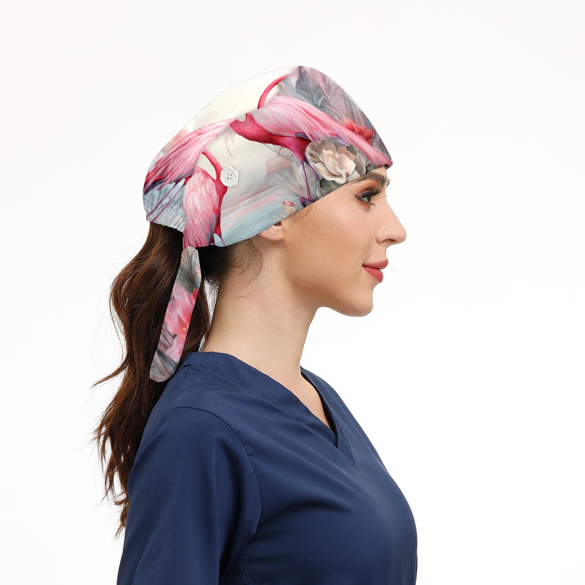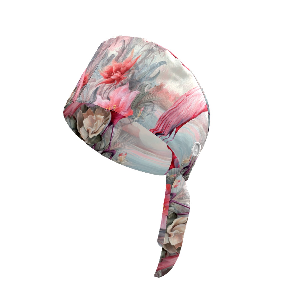 Working Caps with Button & Sweatband Satin Lined Cotton Adjustable Nurse Hats Elastic Band Scrub Cap Surgeon Hat Flamingo (2)