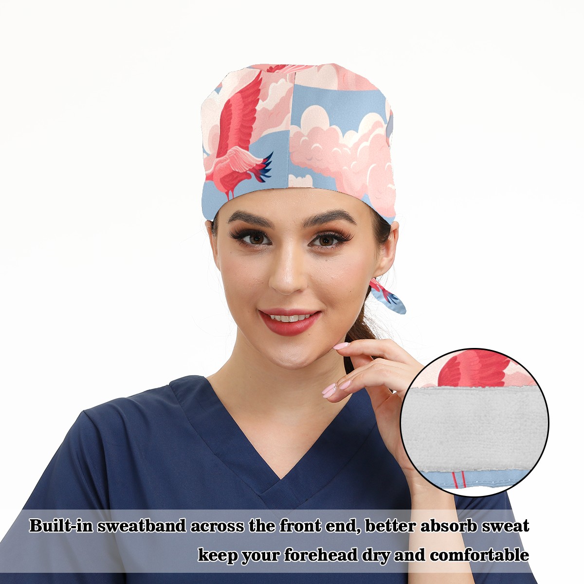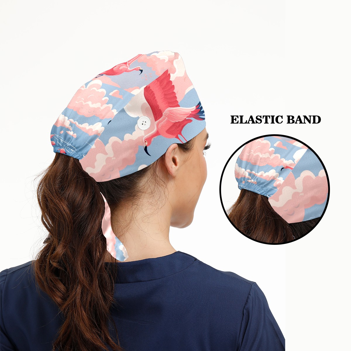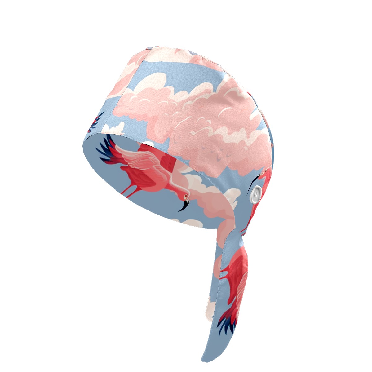 Working Caps with Button & Sweatband Satin Lined Cotton Adjustable Nurse Hats Elastic Band Scrub Cap Surgeon Hat Flamingo (49)