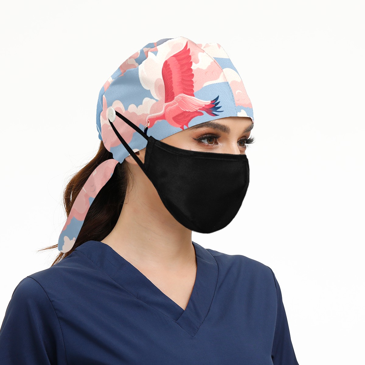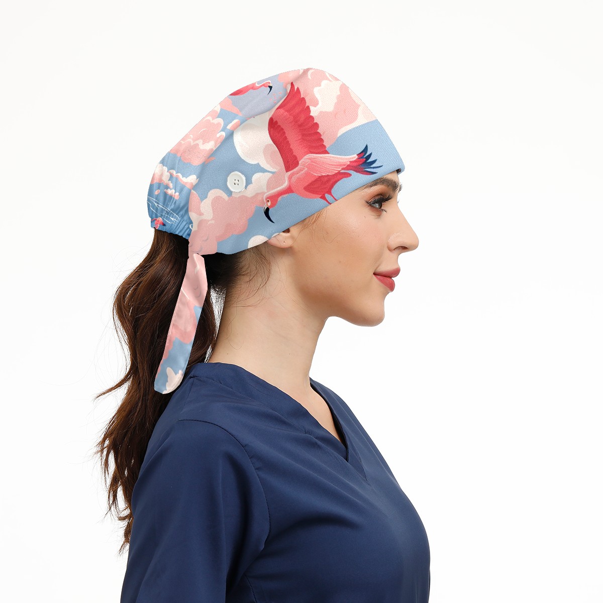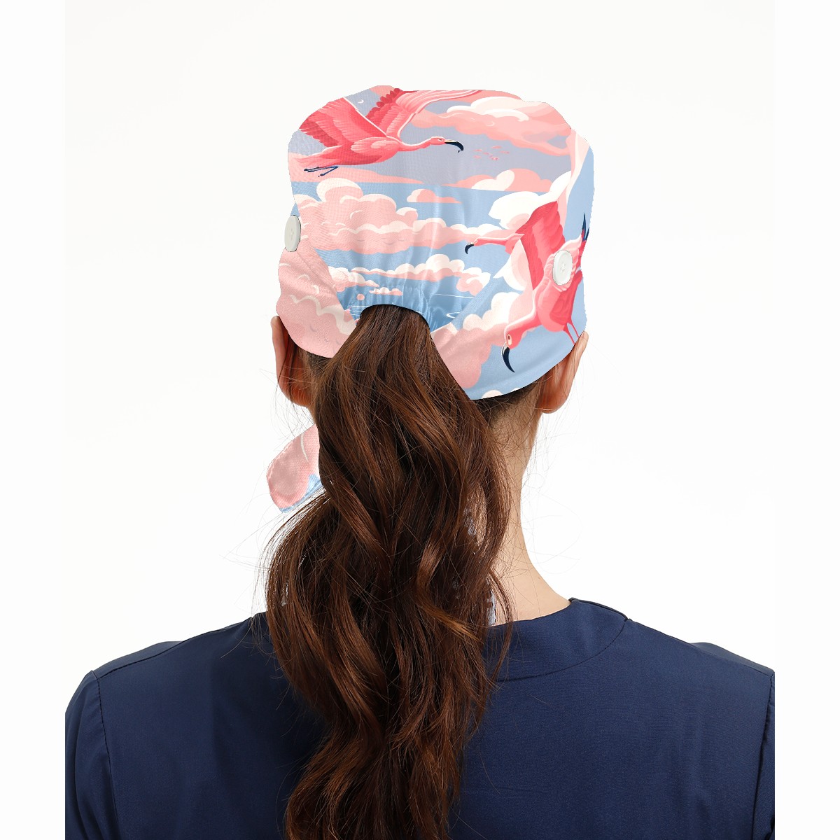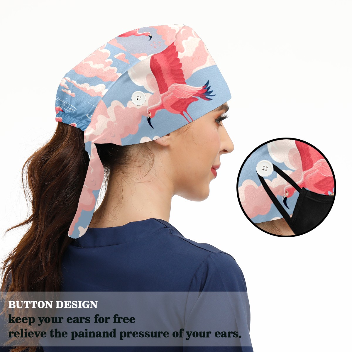 Working Caps with Button & Sweatband Satin Lined Cotton Adjustable Nurse Hats Elastic Band Scrub Cap Surgeon Hat Flamingo (49)