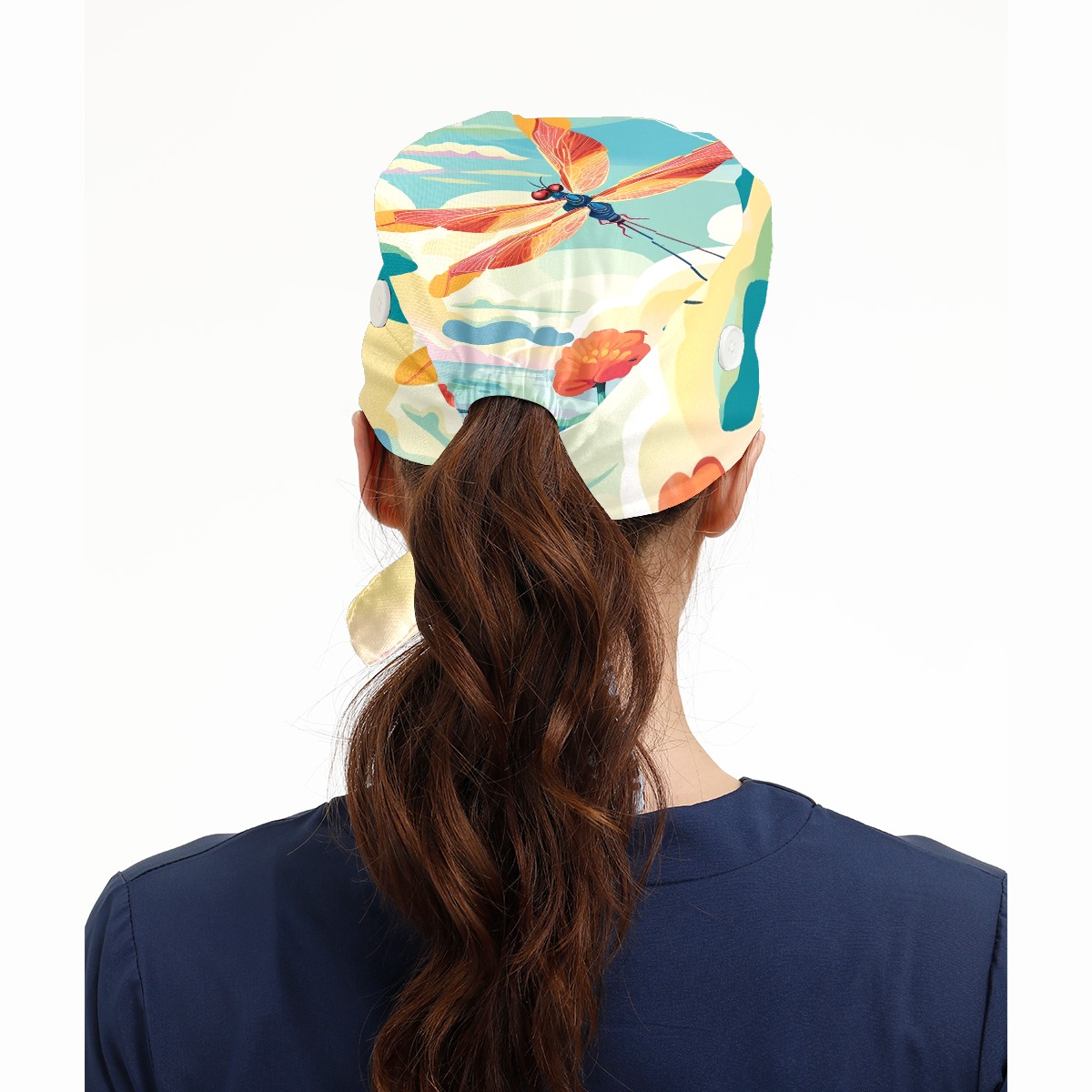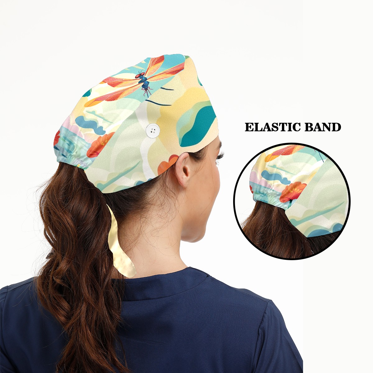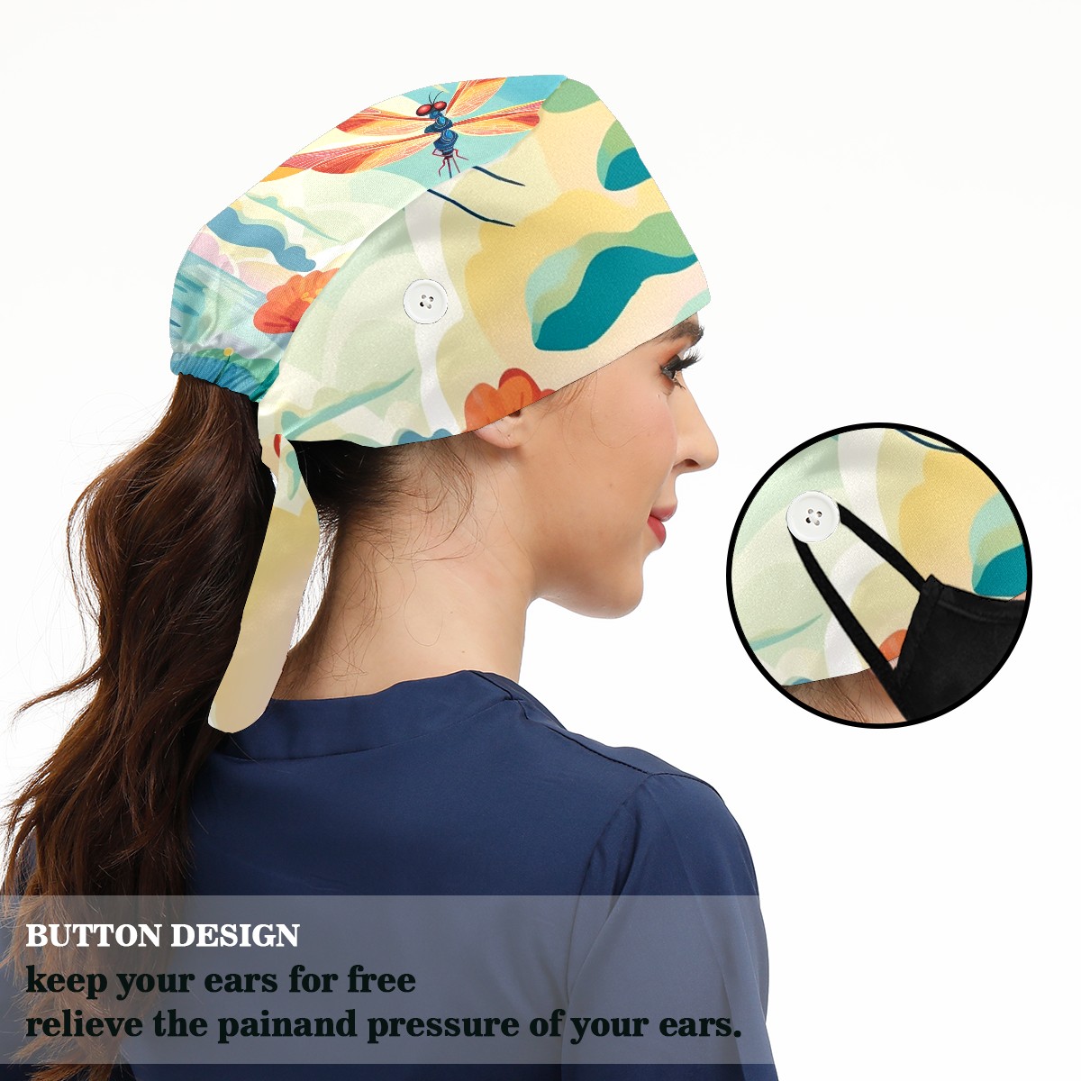 Working Caps with Button & Sweatband Satin Lined Cotton Adjustable Nurse Hats Elastic Band Scrub Cap Surgeon Hat Dragonfly (59)