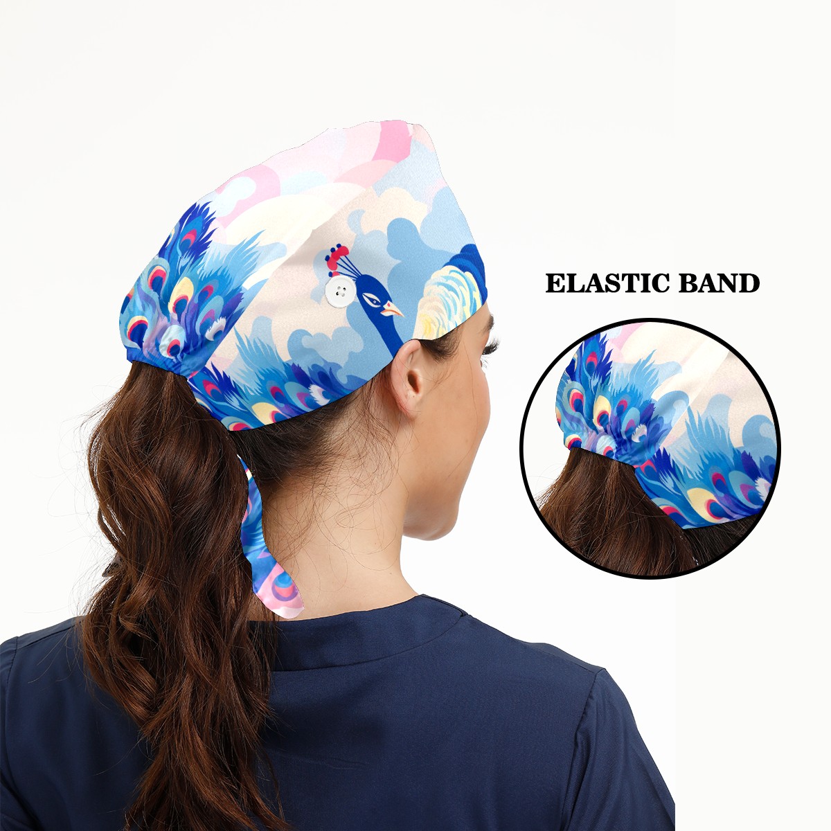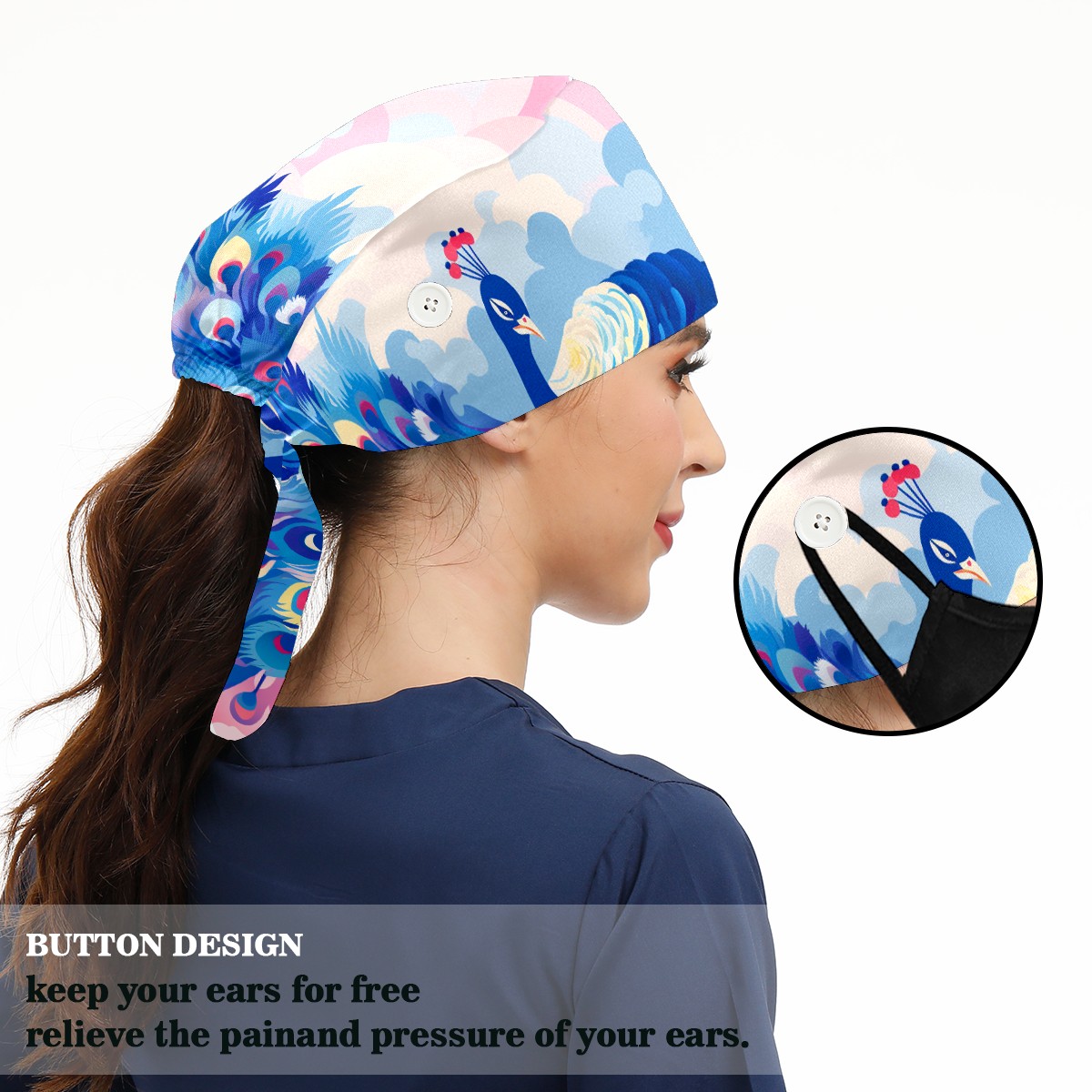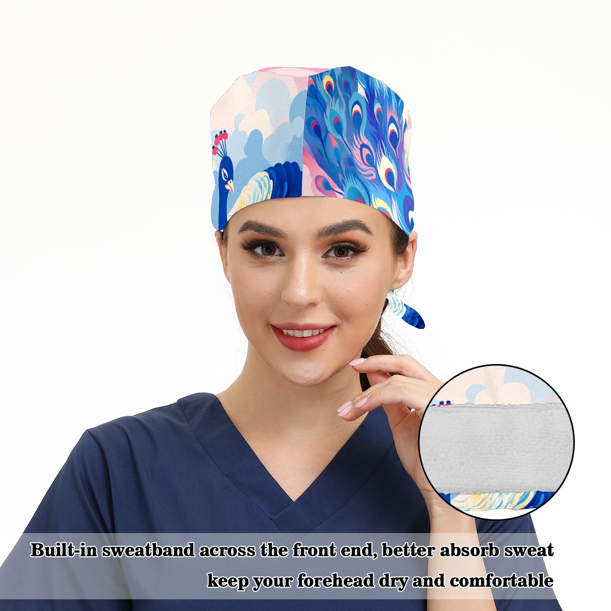 Working Caps with Button & Sweatband Satin Lined Cotton Adjustable Nurse Hats Elastic Band Scrub Cap Surgeon Hat Peacock (5)