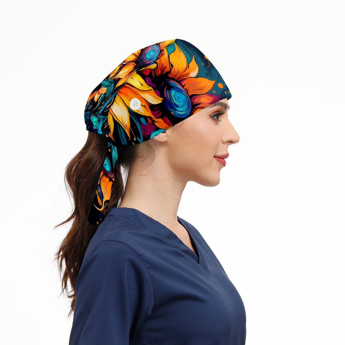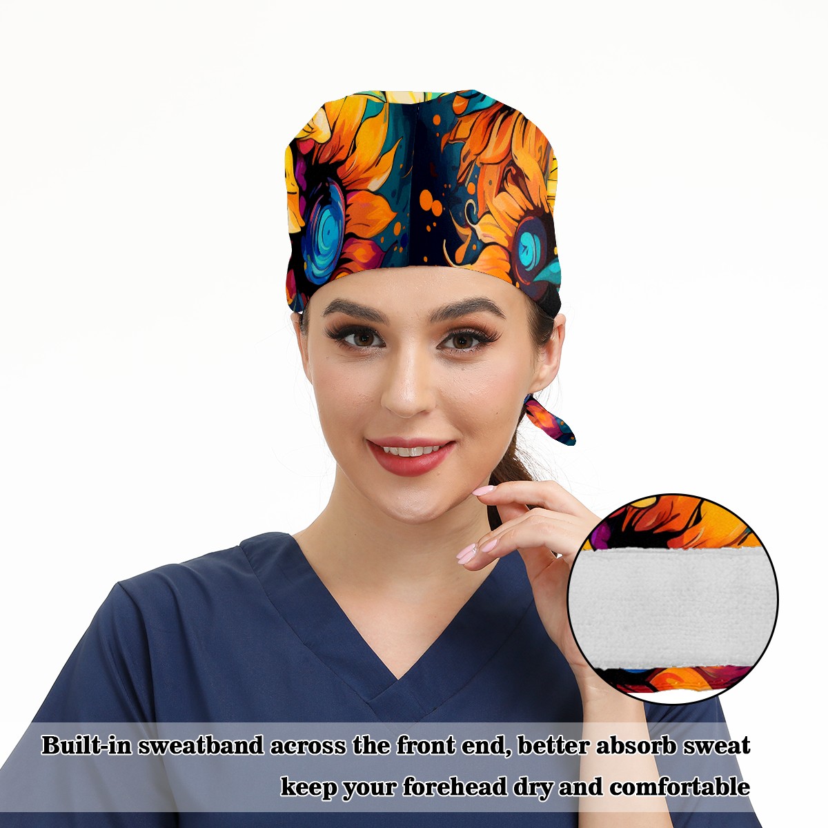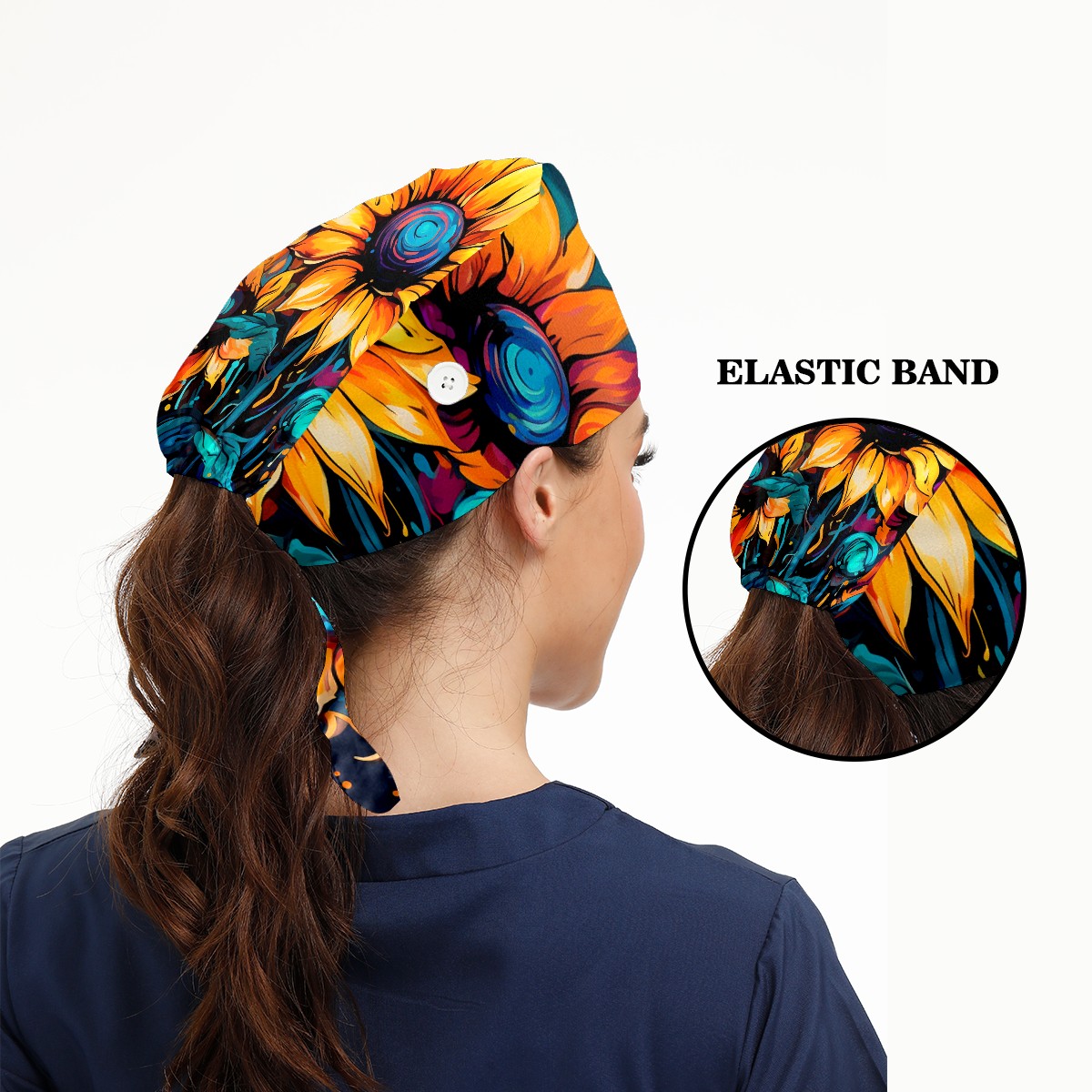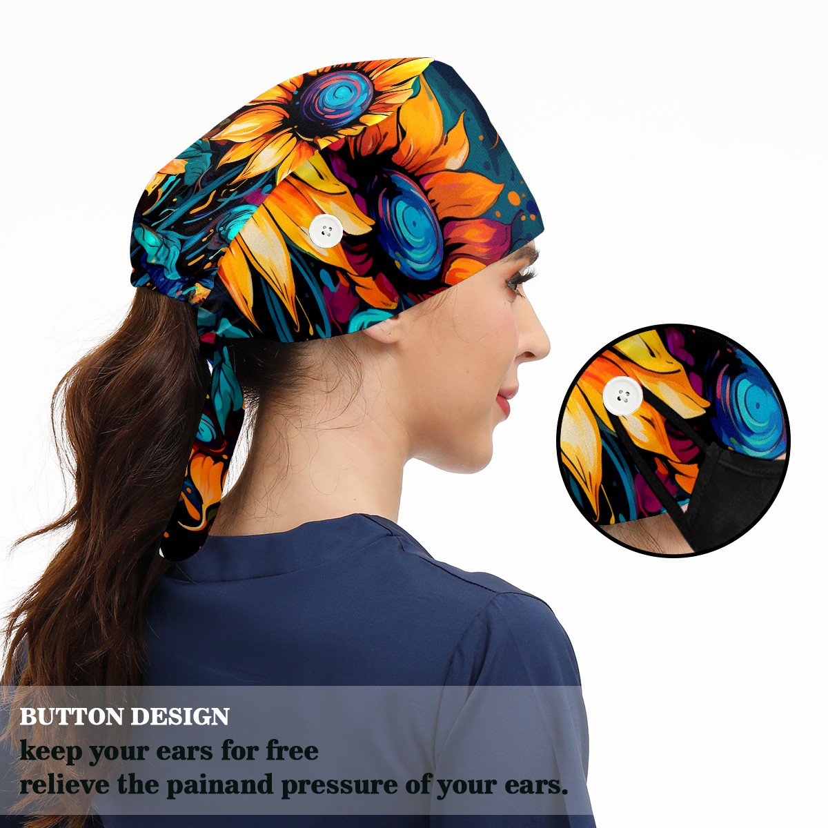 Working Caps with Button & Sweatband Satin Lined Cotton Adjustable Nurse Hats Elastic Band Scrub Cap Surgeon Hat Sunflower (9)