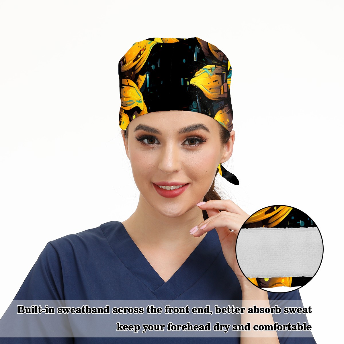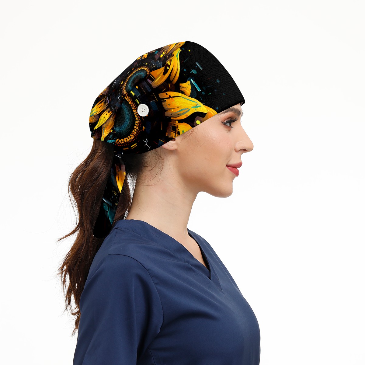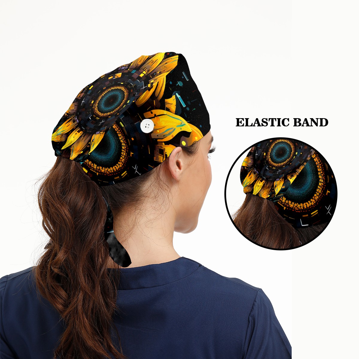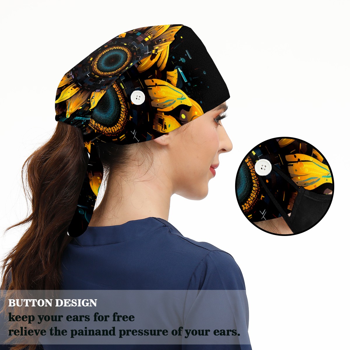 Working Caps with Button & Sweatband Satin Lined Cotton Adjustable Nurse Hats Elastic Band Scrub Cap Surgeon Hat Sunflower (52)
