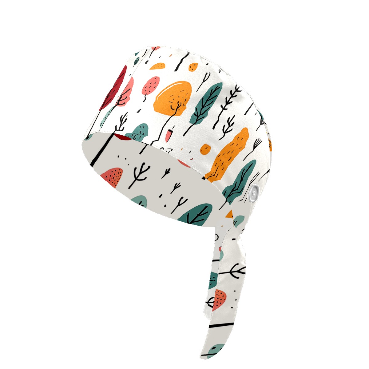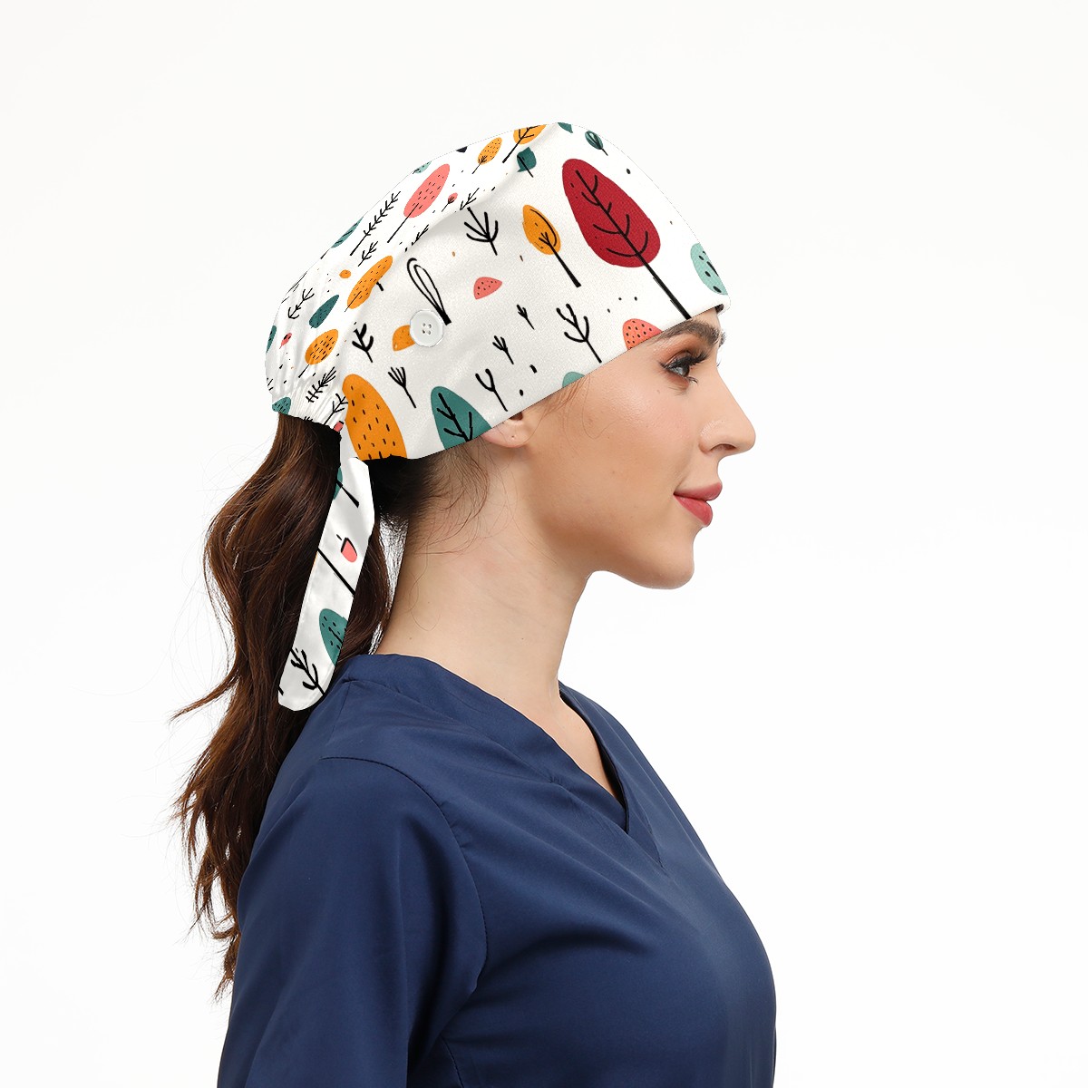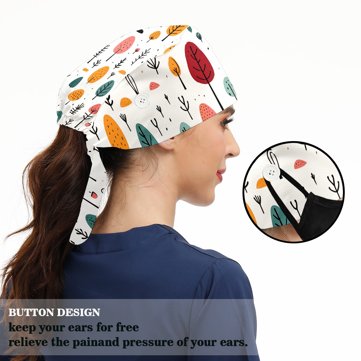 Working Caps with Button & Sweatband Satin Lined Cotton Adjustable Nurse Hats Elastic Band Scrub Cap Surgeon Hat Doodle Tree
