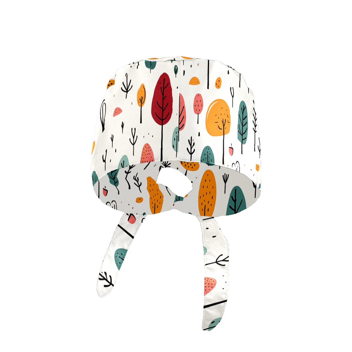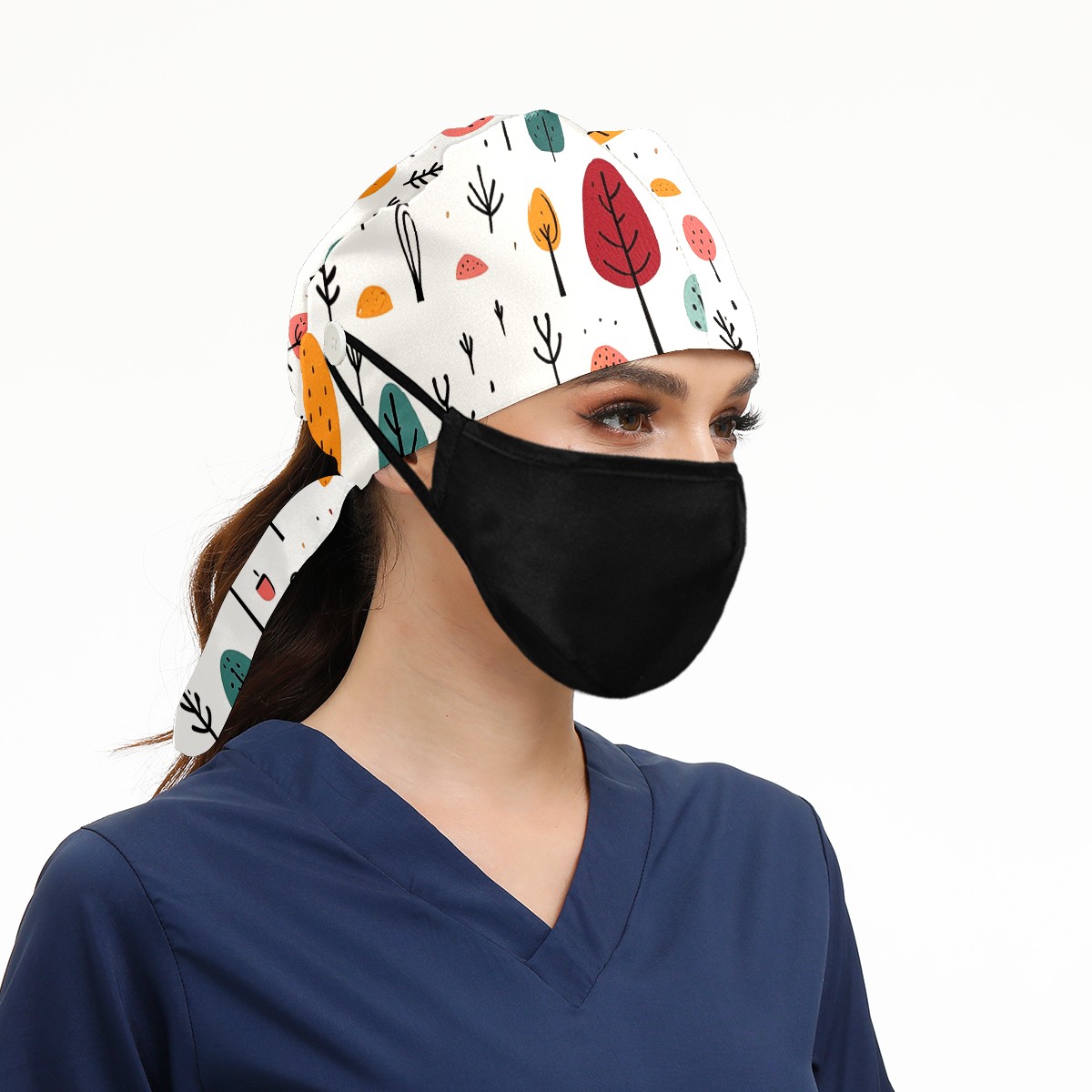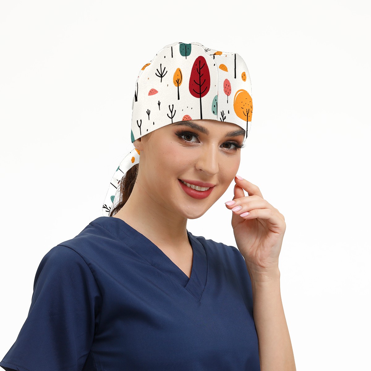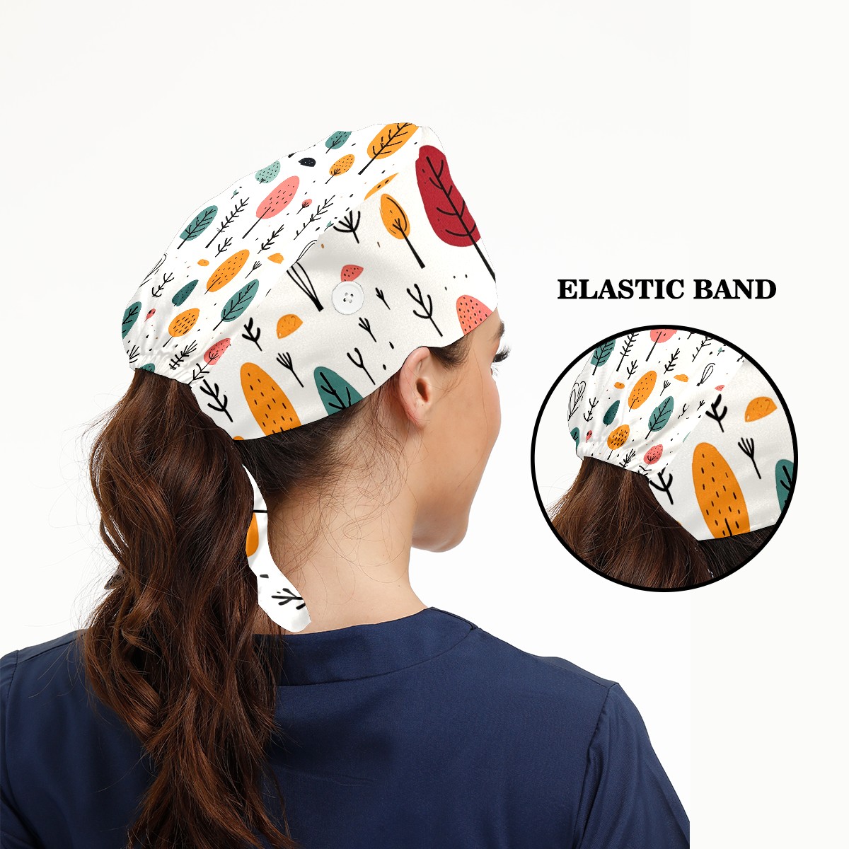 Working Caps with Button & Sweatband Satin Lined Cotton Adjustable Nurse Hats Elastic Band Scrub Cap Surgeon Hat Doodle Tree