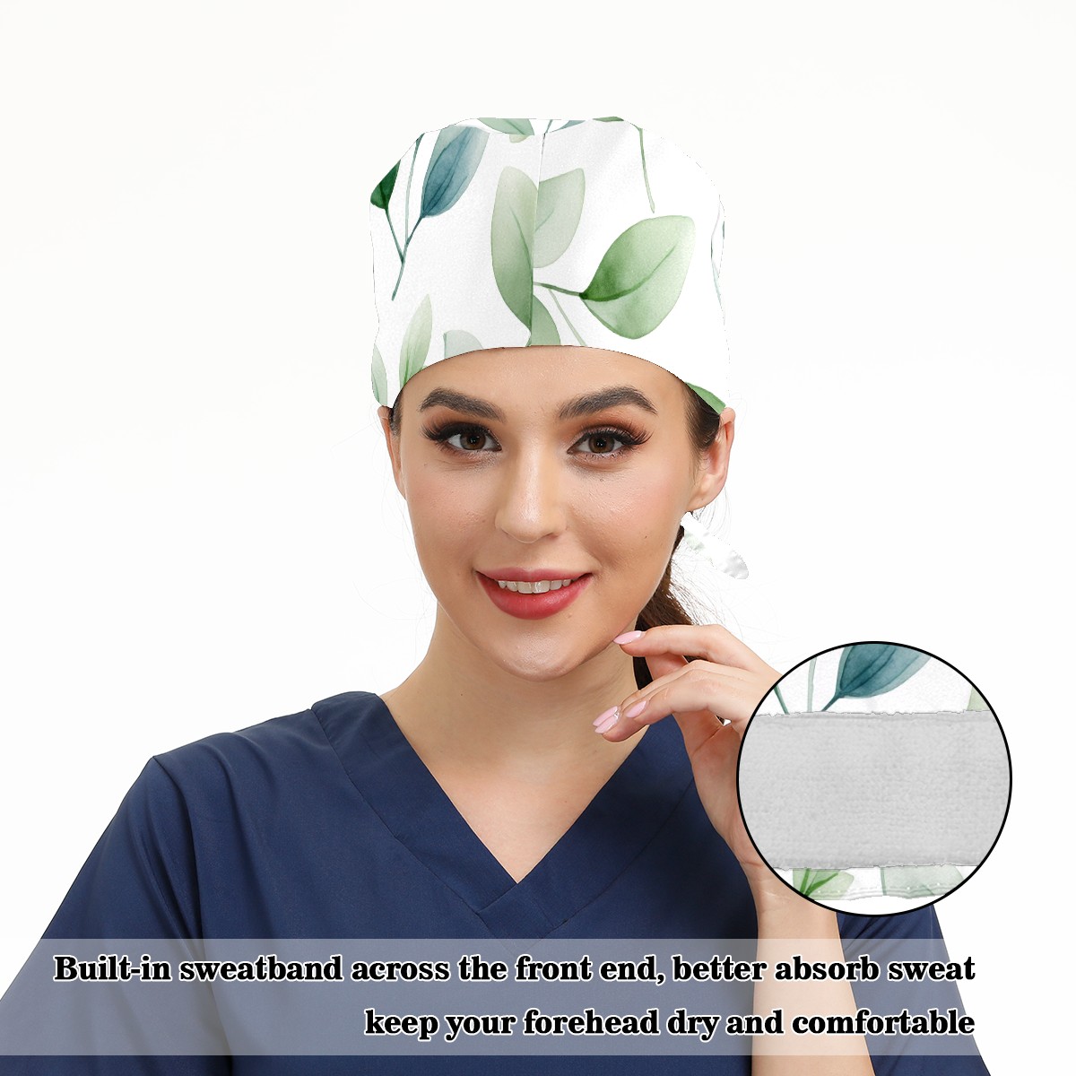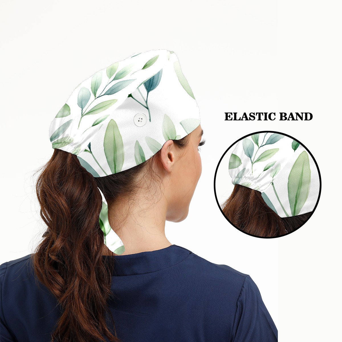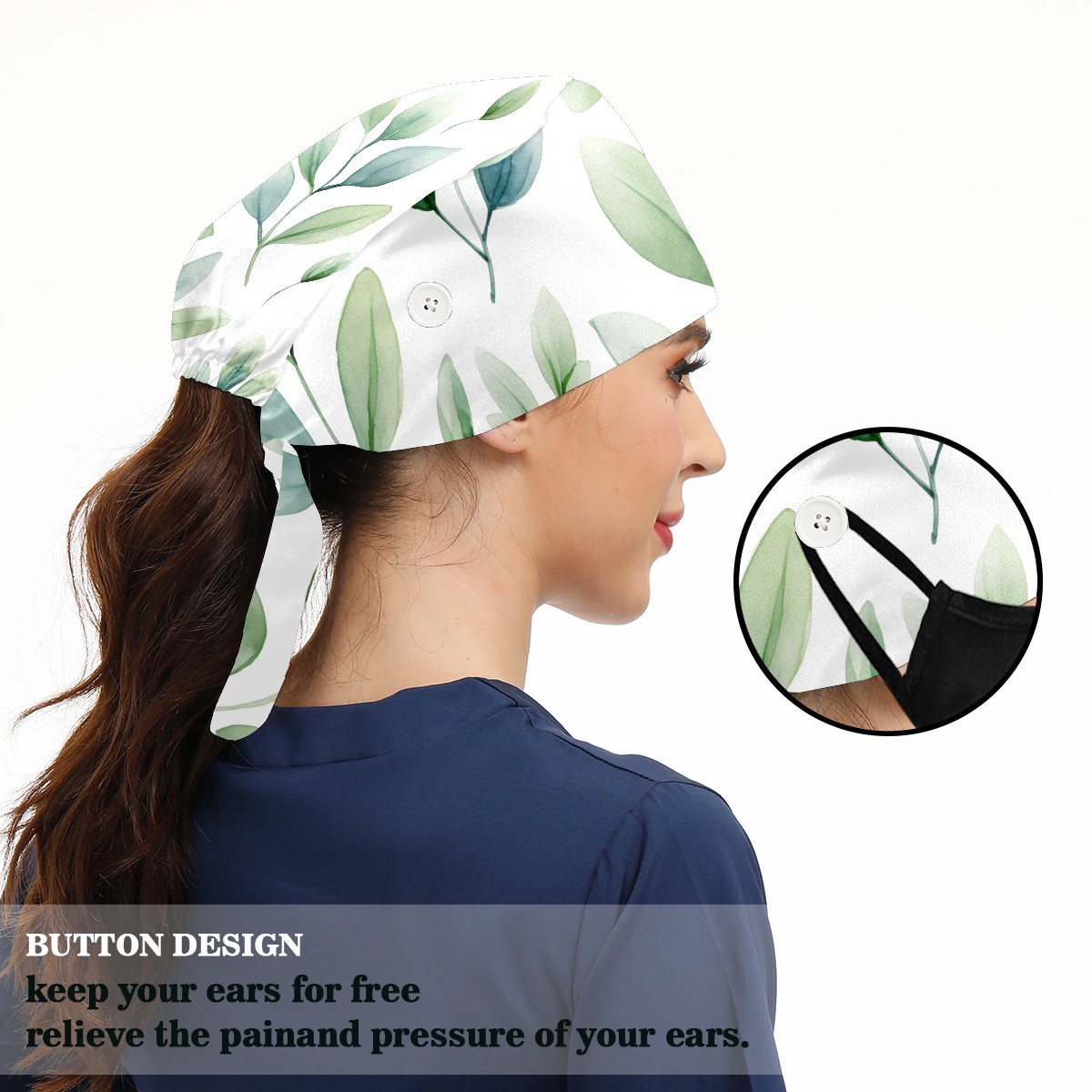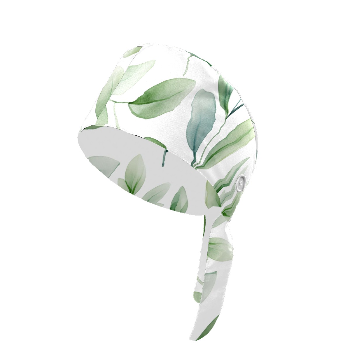 Working Caps with Button & Sweatband Satin Lined Cotton Adjustable Nurse Hats Elastic Band Scrub Cap Surgeon Hat Watercolor Green Leaves