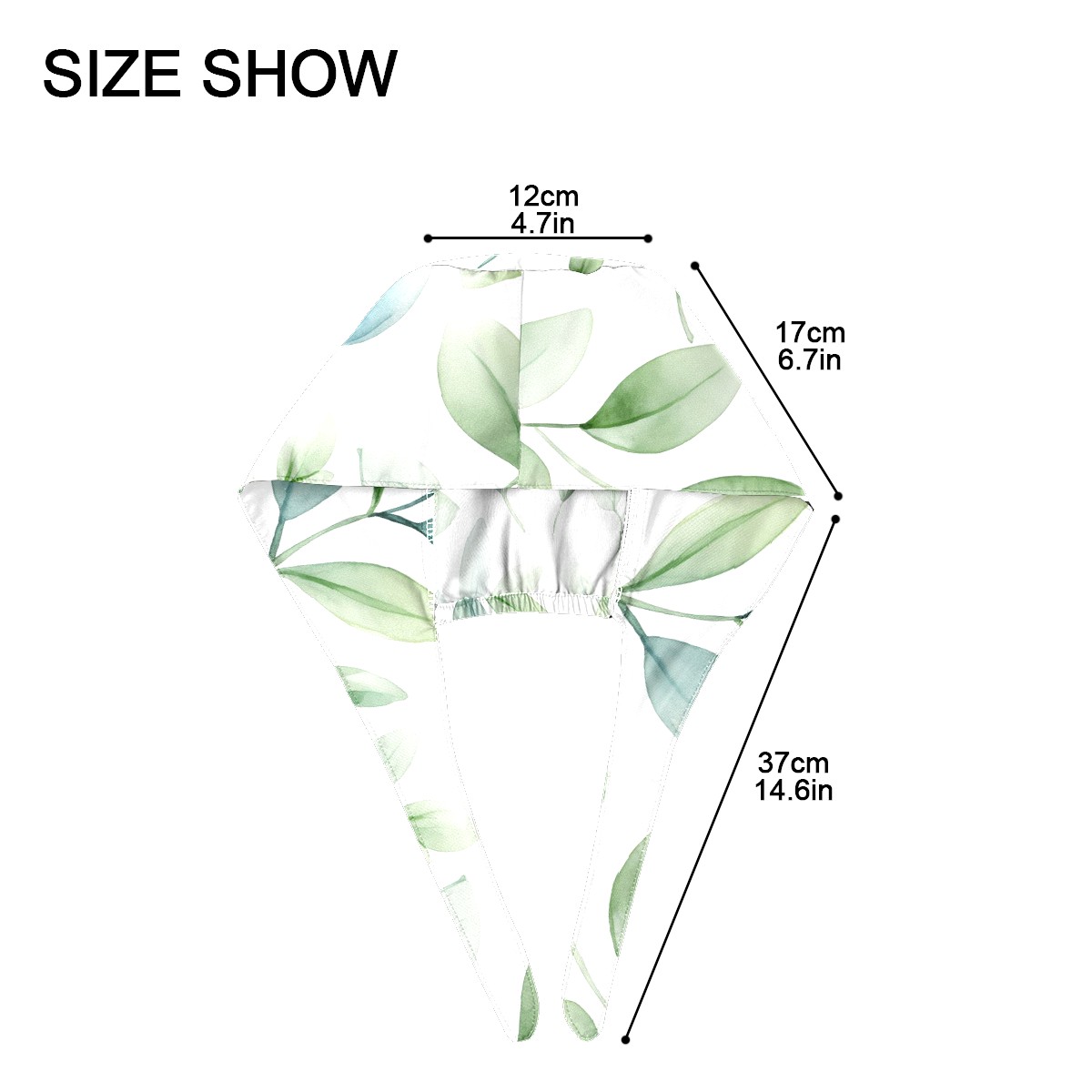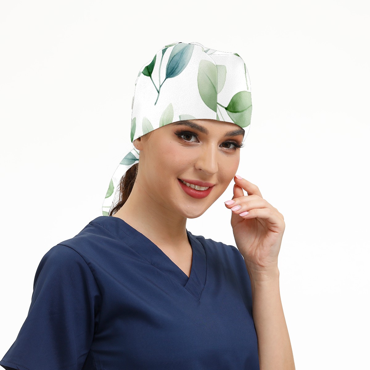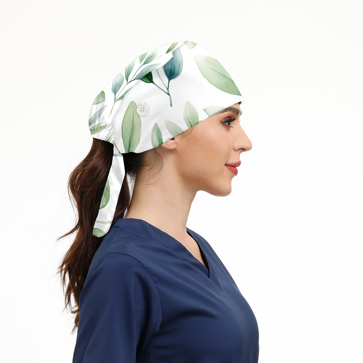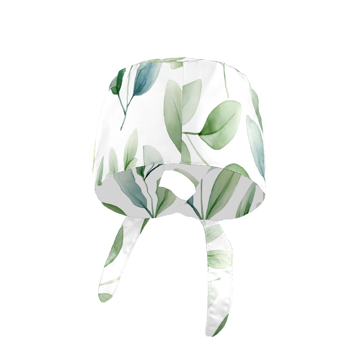Working Caps with Button & Sweatband Satin Lined Cotton Adjustable Nurse Hats Elastic Band Scrub Cap Surgeon Hat Watercolor Green Leaves