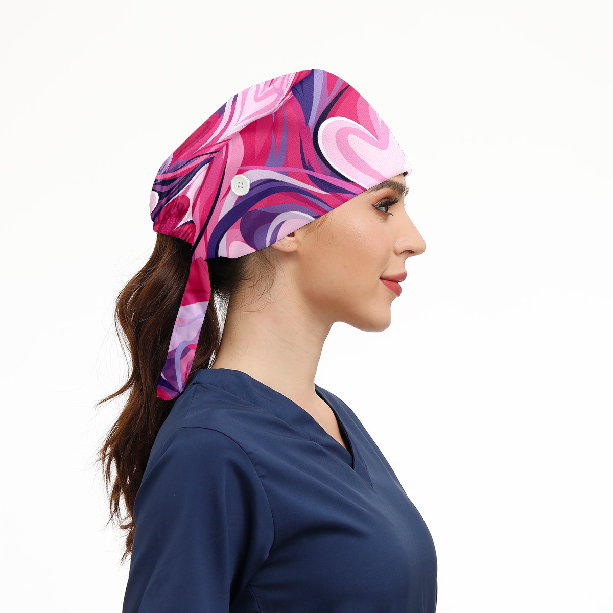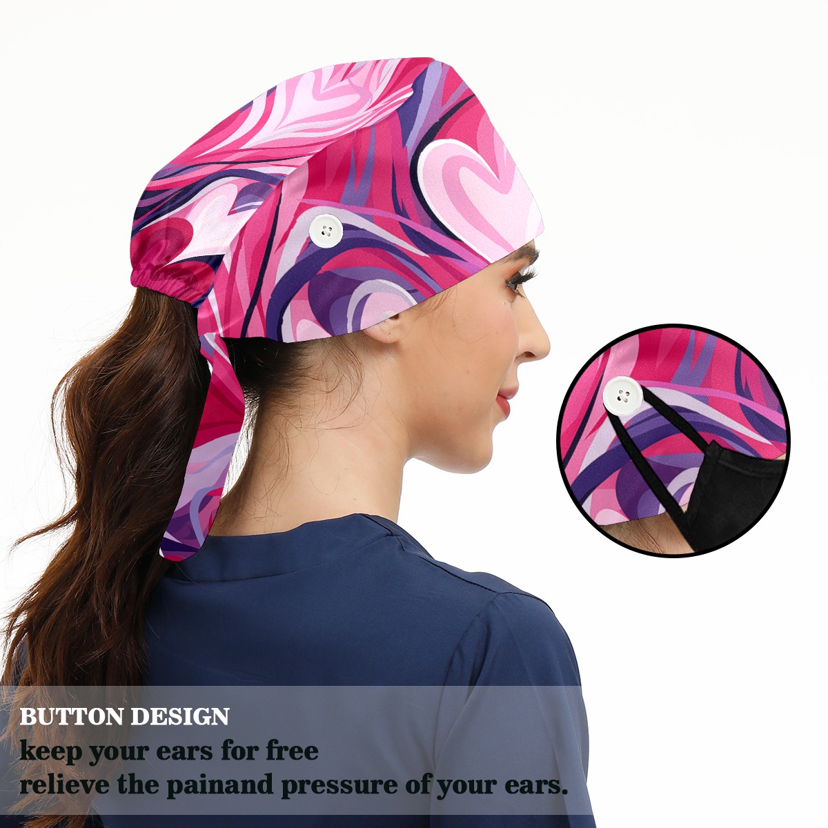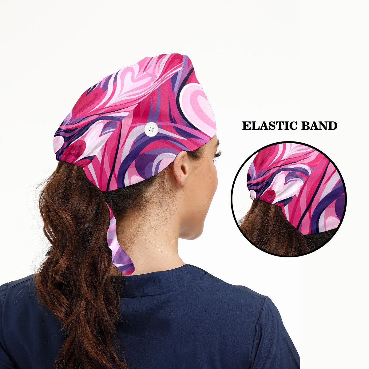 Working Caps with Button & Sweatband Satin Lined Cotton Adjustable Nurse Hats Elastic Band Scrub Cap Surgeon Hat Pink Heart Valentine