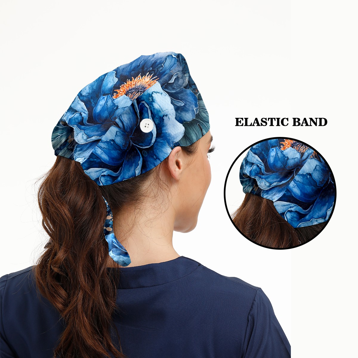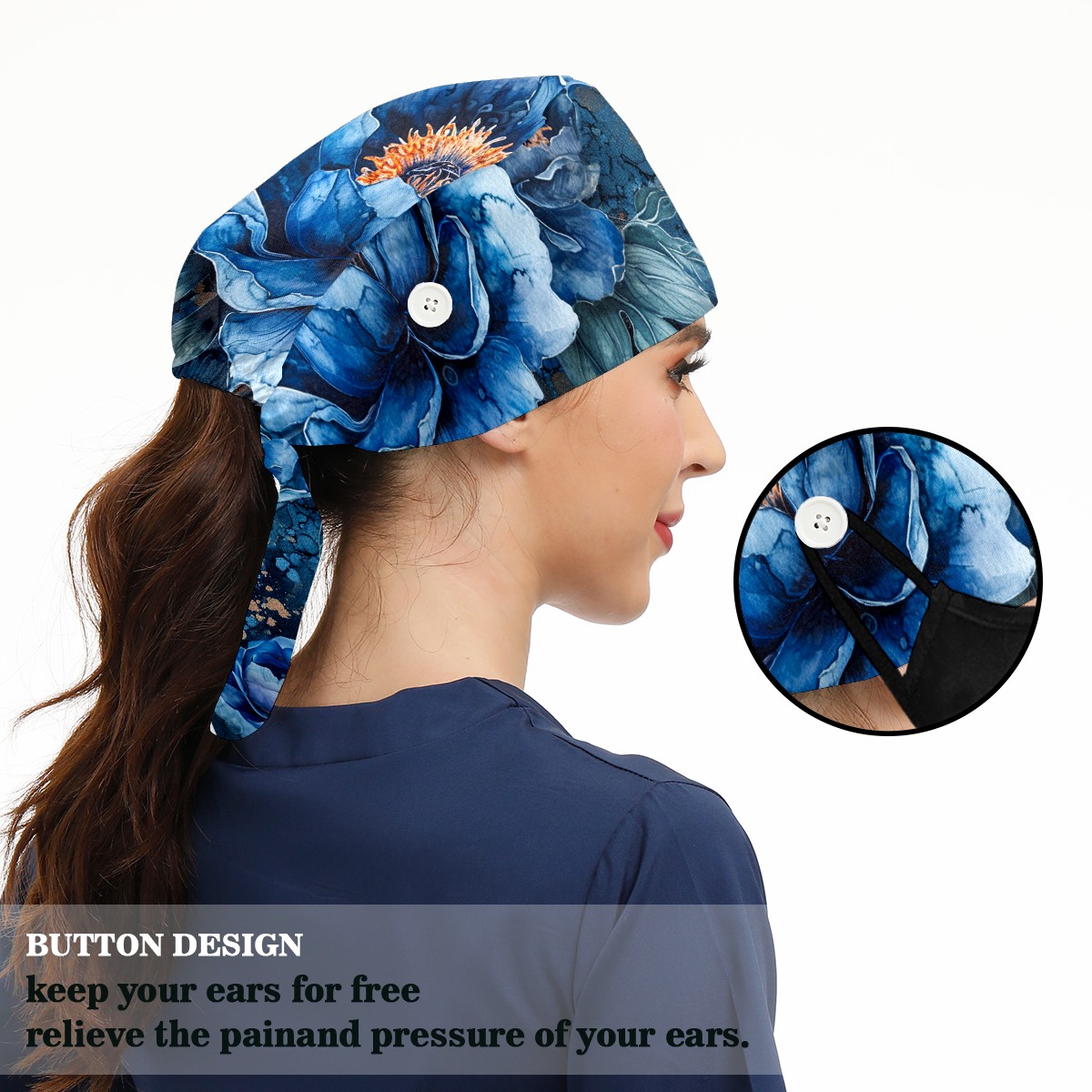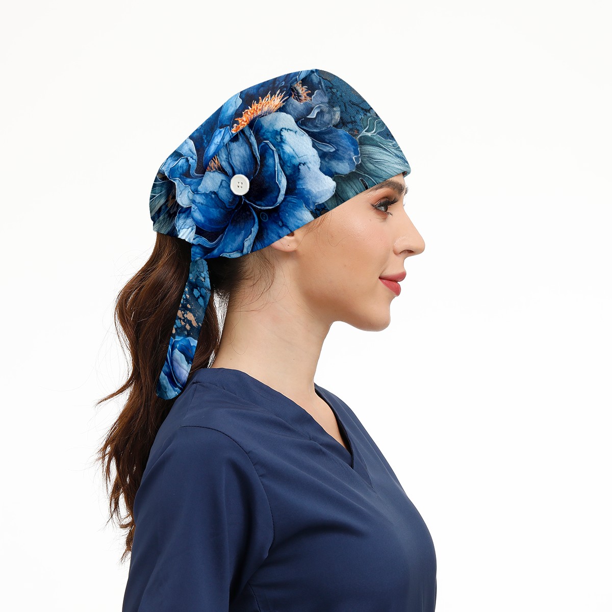 Working Caps with Button & Sweatband Satin Lined Cotton Adjustable Nurse Hats Elastic Band Scrub Cap Surgeon Hat Peony