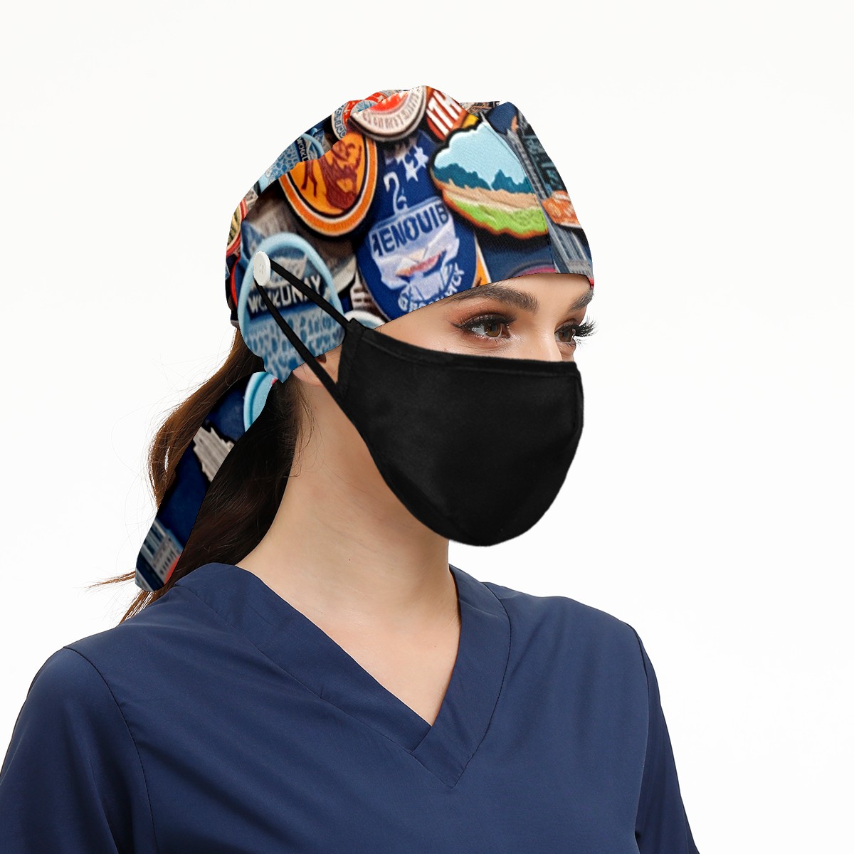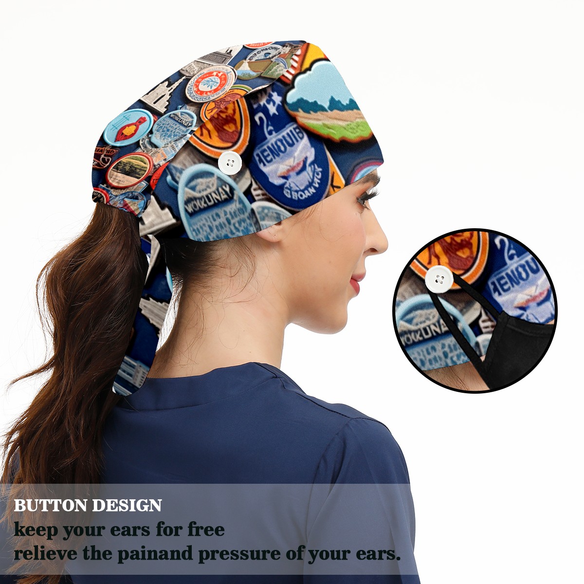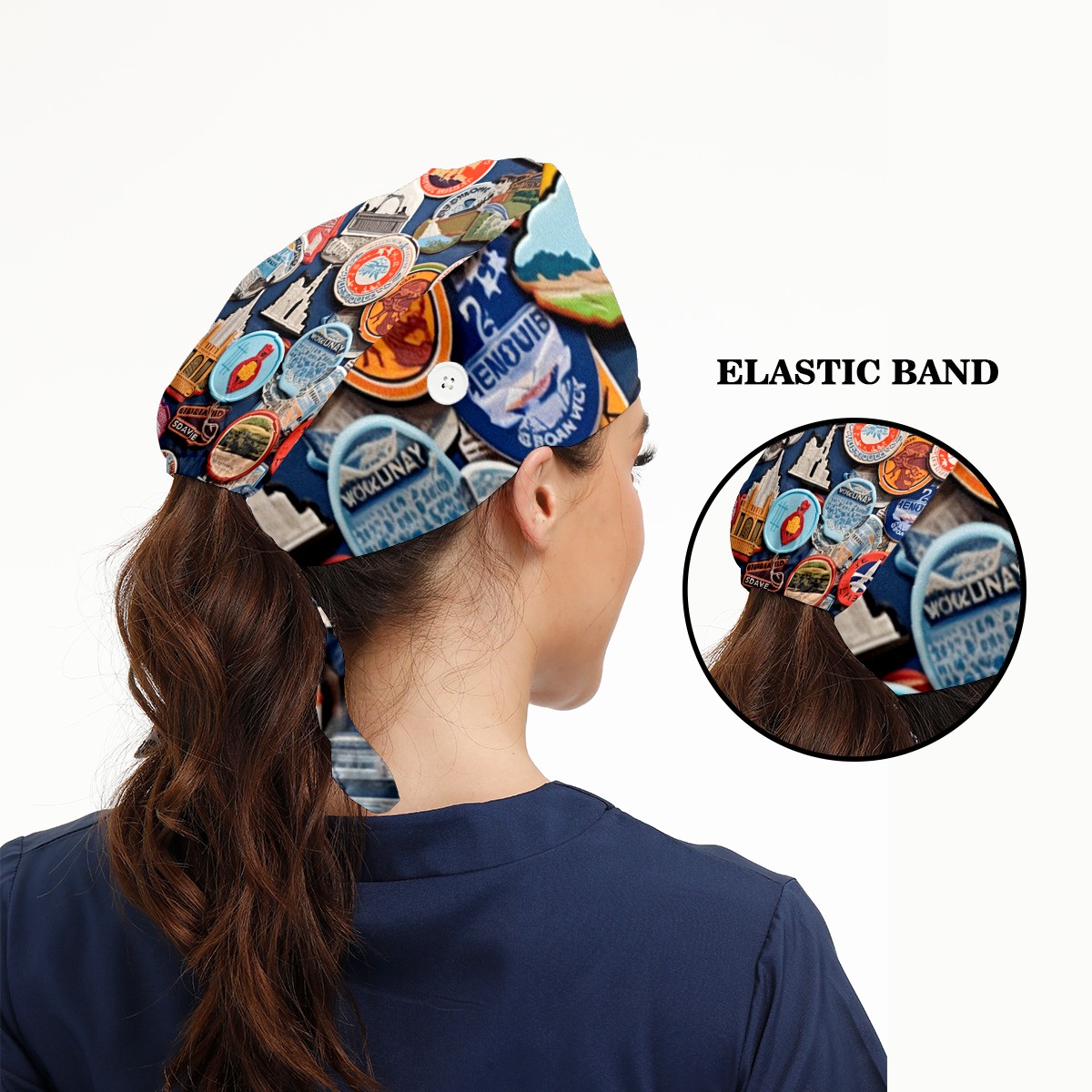 Working Caps with Button & Sweatband Satin Lined Cotton Adjustable Nurse Hats Elastic Band Scrub Cap Surgeon Hat Colorful Travel Sticker (8)