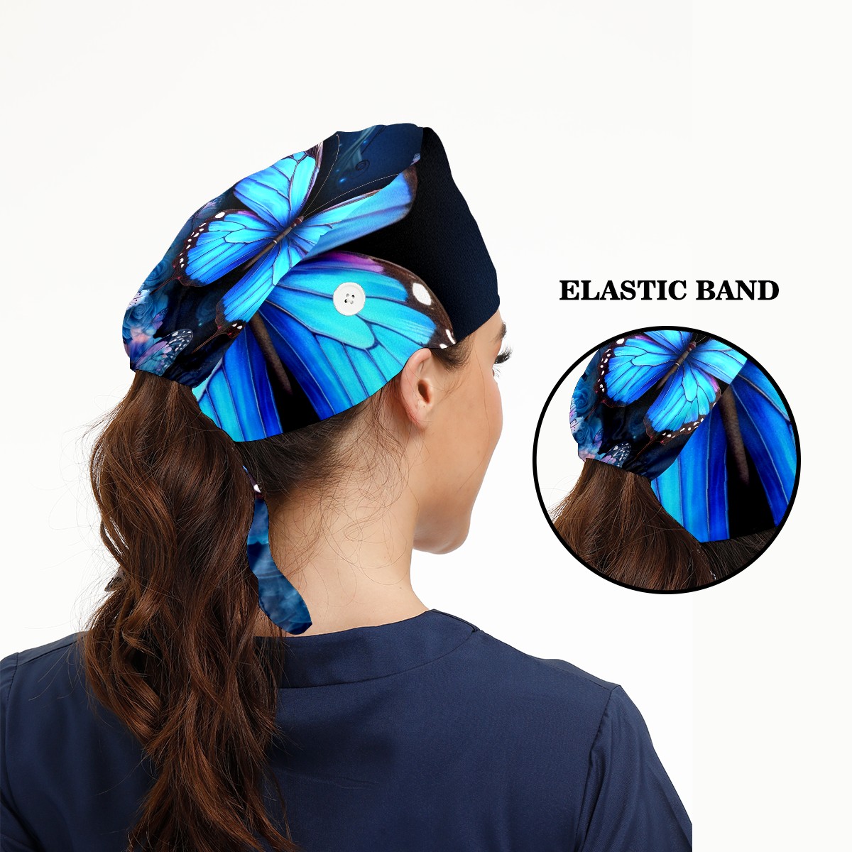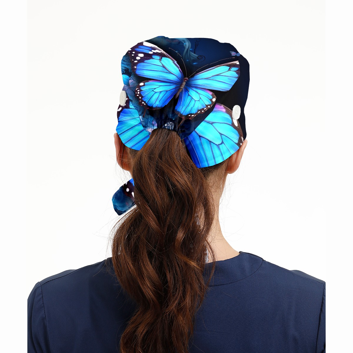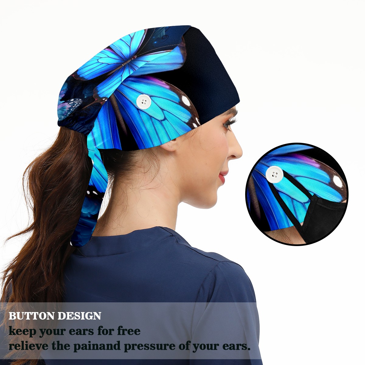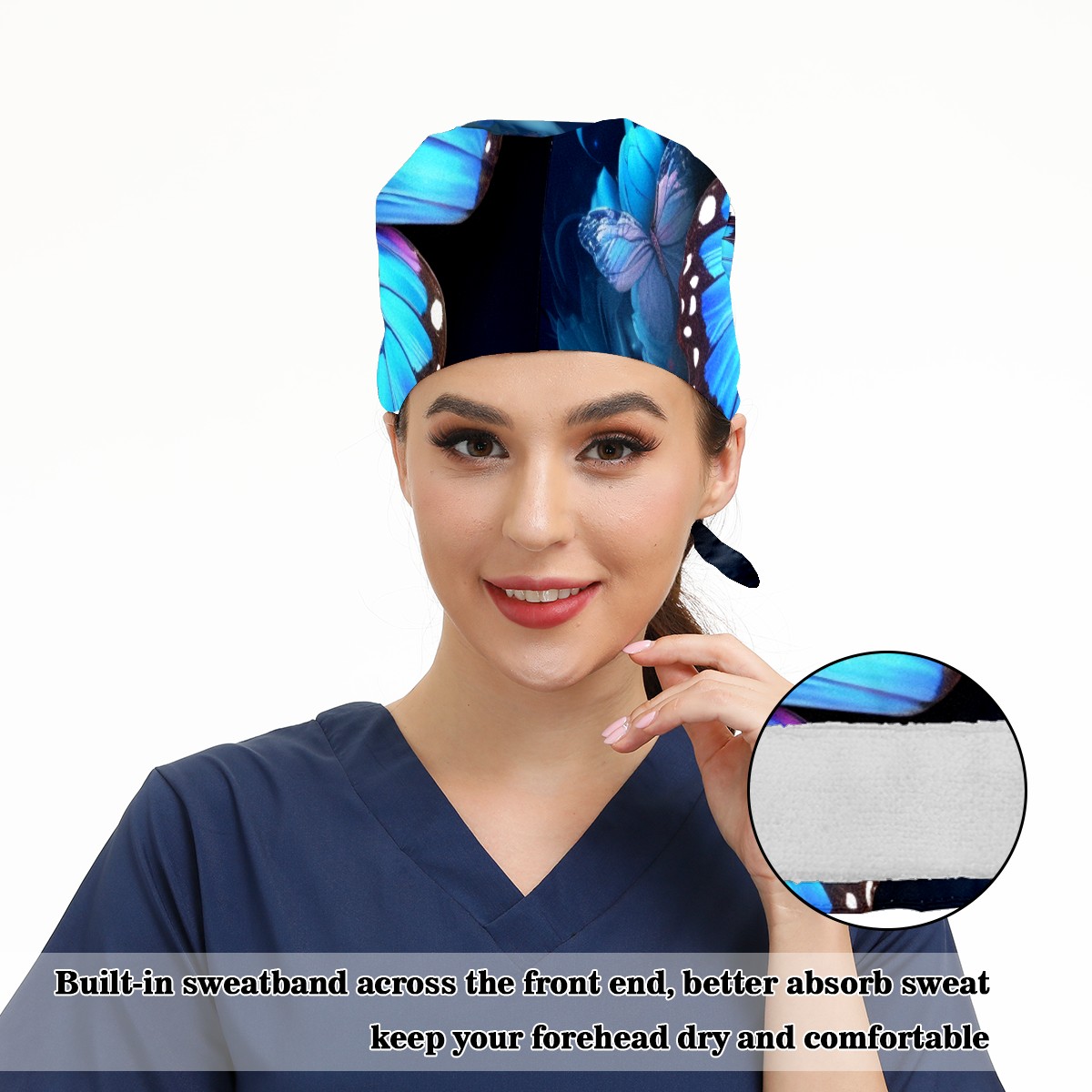Working Caps with Button & Sweatband Satin Lined Cotton Adjustable Nurse Hats Elastic Band Scrub Cap Surgeon Hat Blue Butterflies And Flower (3)