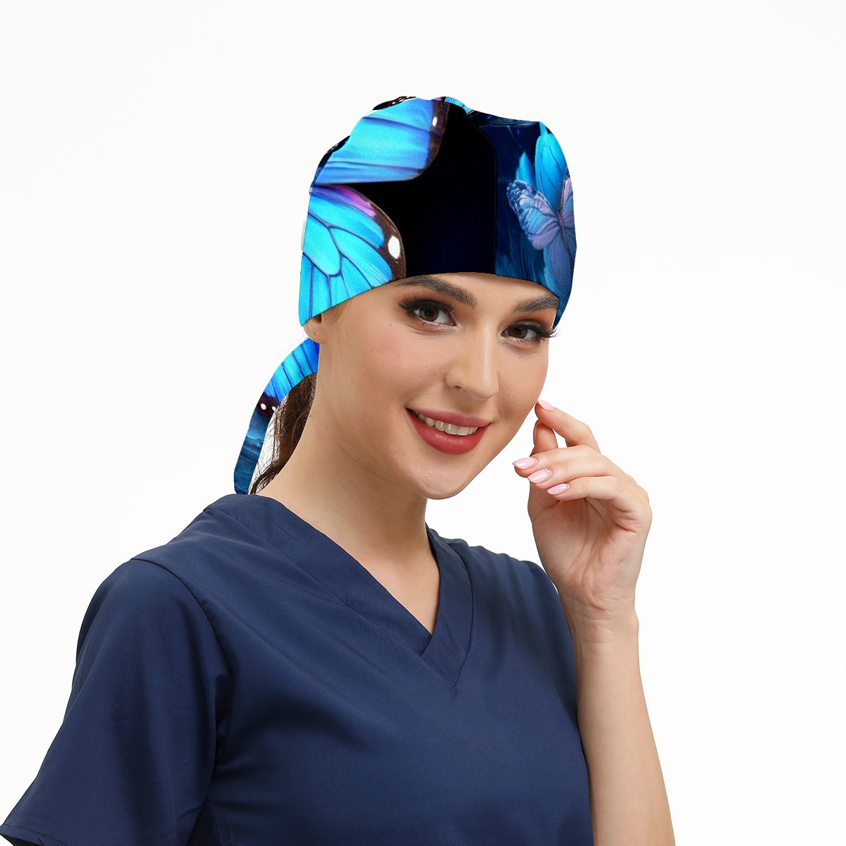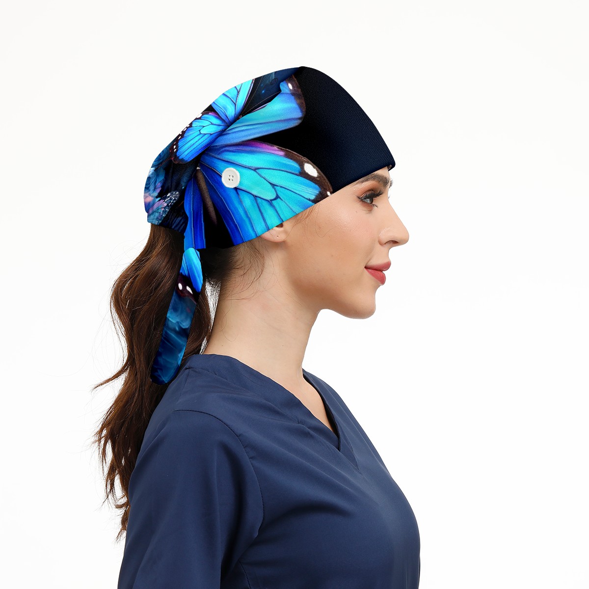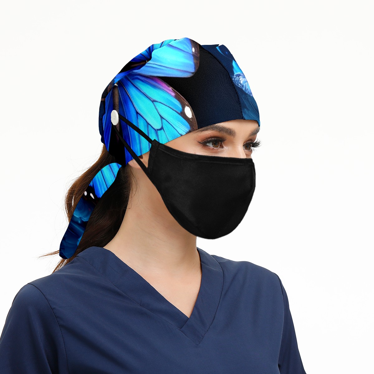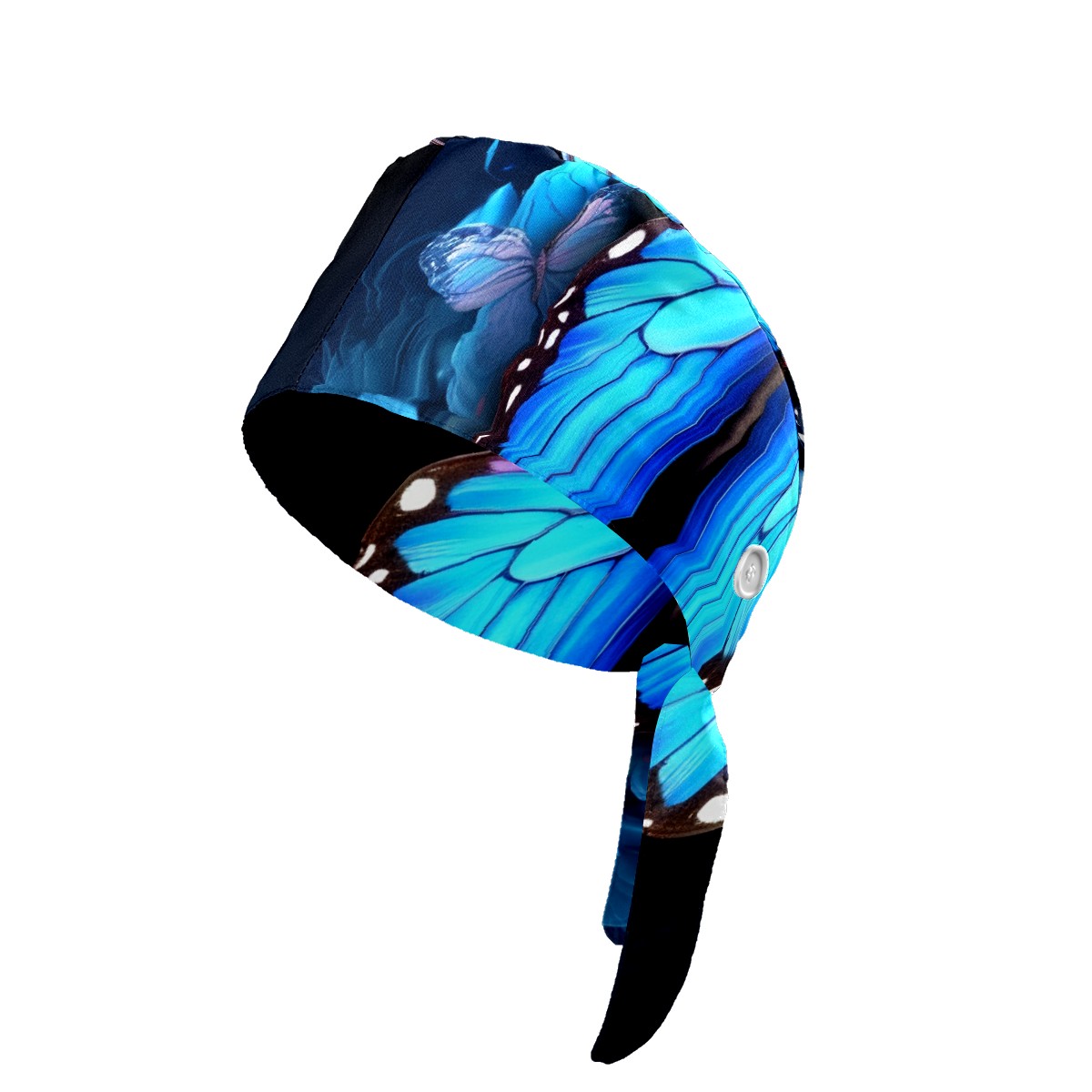 Working Caps with Button & Sweatband Satin Lined Cotton Adjustable Nurse Hats Elastic Band Scrub Cap Surgeon Hat Blue Butterflies And Flower (3)