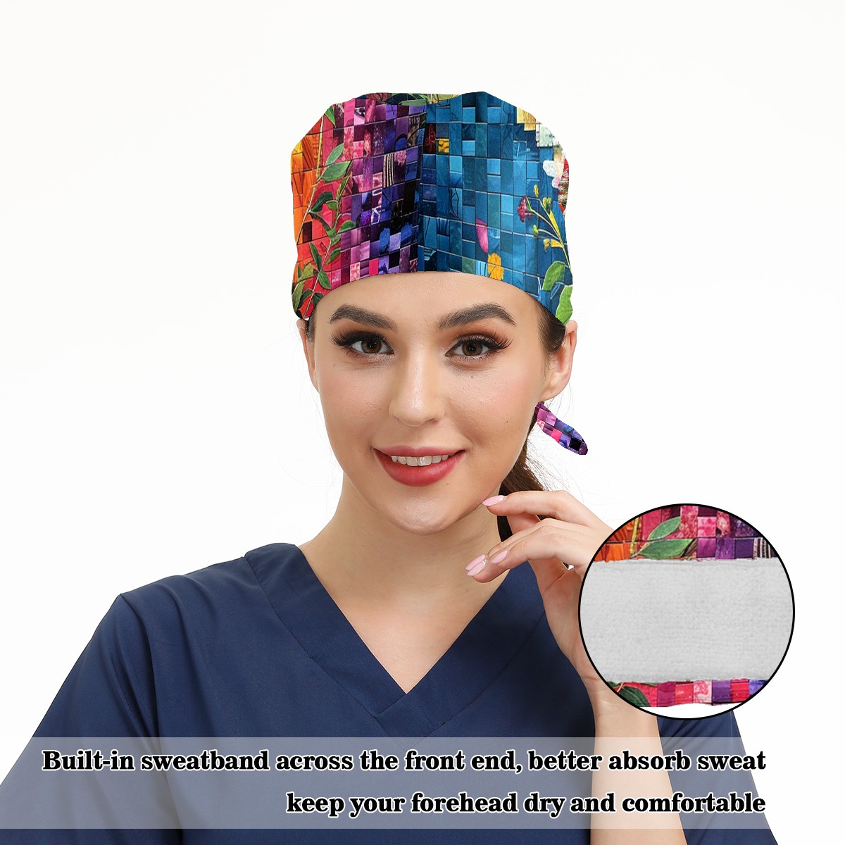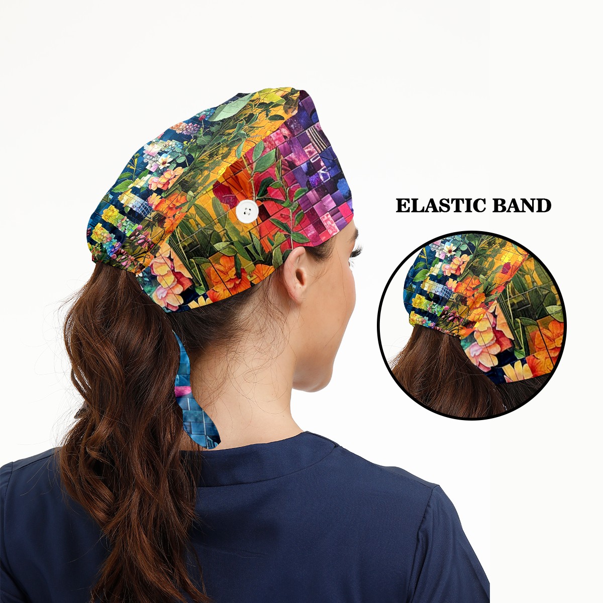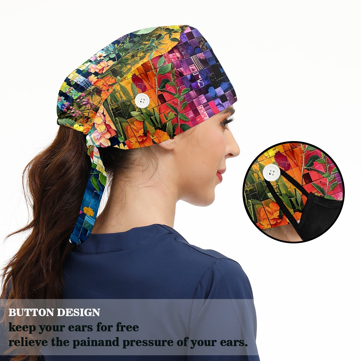 Working Caps with Button & Sweatband Satin Lined Cotton Adjustable Nurse Hats Elastic Band Scrub Cap Surgeon Hat Artistic Floral (2)