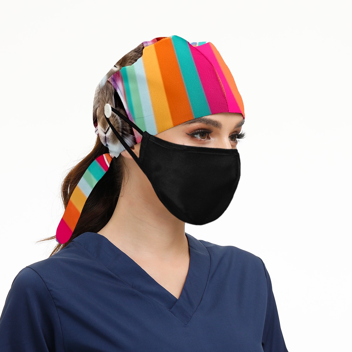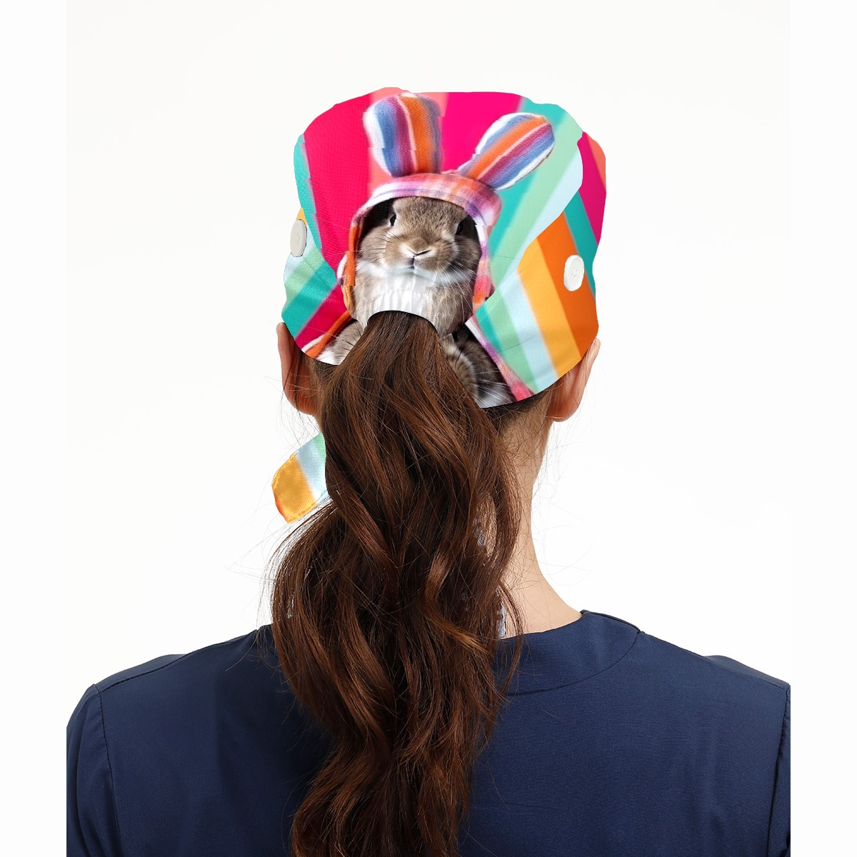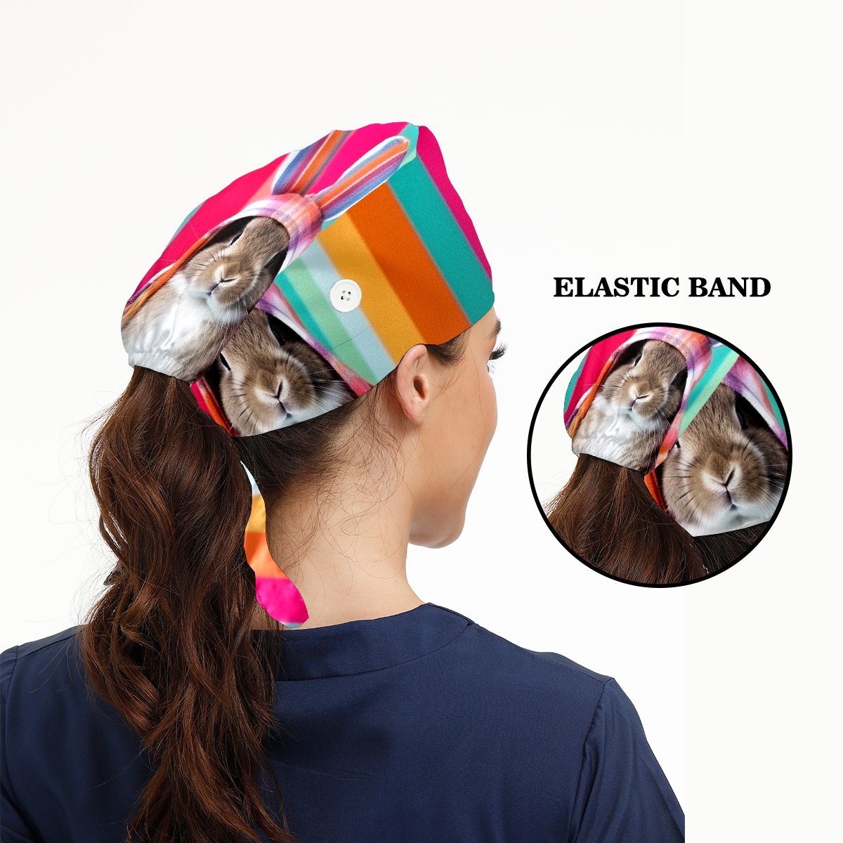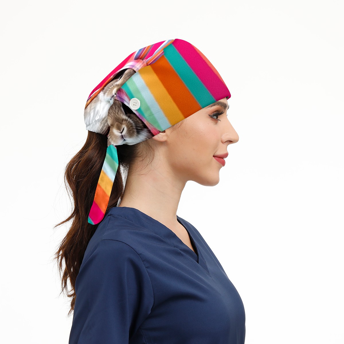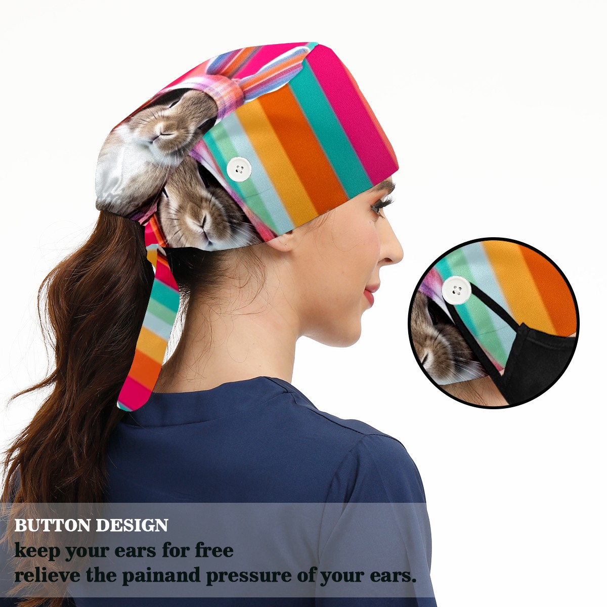 Working Caps with Button & Sweatband Satin Lined Cotton Adjustable Nurse Hats Elastic Band Scrub Cap Surgeon Hat Easter Bunny (98)