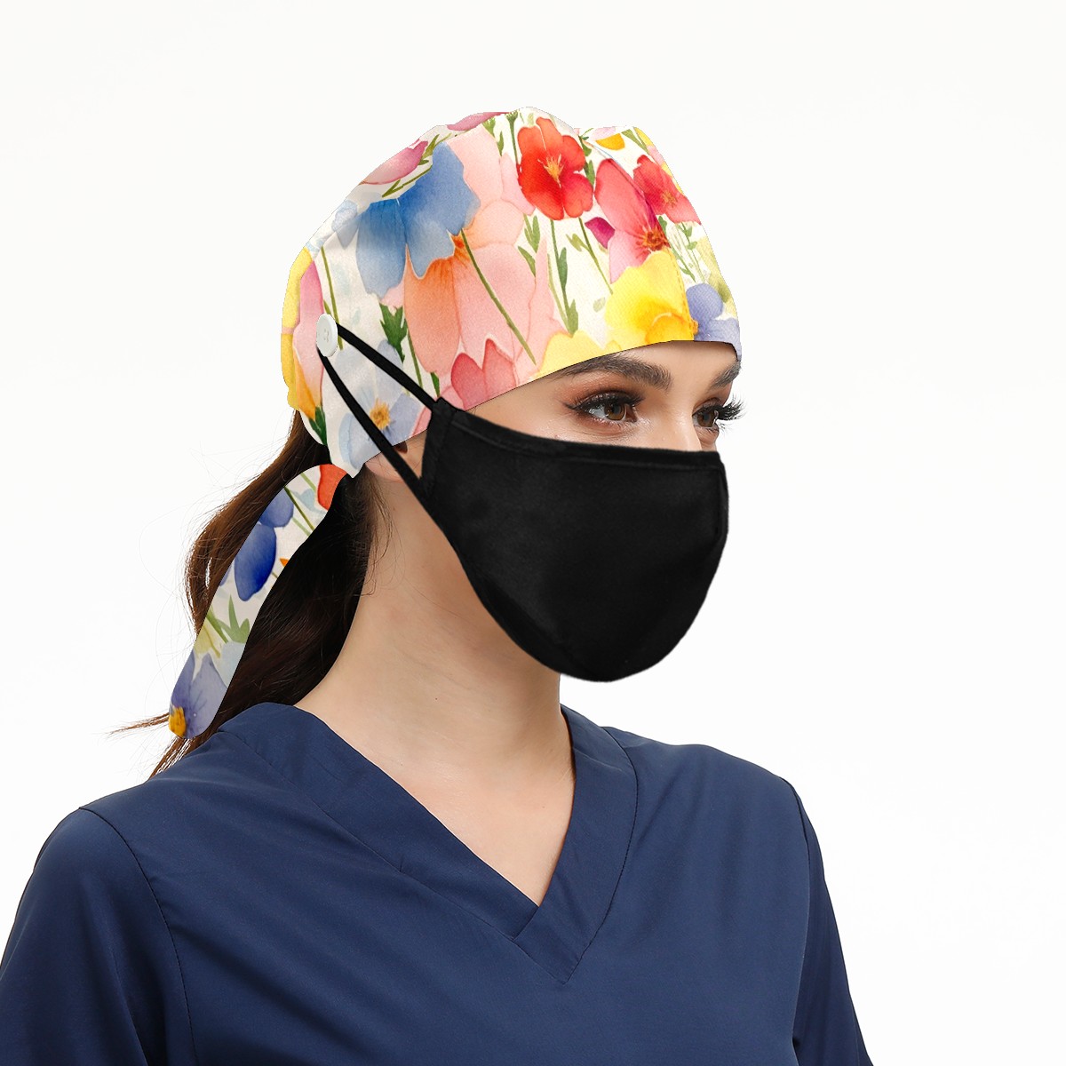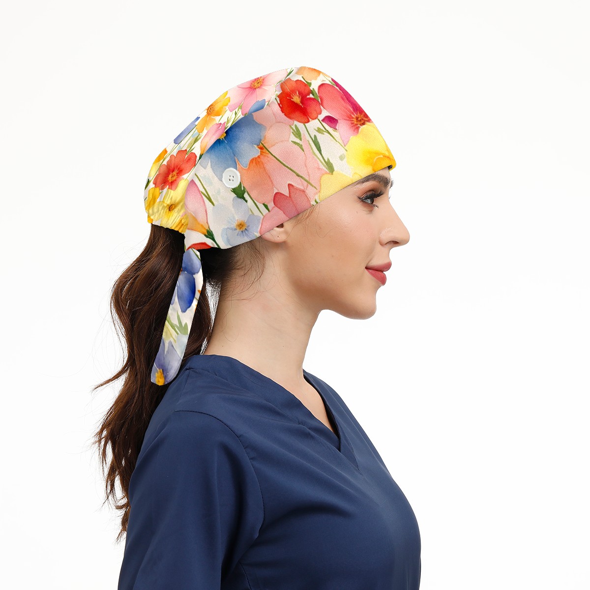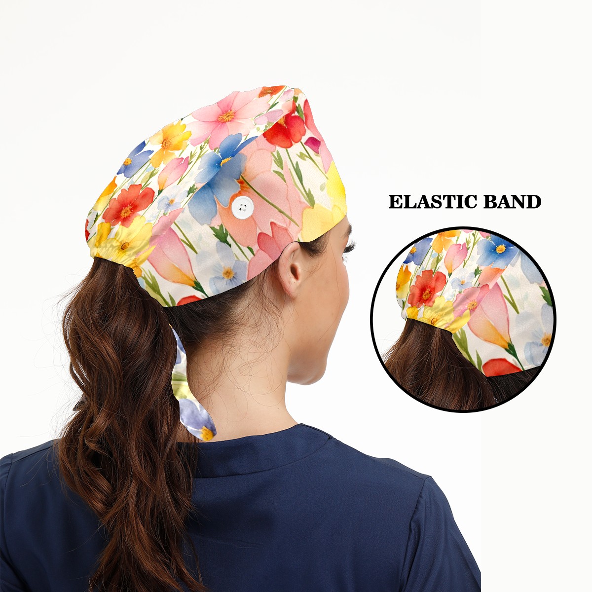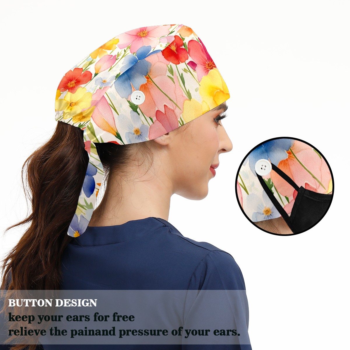 Working Caps with Button & Sweatband Satin Lined Cotton Adjustable Nurse Hats Elastic Band Scrub Cap Surgeon Hat Flowers 12