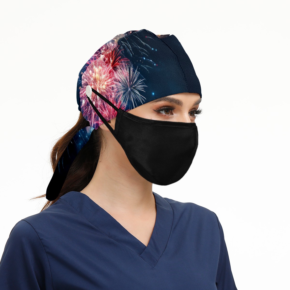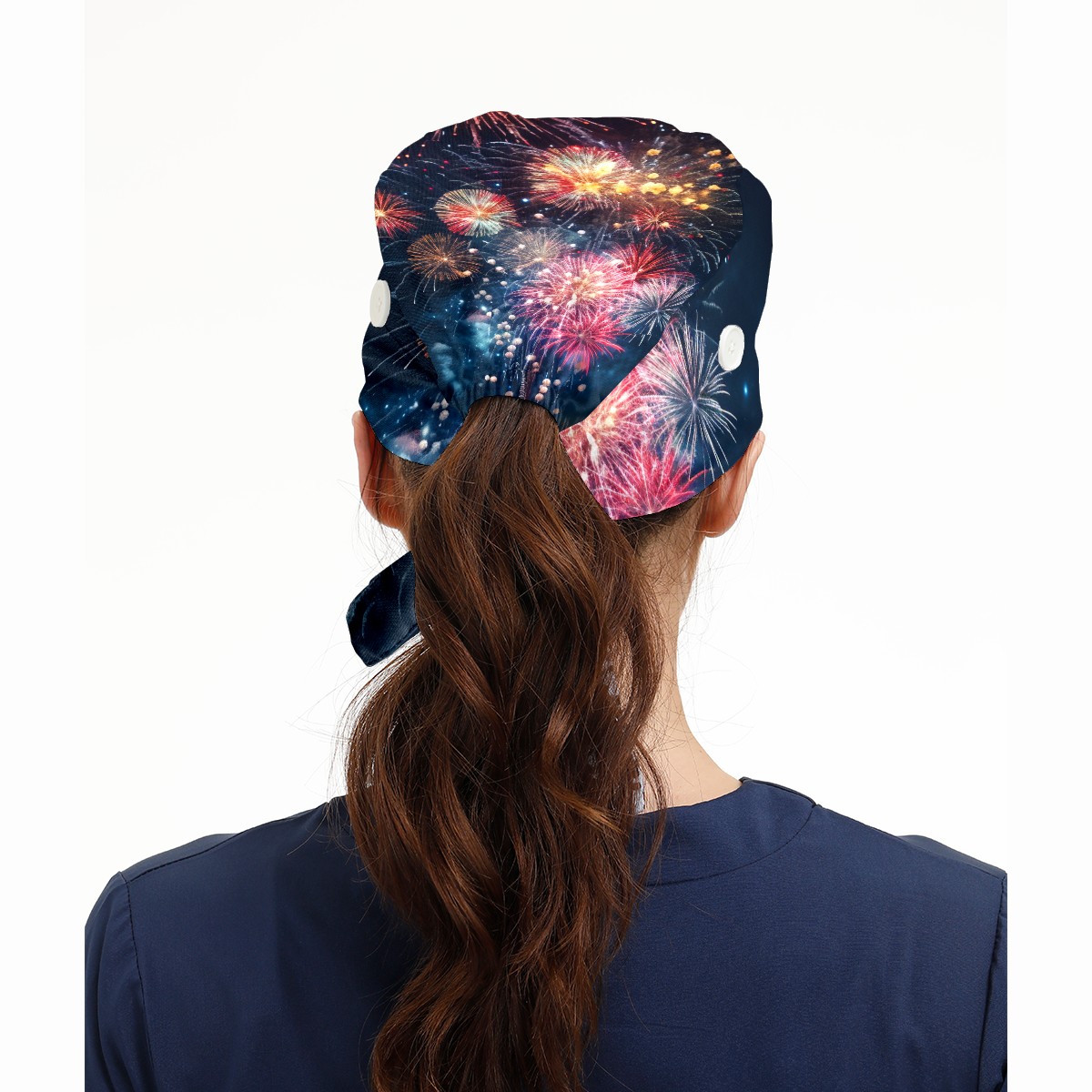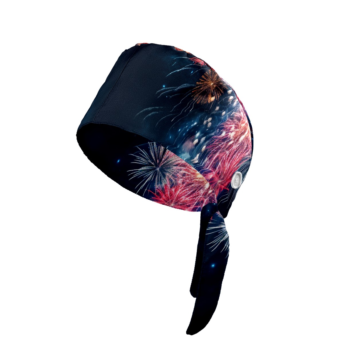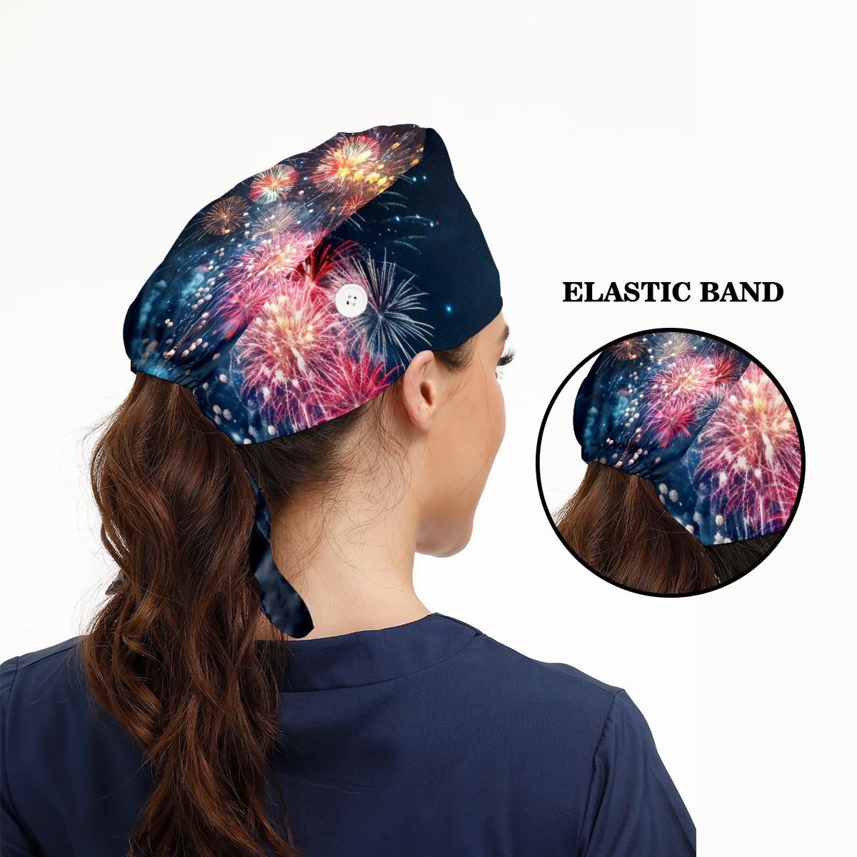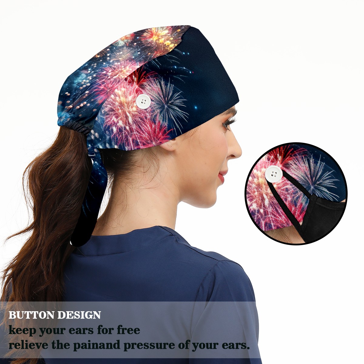 Working Caps with Button & Sweatband Satin Lined Cotton Adjustable Nurse Hats Elastic Band Scrub Cap Surgeon Hat Fireworks Sky
