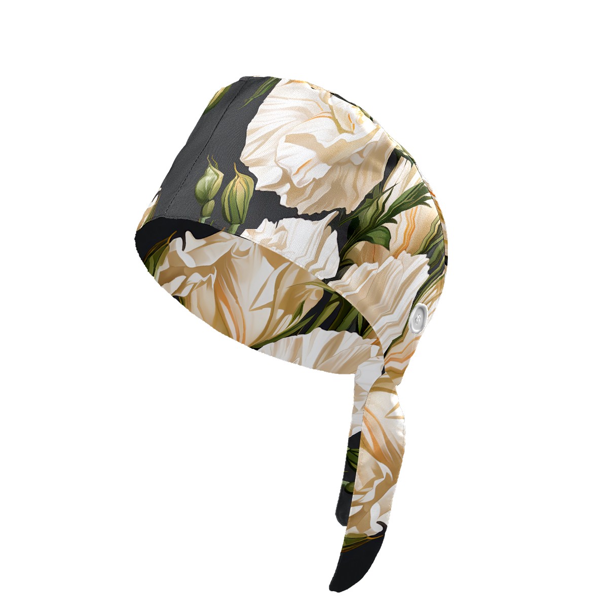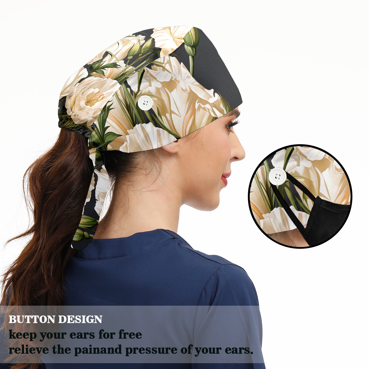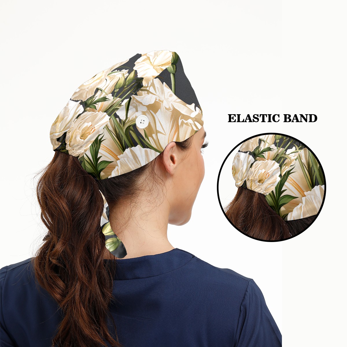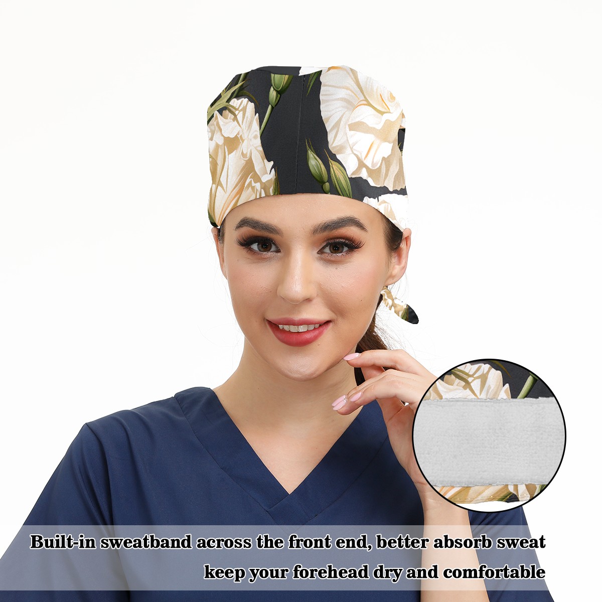 Working Caps with Button & Sweatband Satin Lined Cotton Adjustable Nurse Hats Elastic Band Scrub Cap Surgeon Hat Eustoma Bouquet