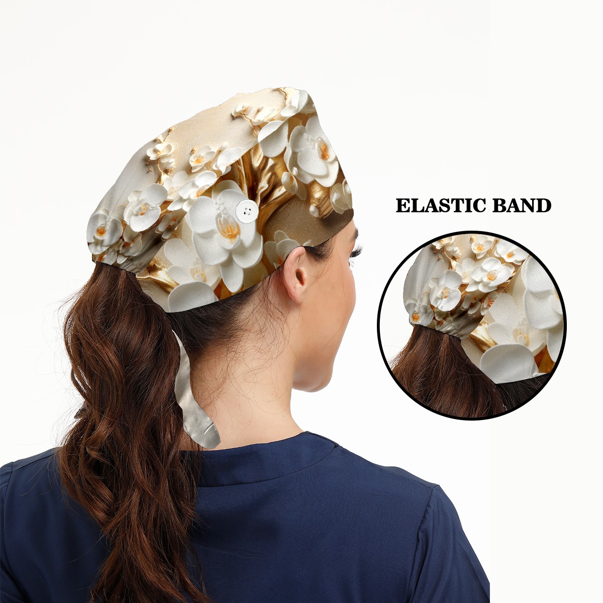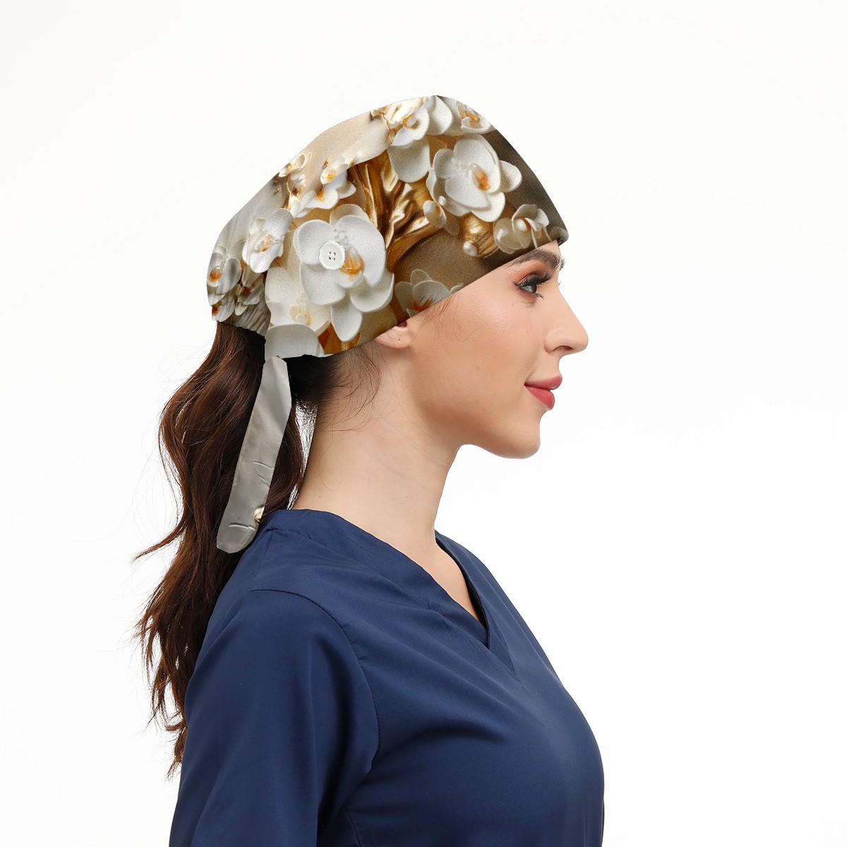 Working Caps with Button & Sweatband Satin Lined Cotton Adjustable Nurse Hats Elastic Band Scrub Cap Surgeon Hat Flowers 8