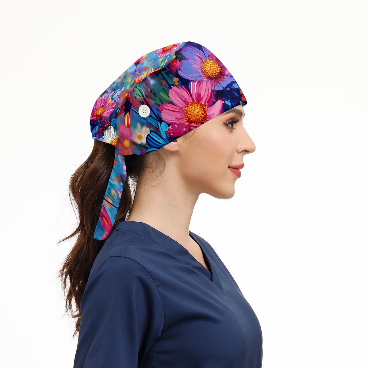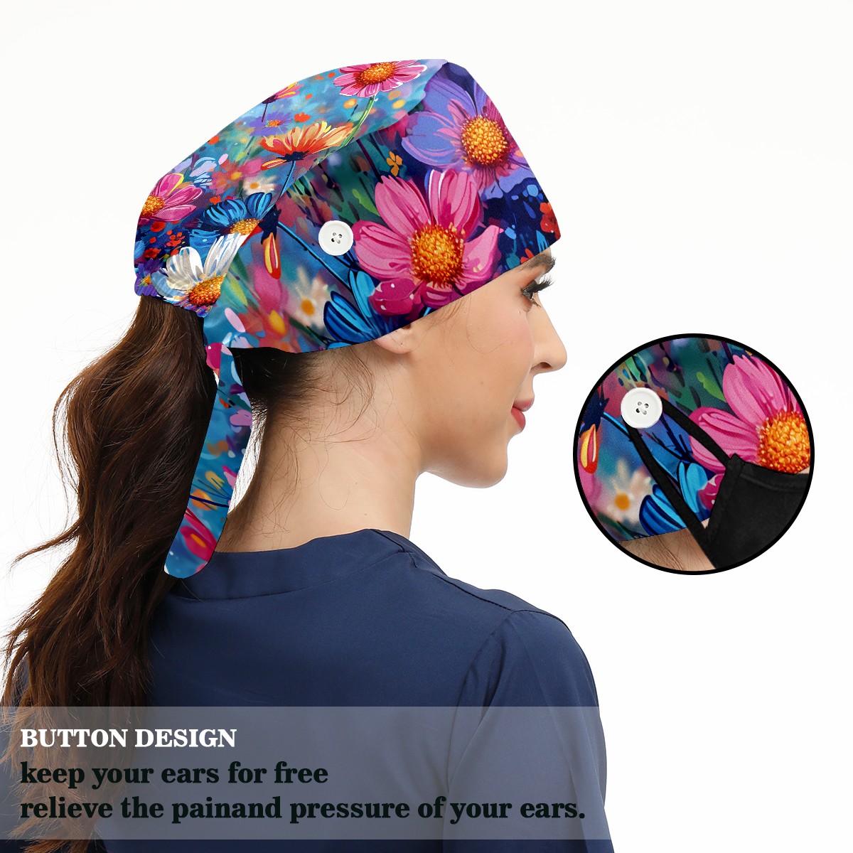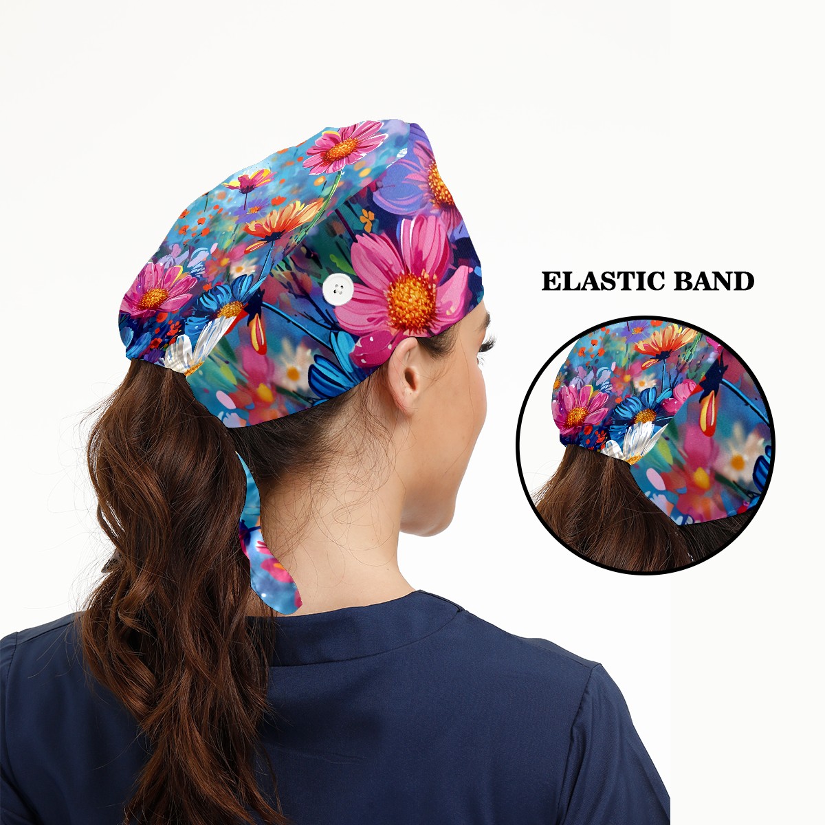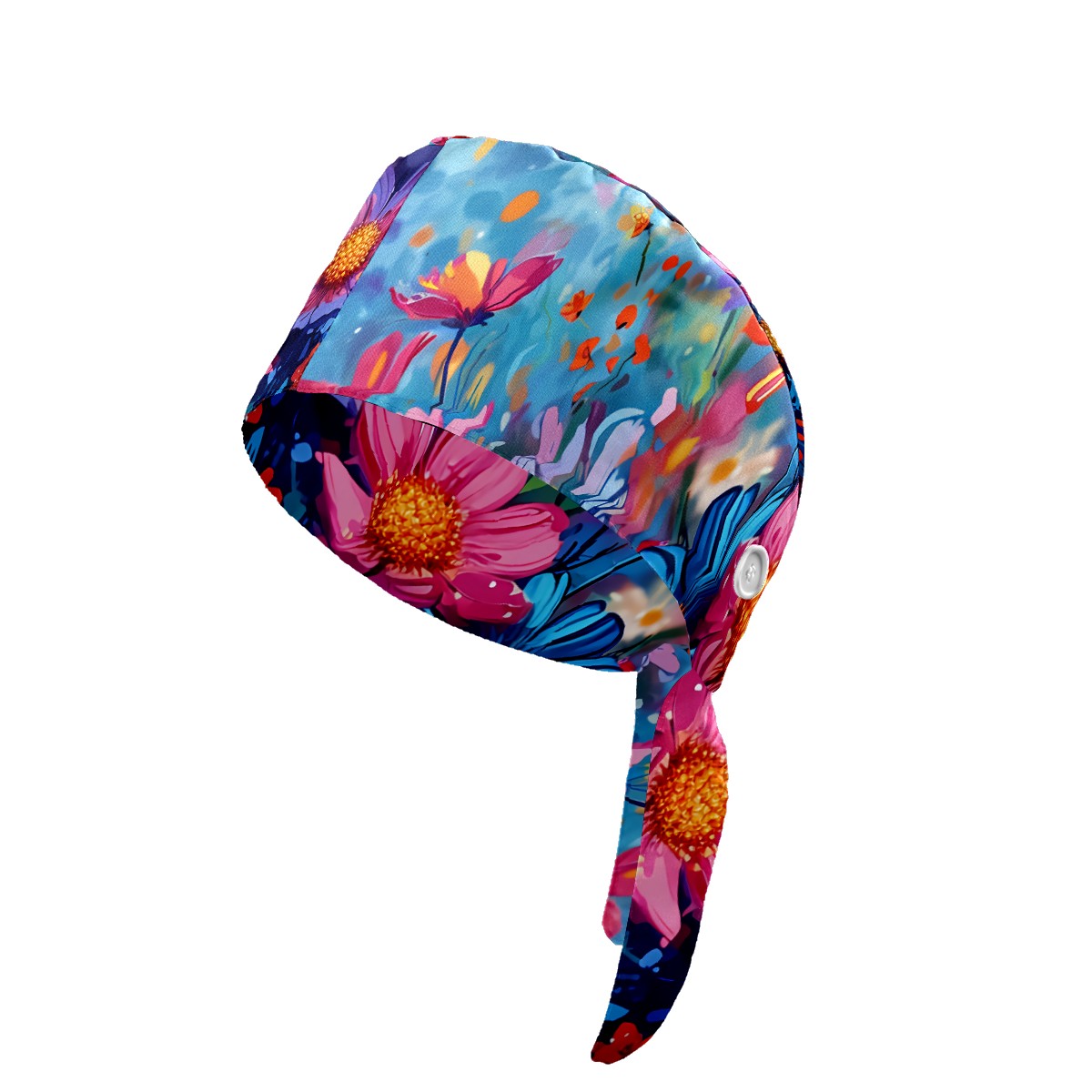 Working Caps with Button & Sweatband Satin Lined Cotton Adjustable Nurse Hats Elastic Band Scrub Cap Surgeon Hat Myriad Flowers A