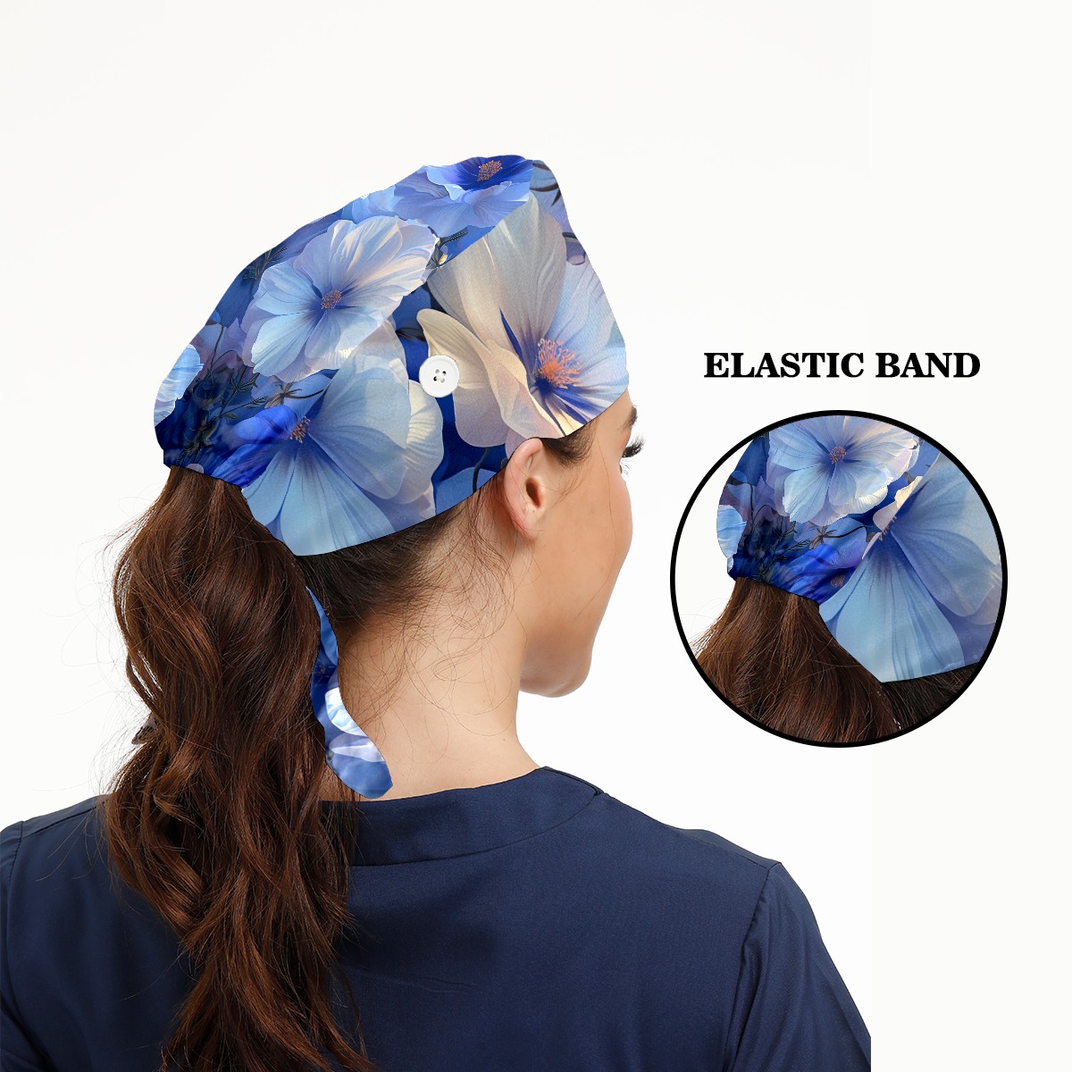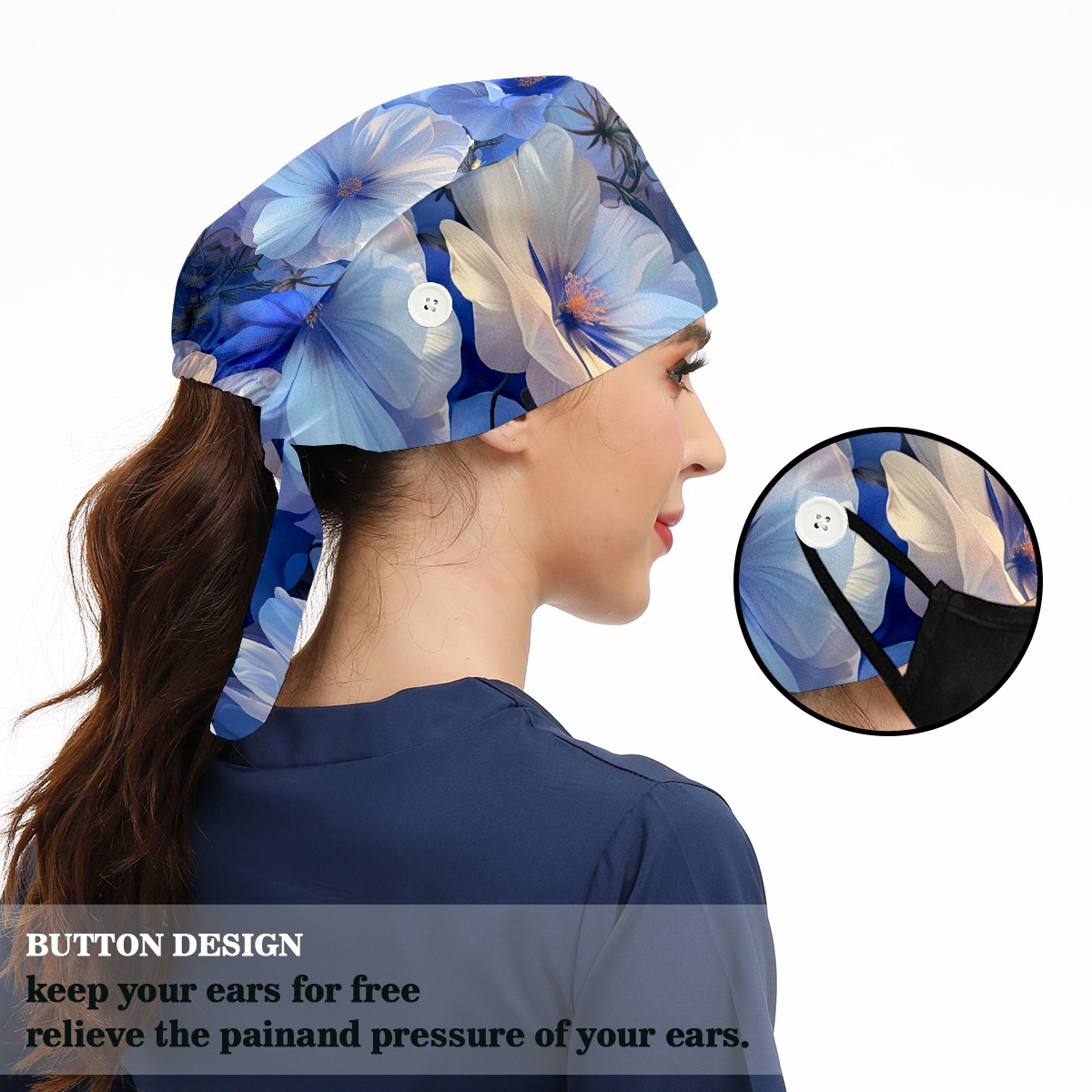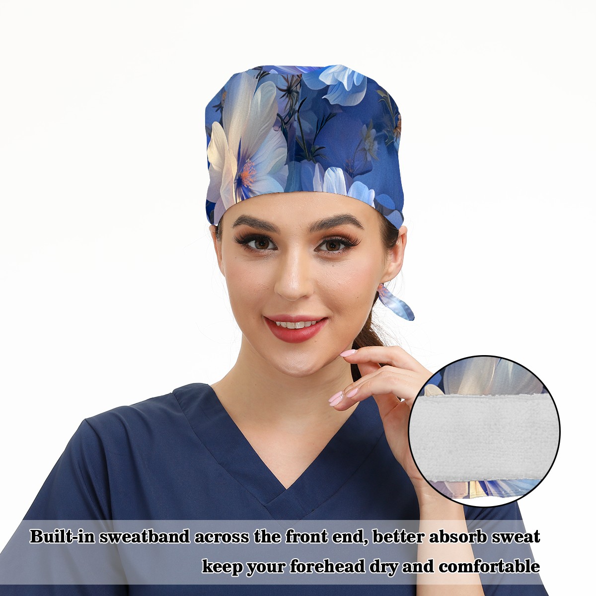 Working Caps with Button & Sweatband Satin Lined Cotton Adjustable Nurse Hats Elastic Band Scrub Cap Surgeon Hat Myriad Flowers C