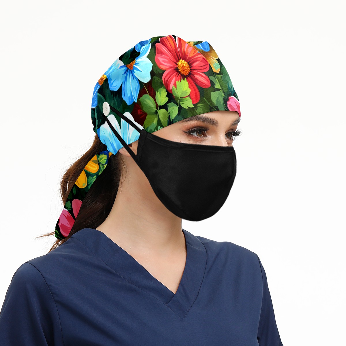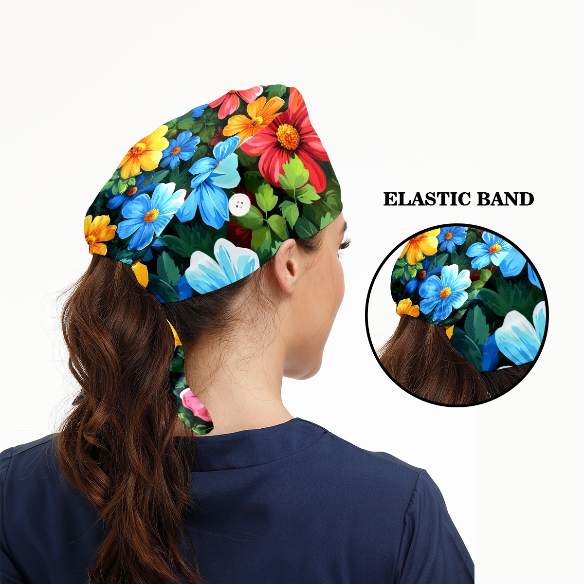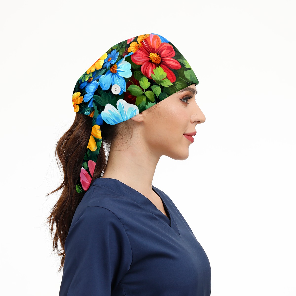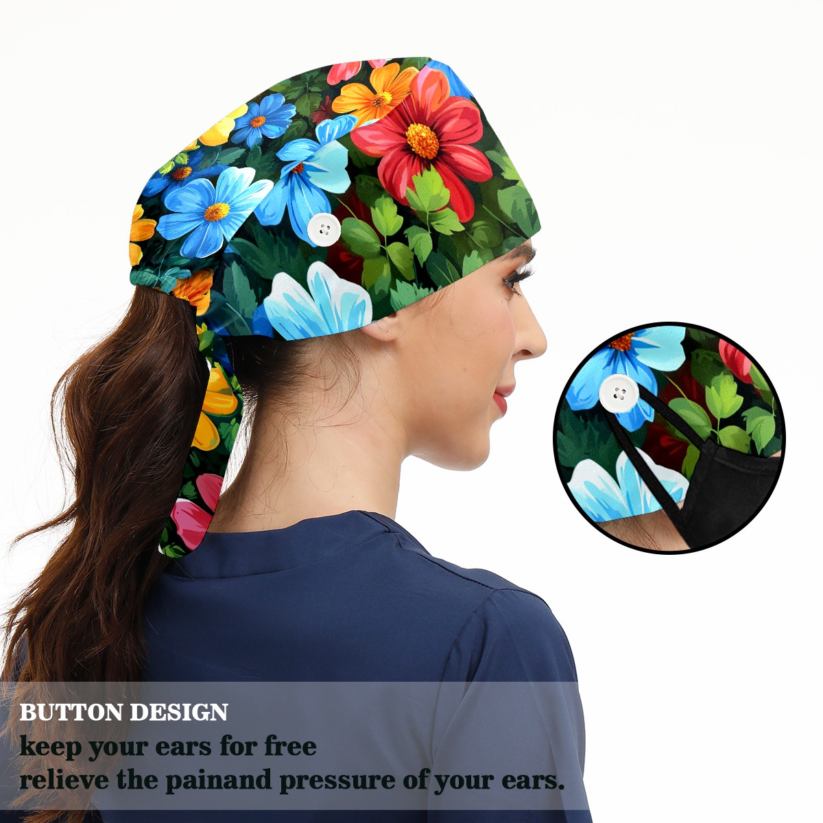 Working Caps with Button & Sweatband Satin Lined Cotton Adjustable Nurse Hats Elastic Band Scrub Cap Surgeon Hat Myriad Flowers D