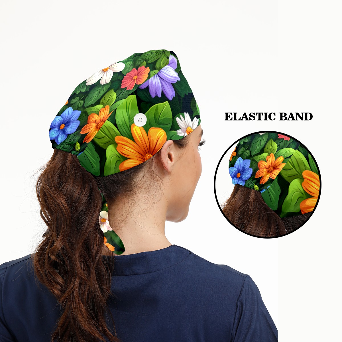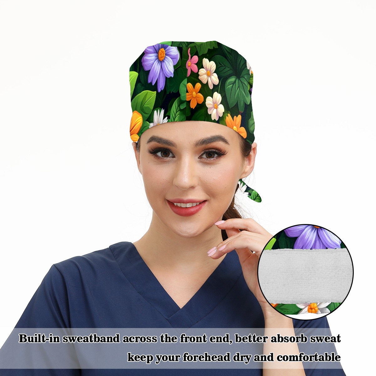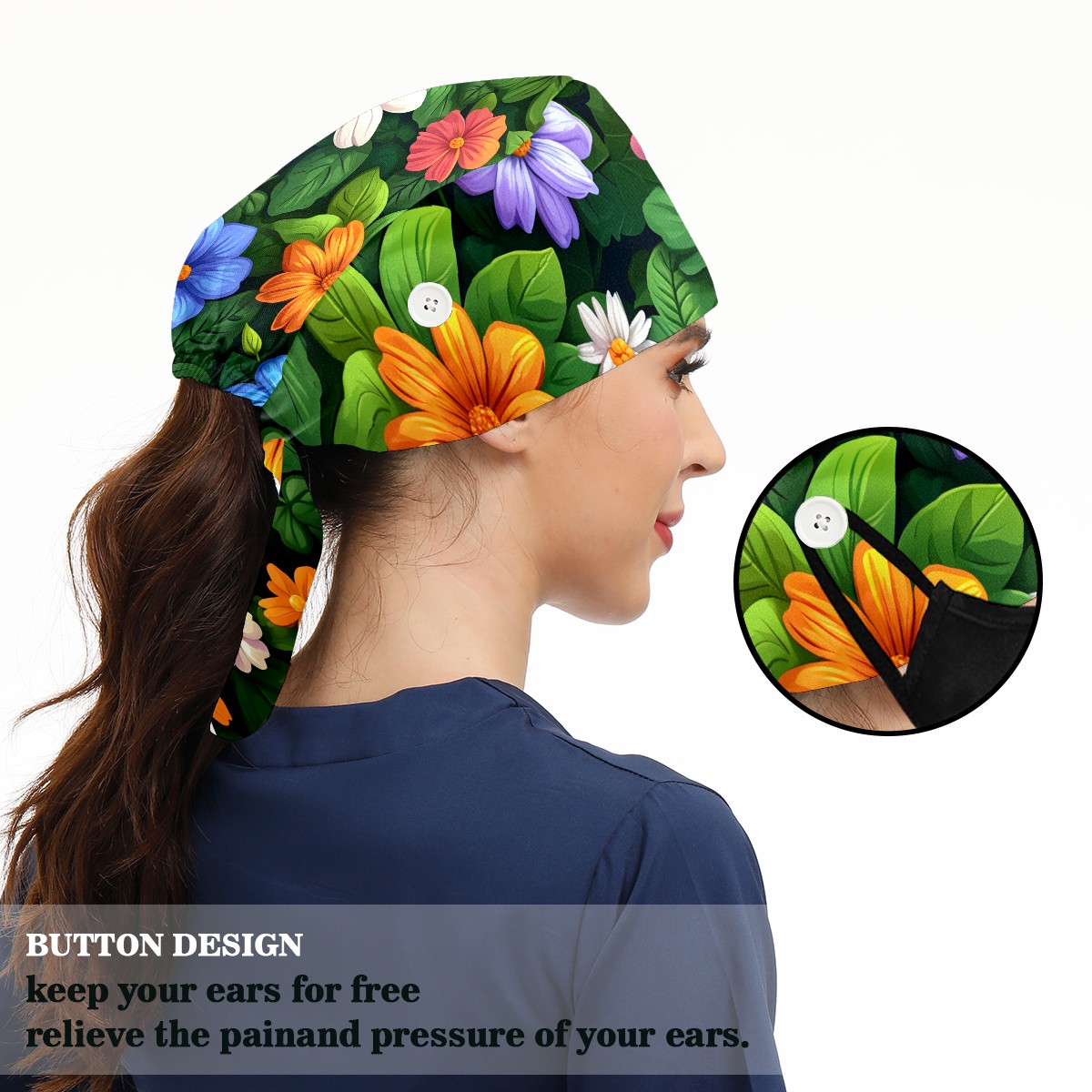 Working Caps with Button & Sweatband Satin Lined Cotton Adjustable Nurse Hats Elastic Band Scrub Cap Surgeon Hat Colorful Flowers E