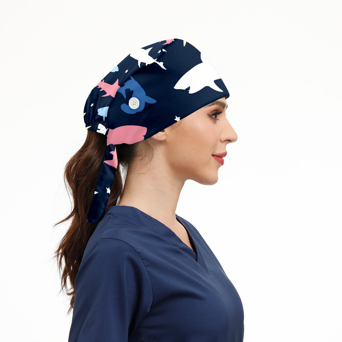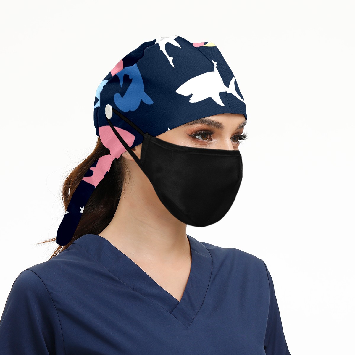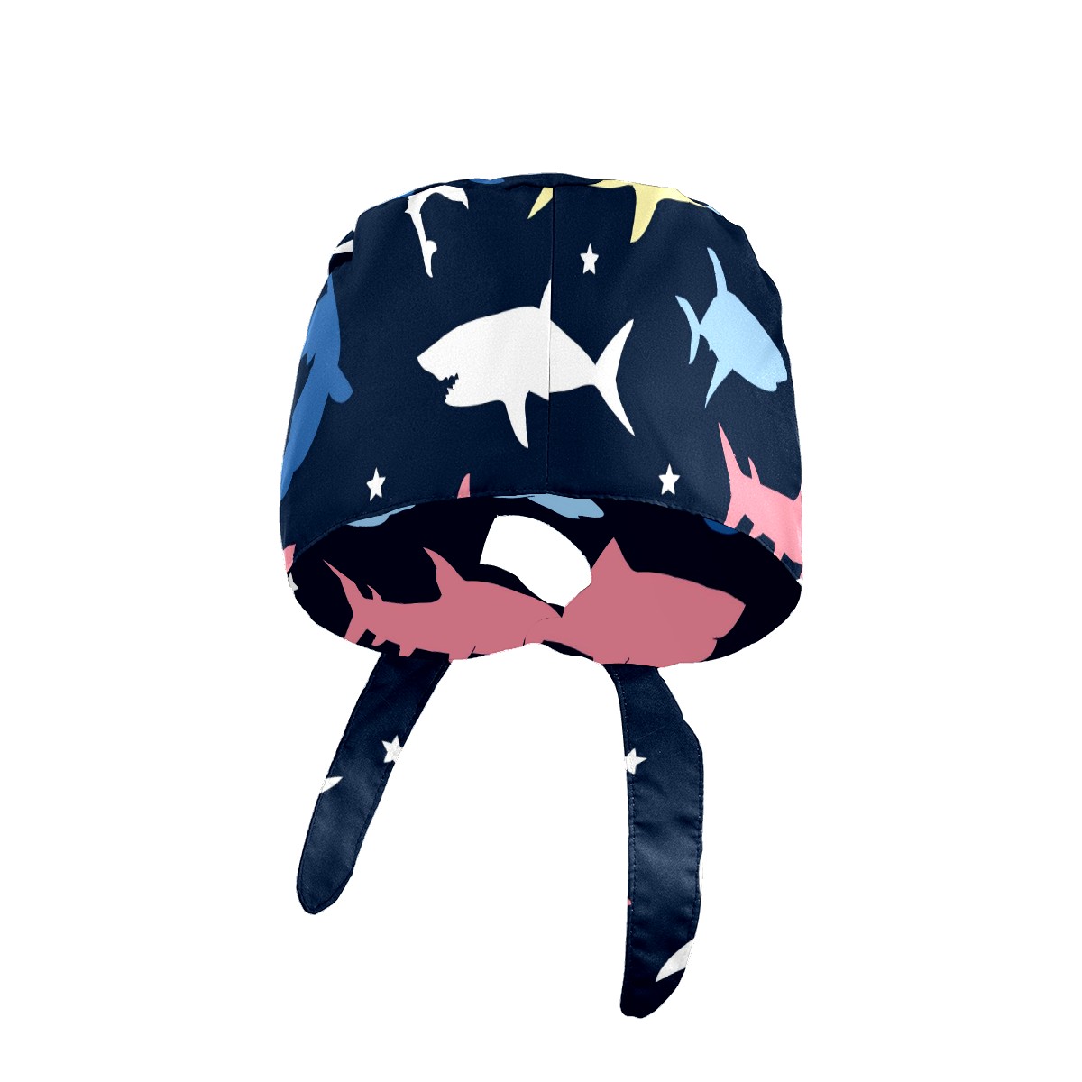 Working Caps with Button & Sweatband Satin Lined Cotton Adjustable Nurse Hats Elastic Band Scrub Cap Surgeon Hat Colorful Shark Pattern