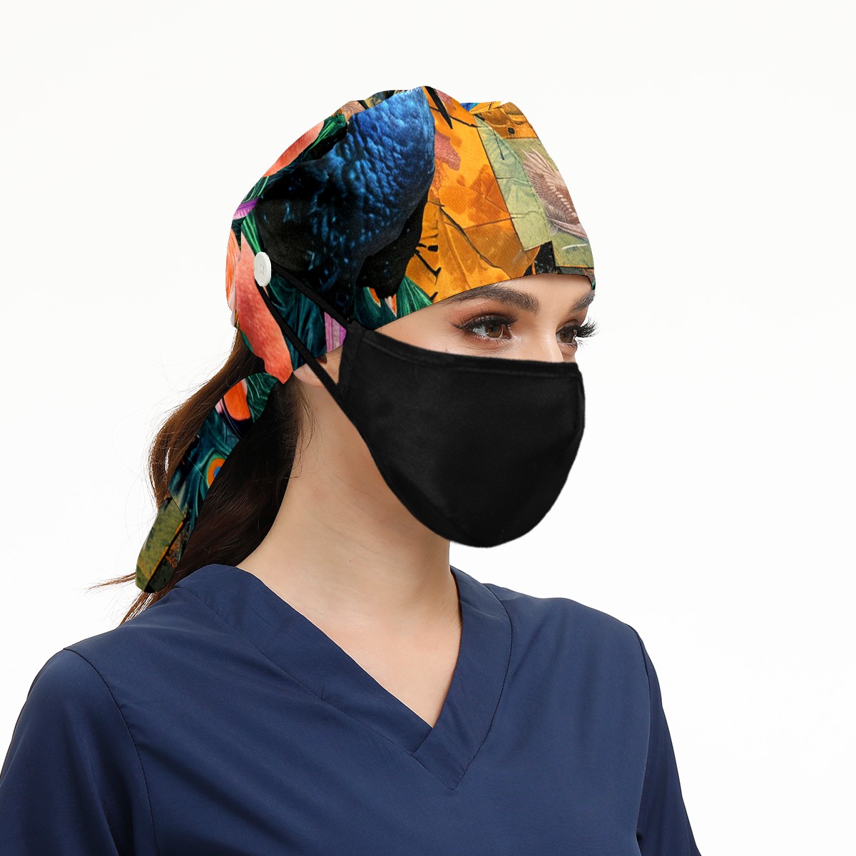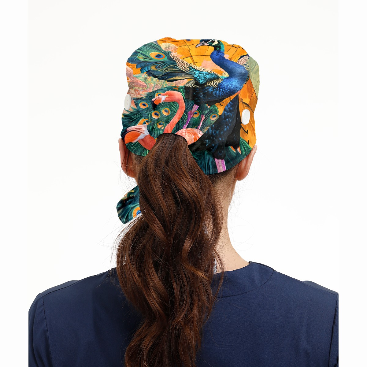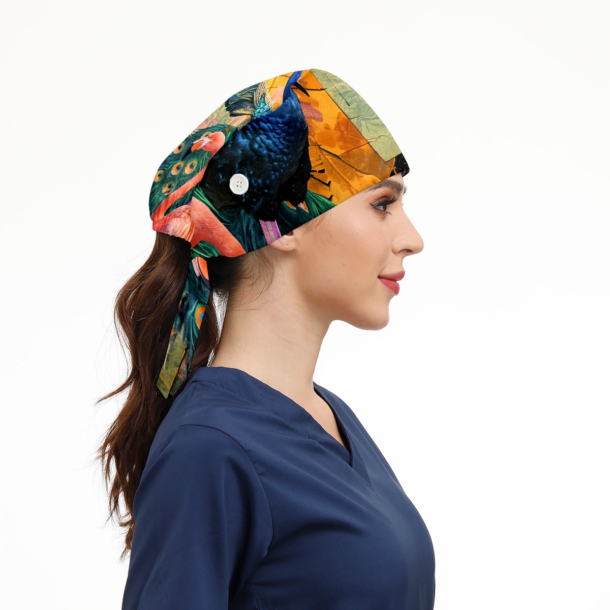 Working Caps with Button & Sweatband Satin Lined Cotton Adjustable Nurse Hats Elastic Band Scrub Cap Surgeon Hat Peacock
