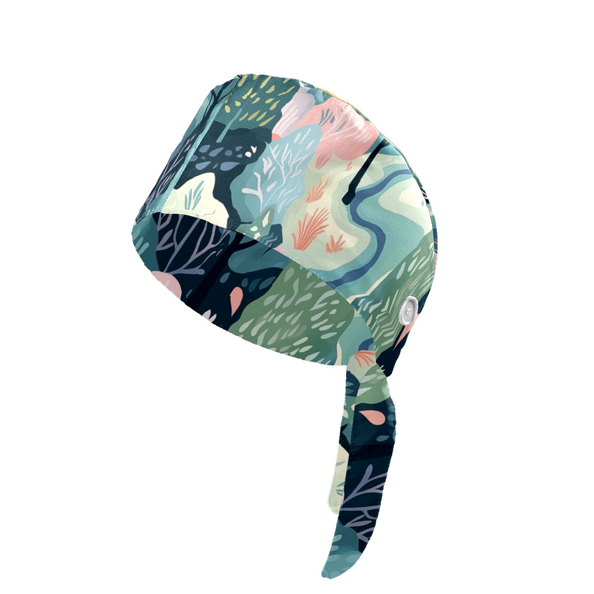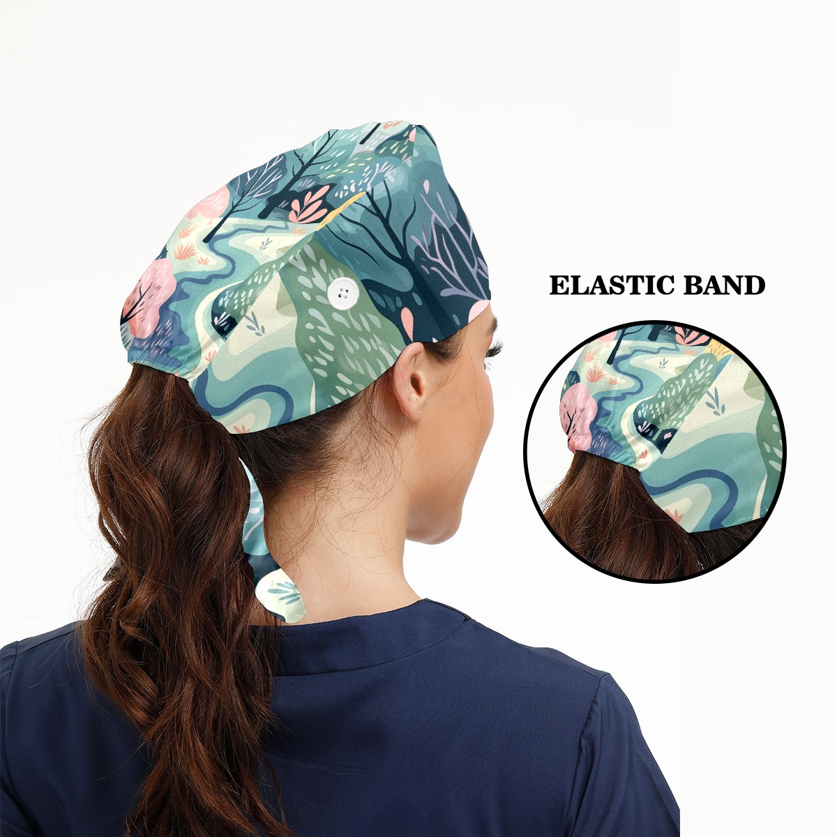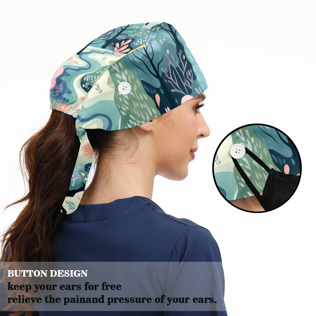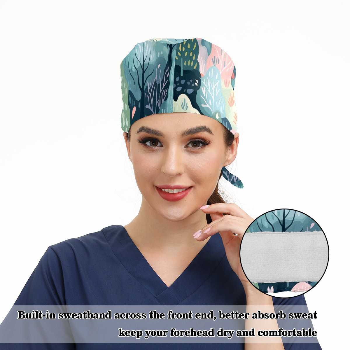 Working Caps with Button & Sweatband Satin Lined Cotton Adjustable Nurse Hats Elastic Band Scrub Cap Surgeon Hat Wild Forest