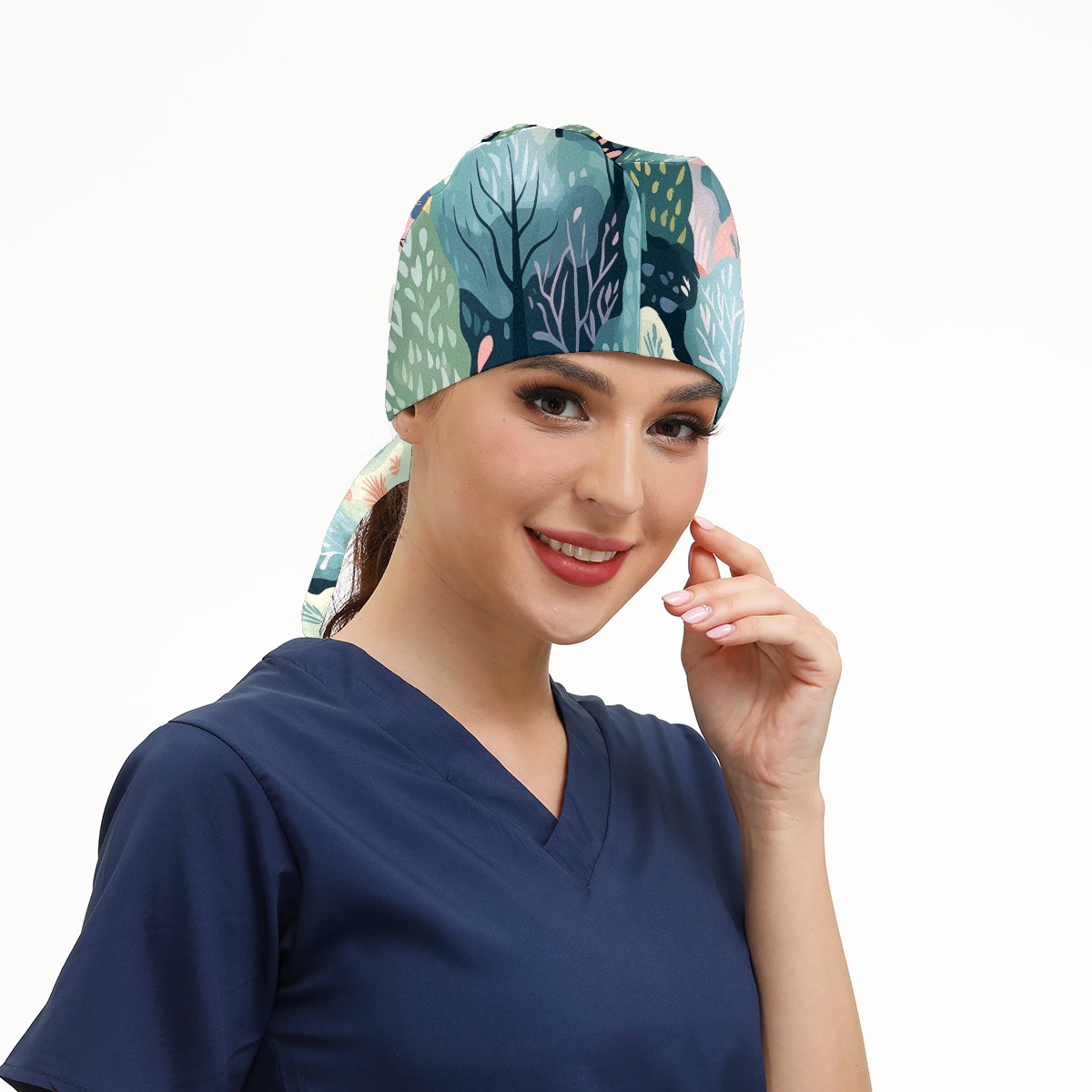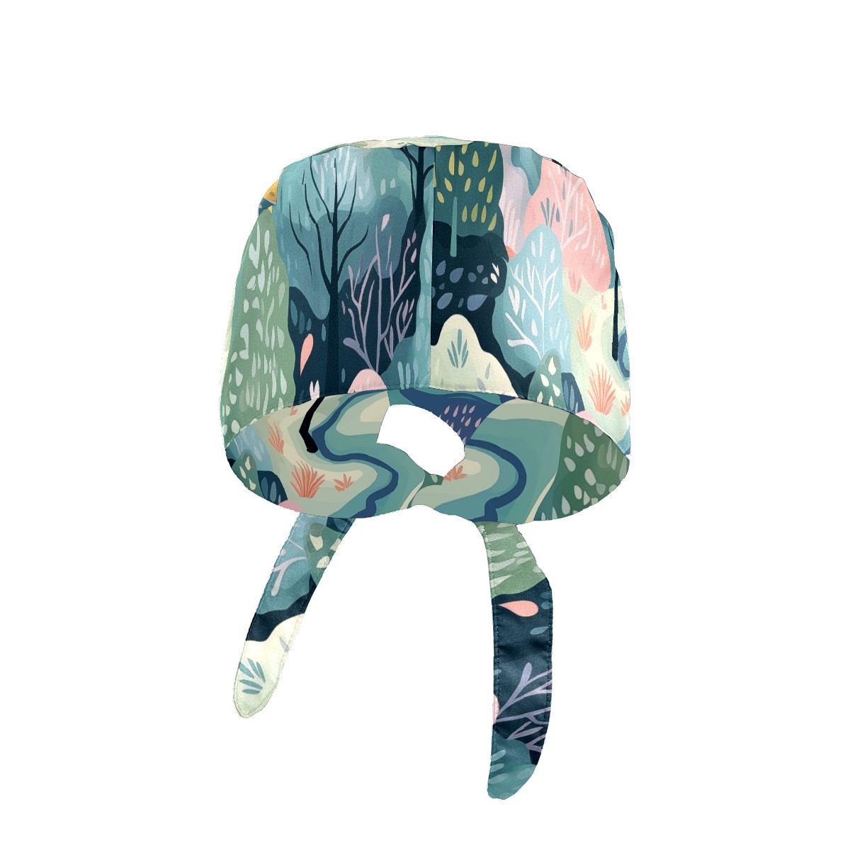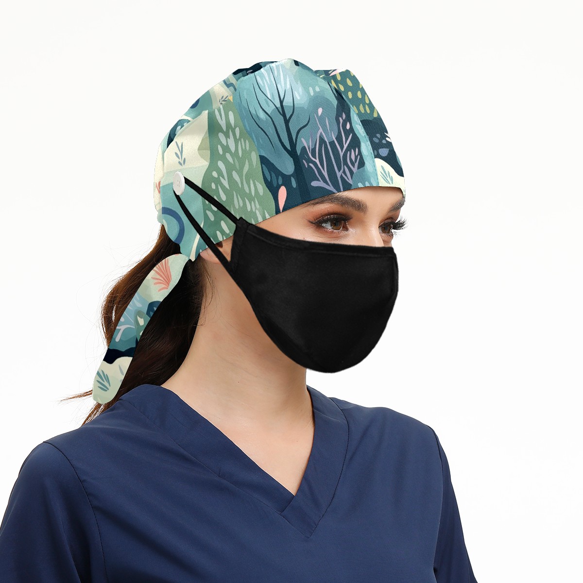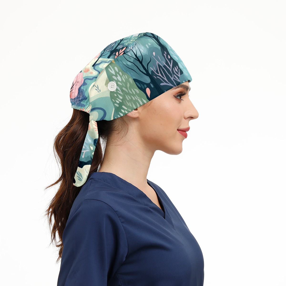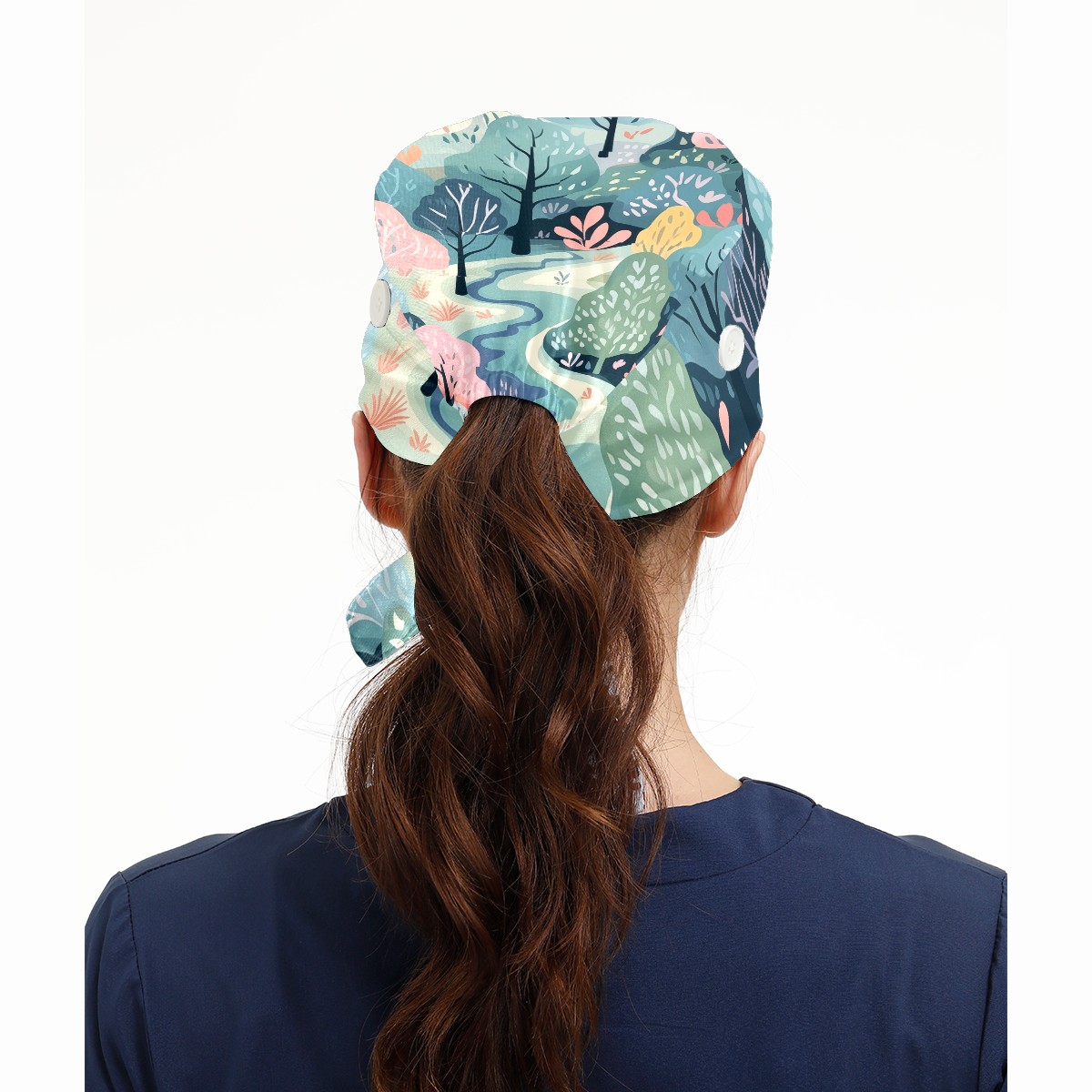 Working Caps with Button & Sweatband Satin Lined Cotton Adjustable Nurse Hats Elastic Band Scrub Cap Surgeon Hat Wild Forest