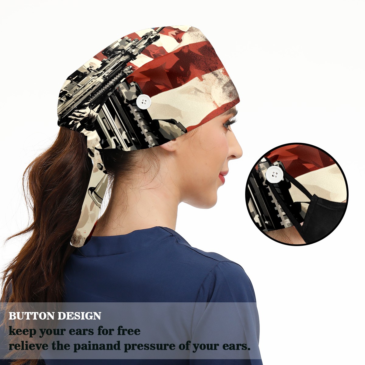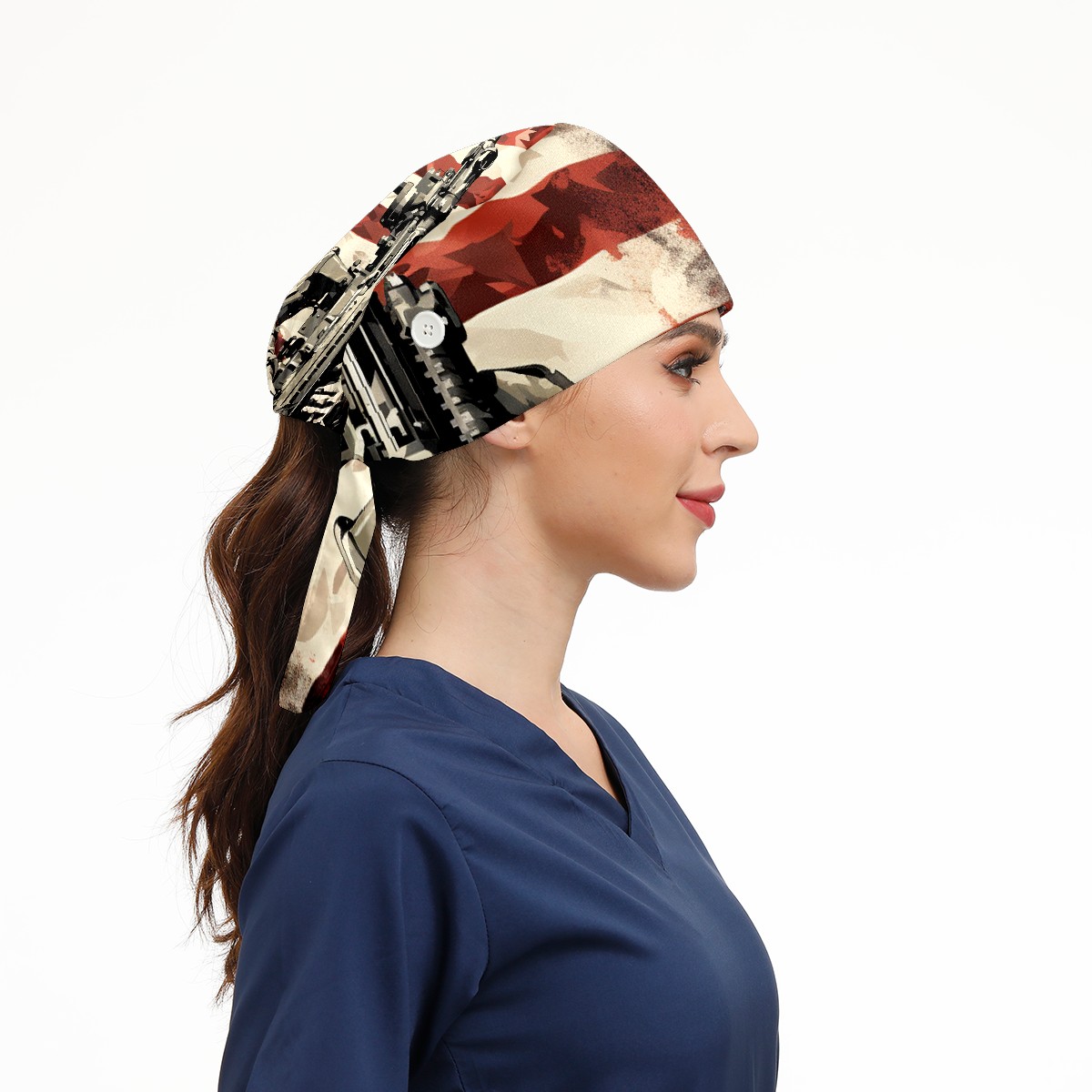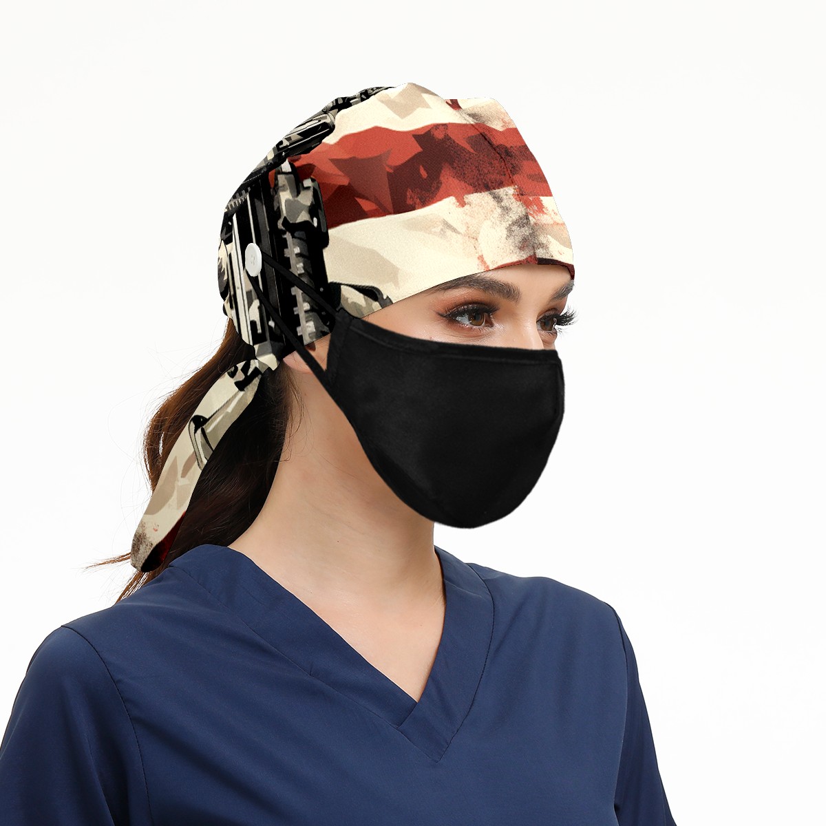 Working Caps with Button & Sweatband Satin Lined Cotton Adjustable Nurse Hats Elastic Band Scrub Cap Surgeon Hat National Flag