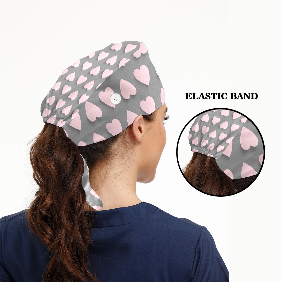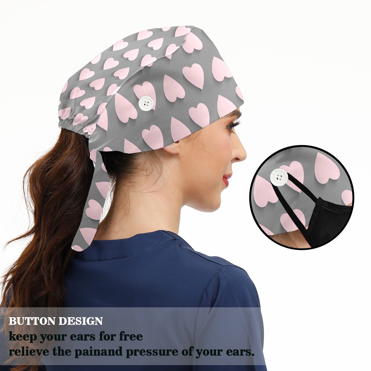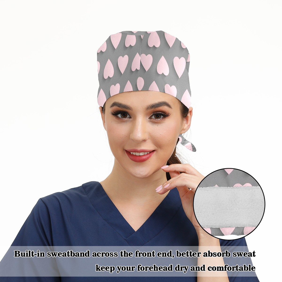 Working Caps with Button & Sweatband Satin Lined Cotton Adjustable Nurse Hats Elastic Band Scrub Cap Surgeon Hat Hearts (6)