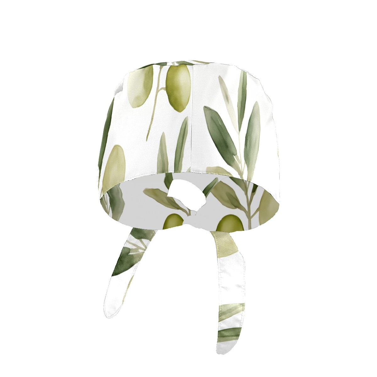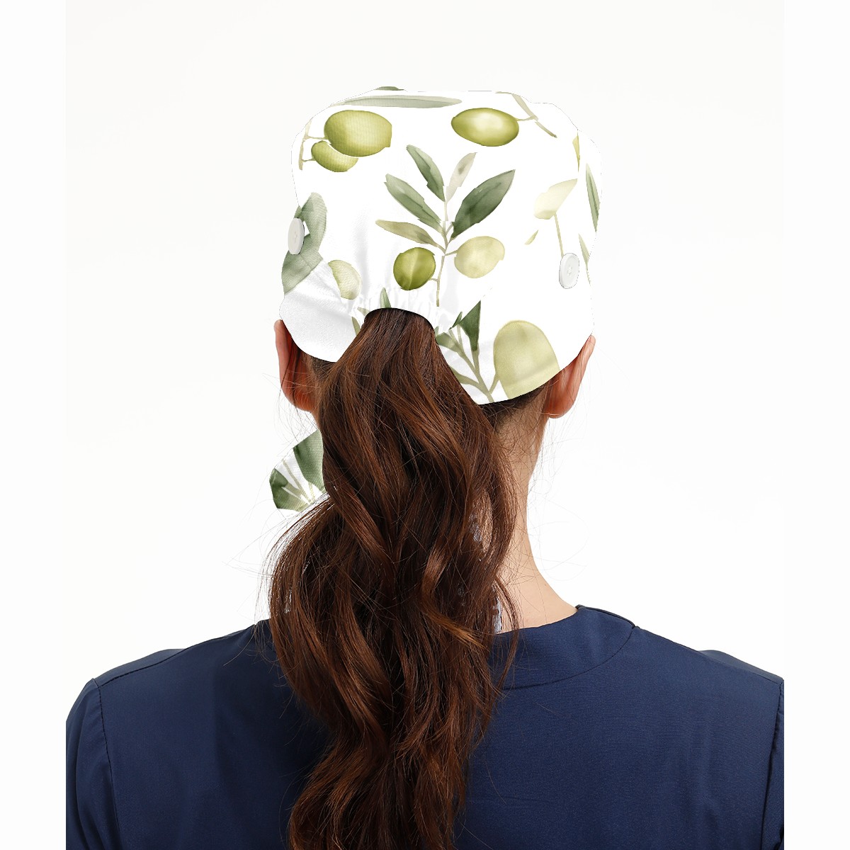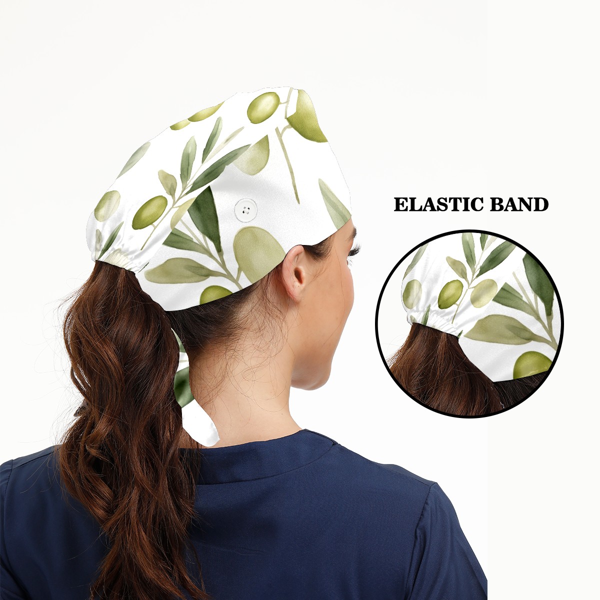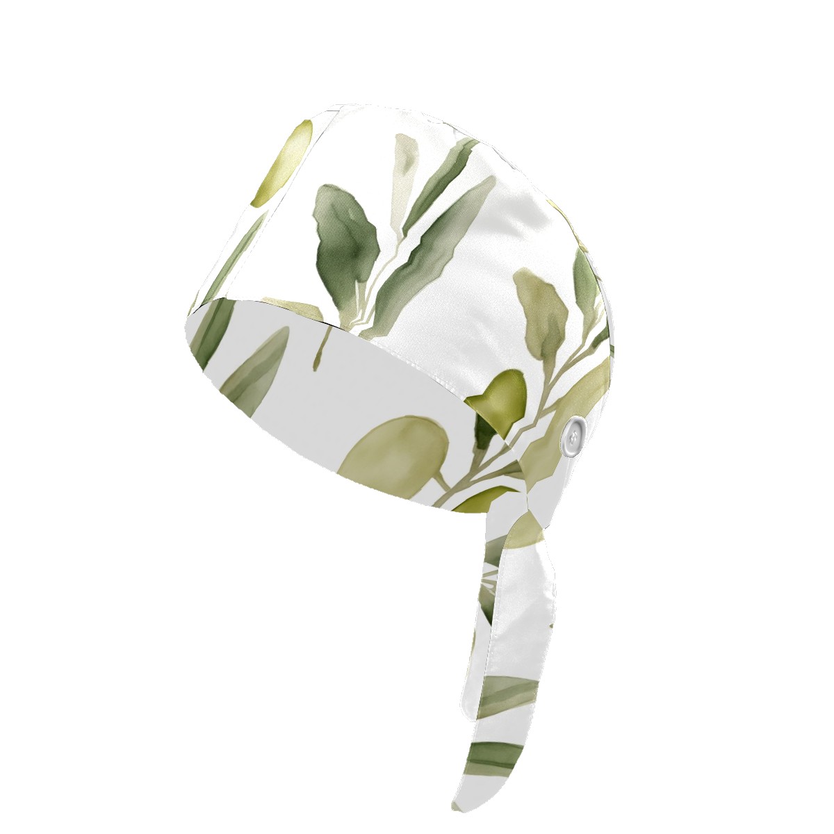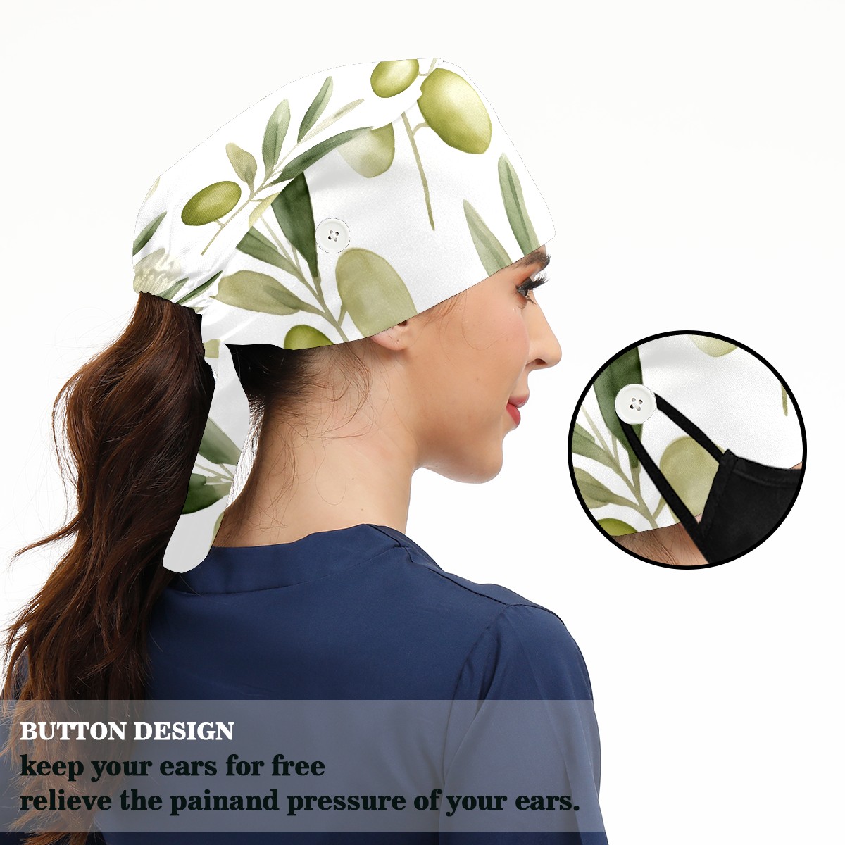 Working Caps with Button & Sweatband Satin Lined Cotton Adjustable Nurse Hats Elastic Band Scrub Cap Surgeon Hat Watercolor Olive
