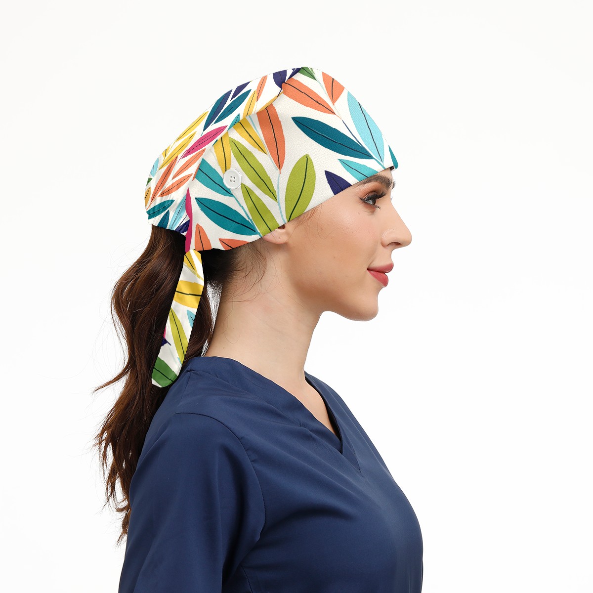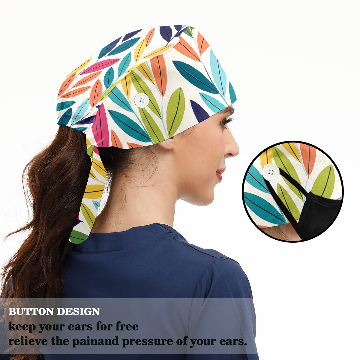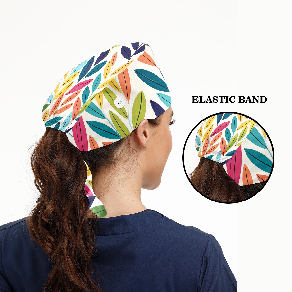 Working Caps with Button & Sweatband Satin Lined Cotton Adjustable Nurse Hats Elastic Band Scrub Cap Surgeon Hat Colorful Leaf