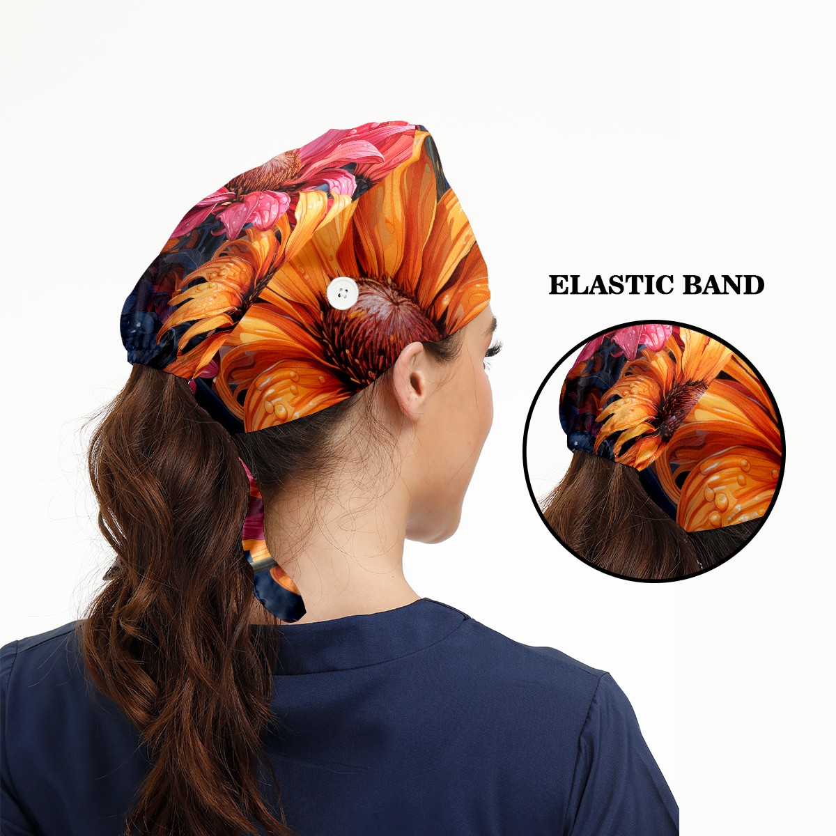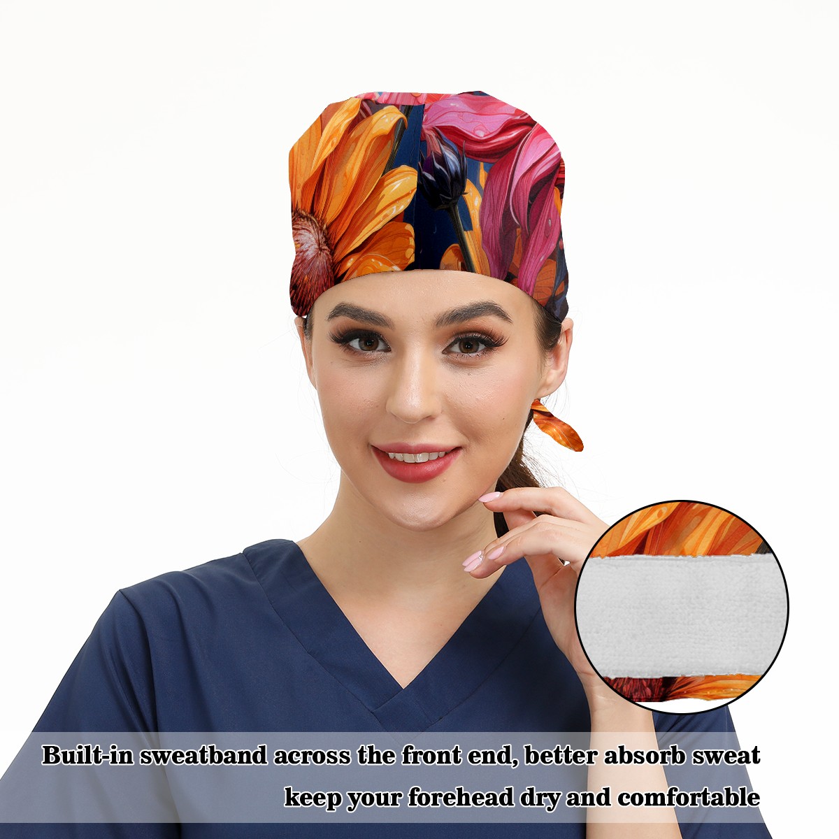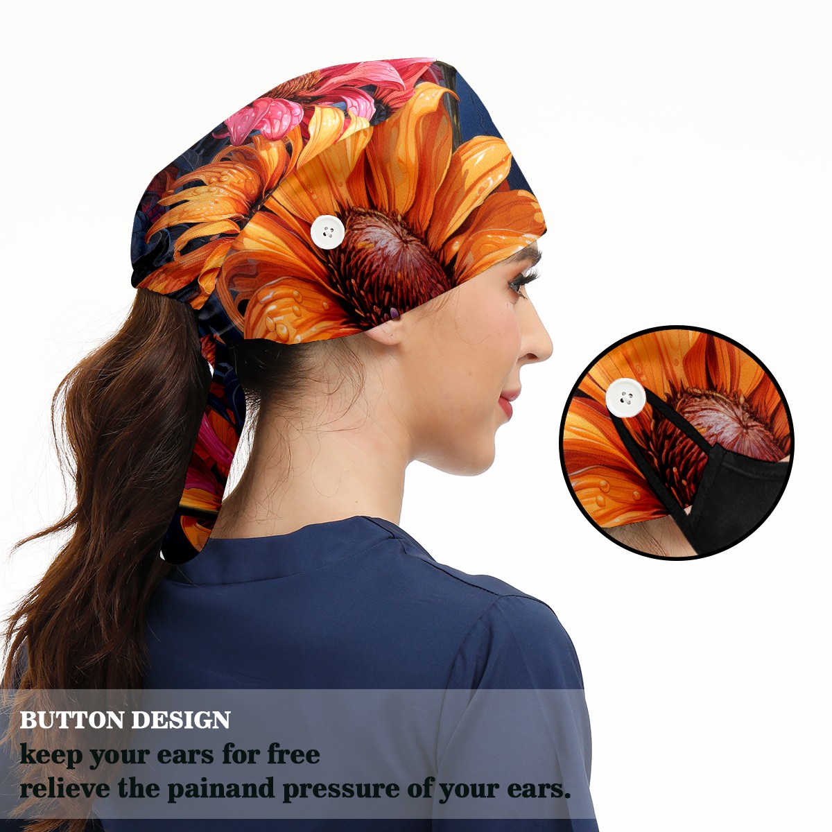Working Caps with Button & Sweatband Satin Lined Cotton Adjustable Nurse Hats Elastic Band Scrub Cap Surgeon Hat Sunflower