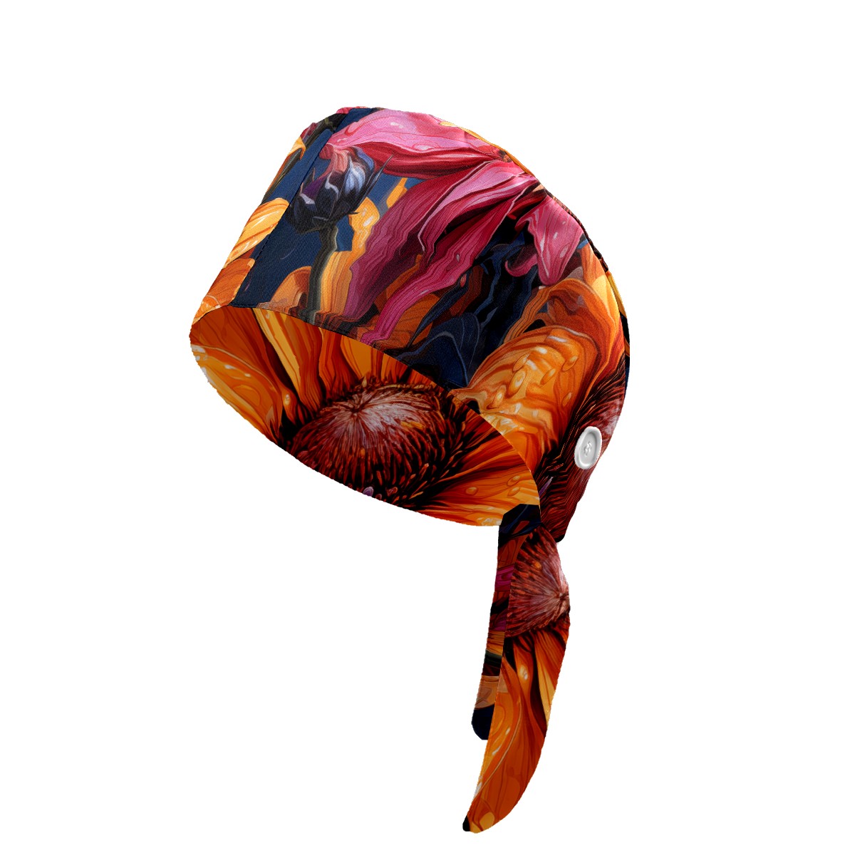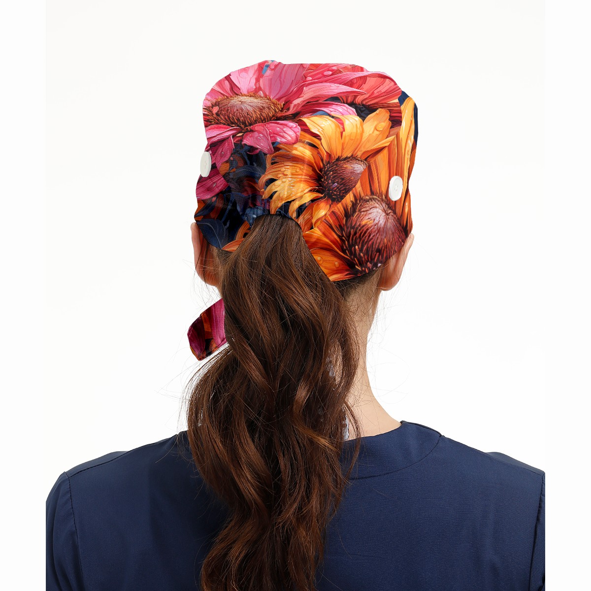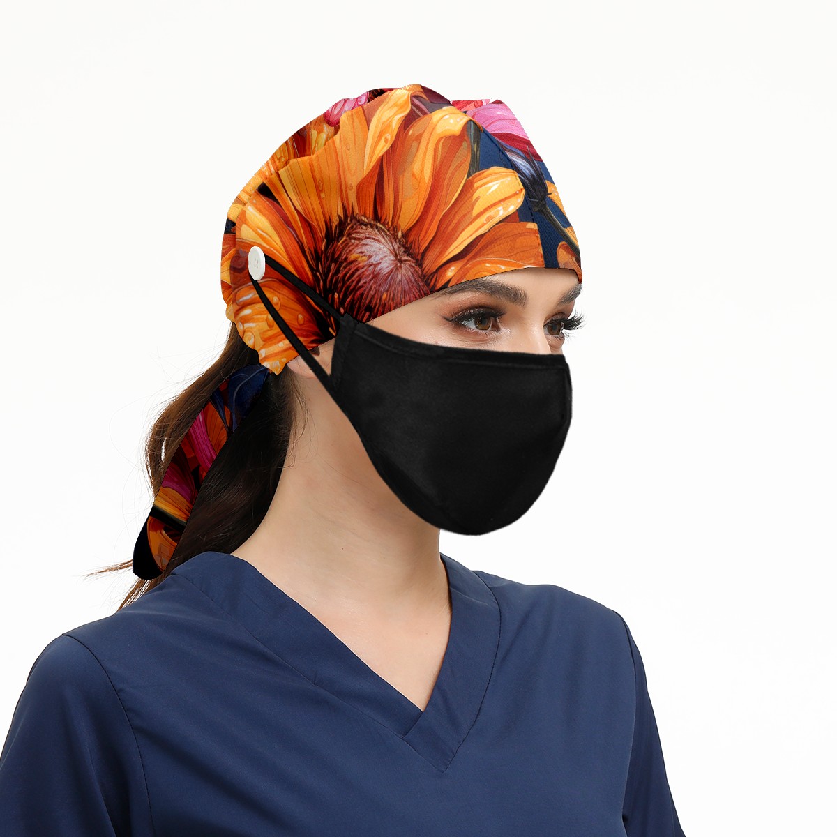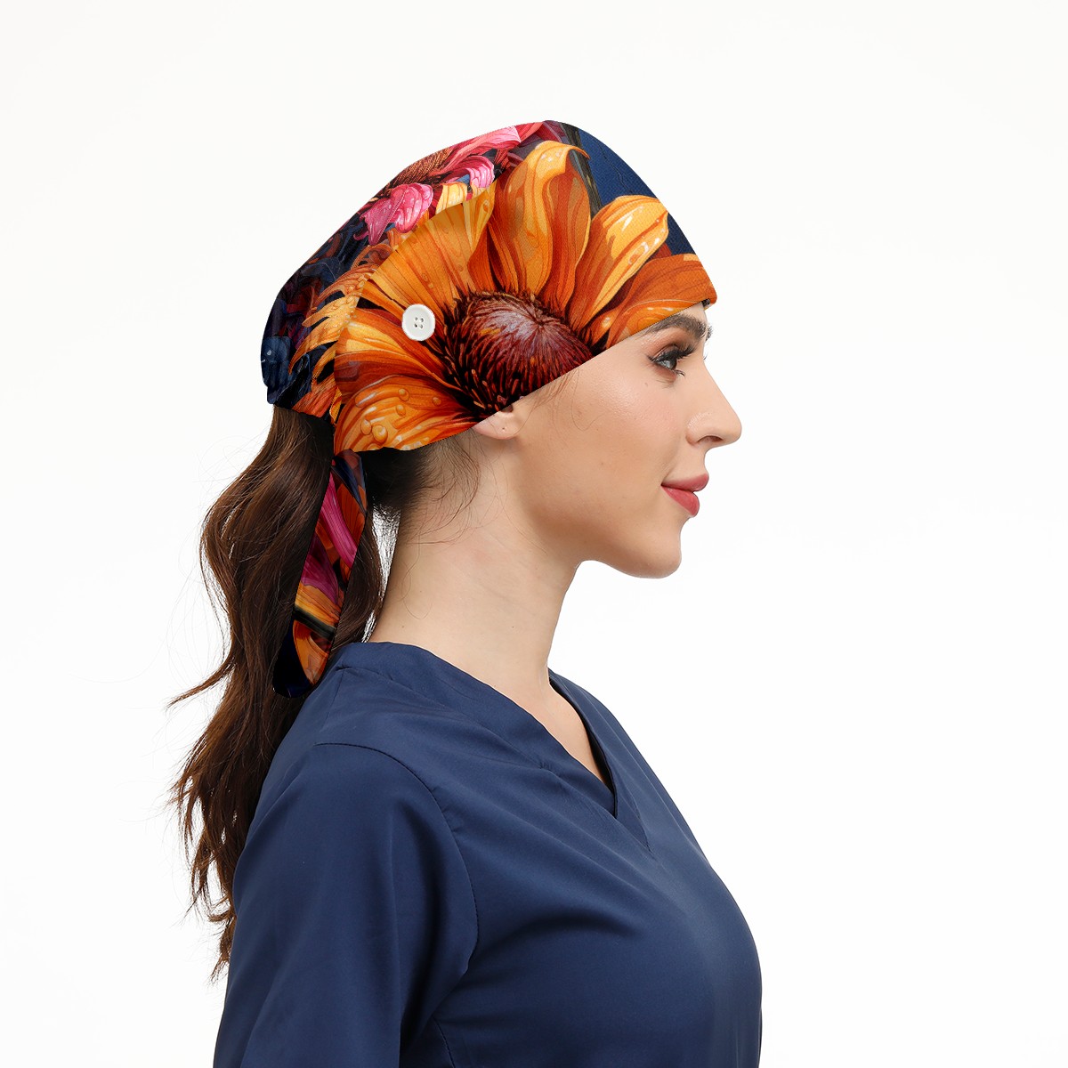 Working Caps with Button & Sweatband Satin Lined Cotton Adjustable Nurse Hats Elastic Band Scrub Cap Surgeon Hat Sunflower