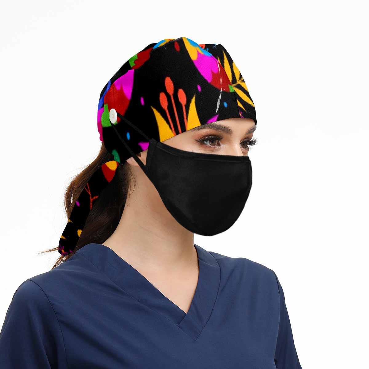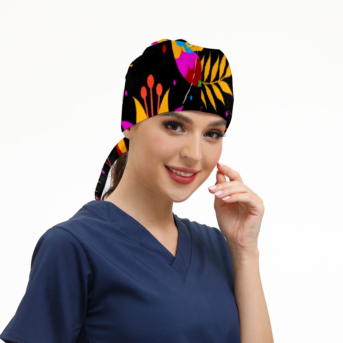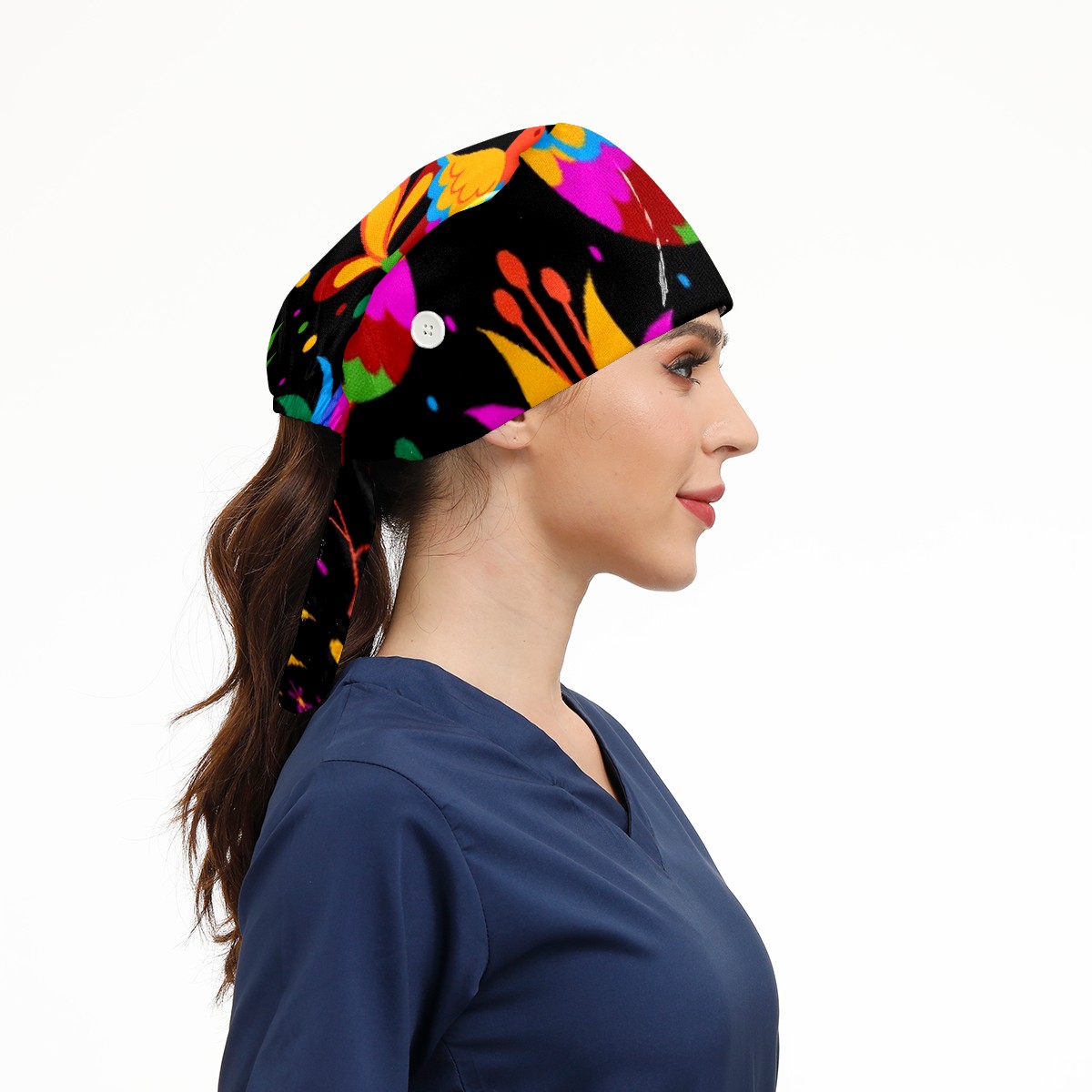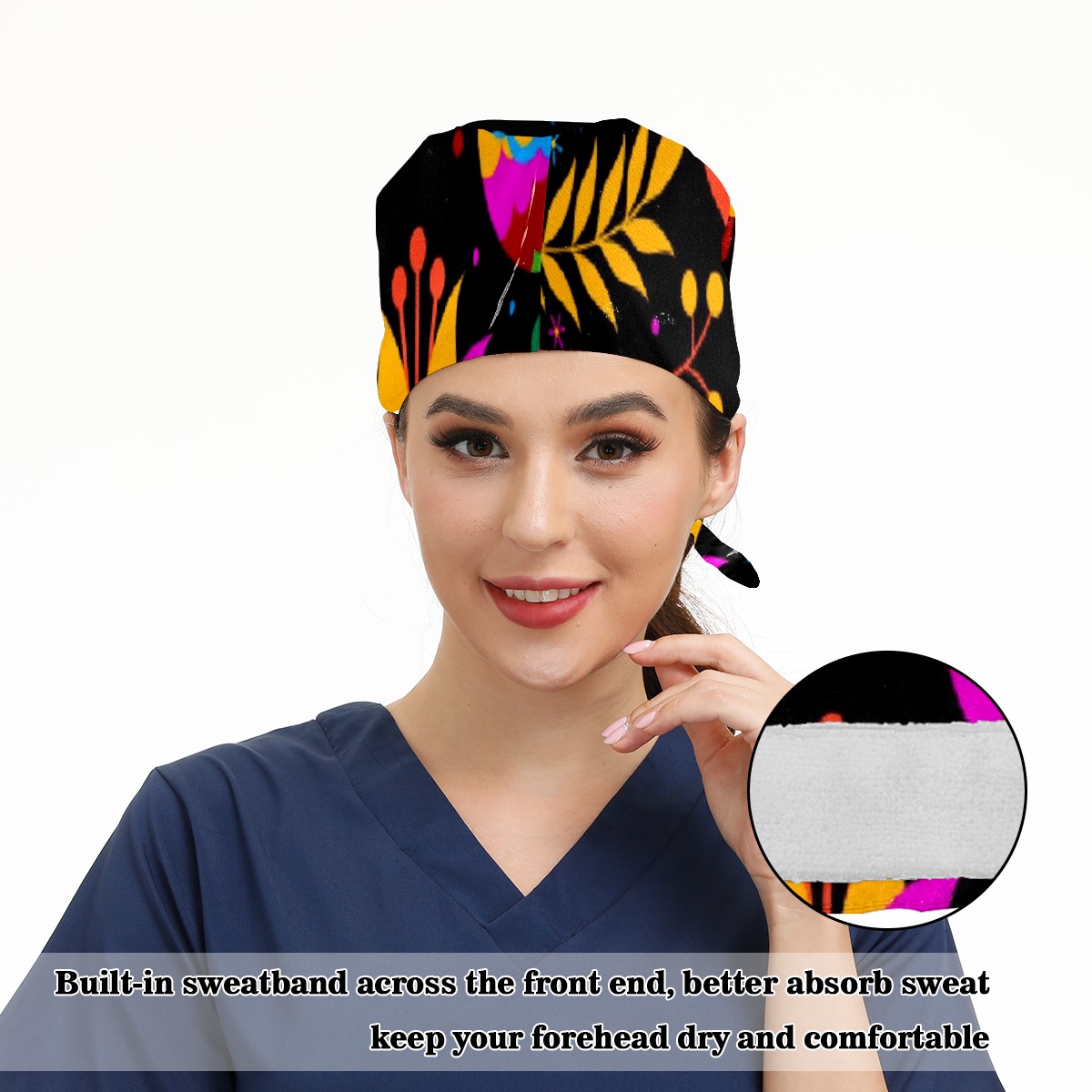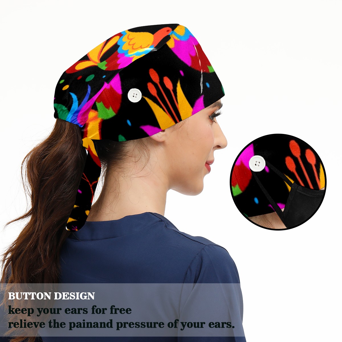 Working Caps with Button & Sweatband Satin Lined Cotton Adjustable Nurse Hats Elastic Band Scrub Cap Surgeon Hat Mexican Flowering Birds