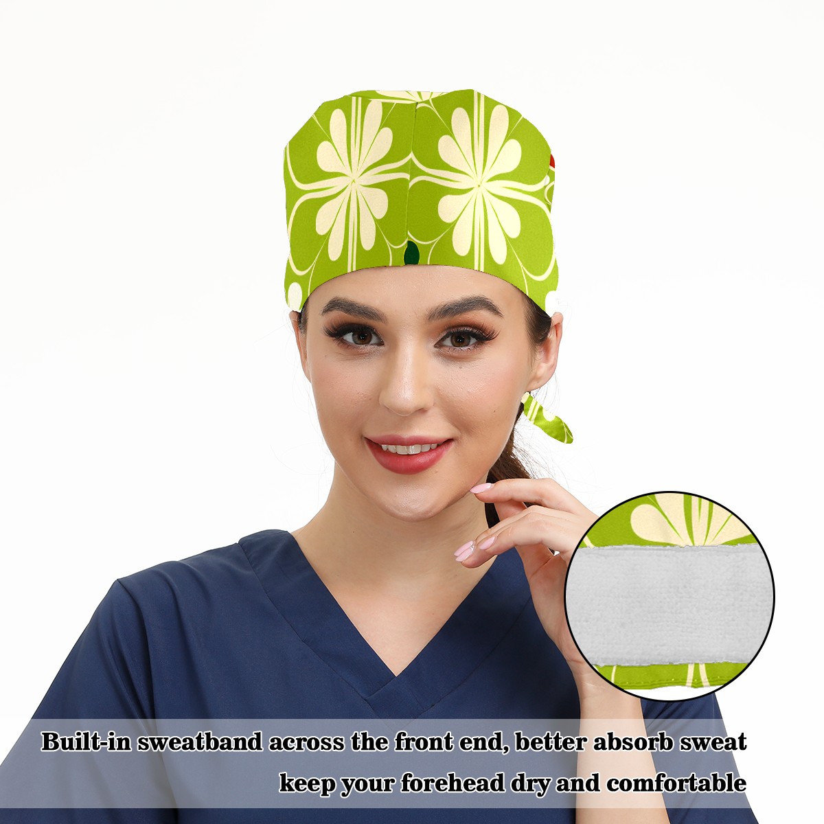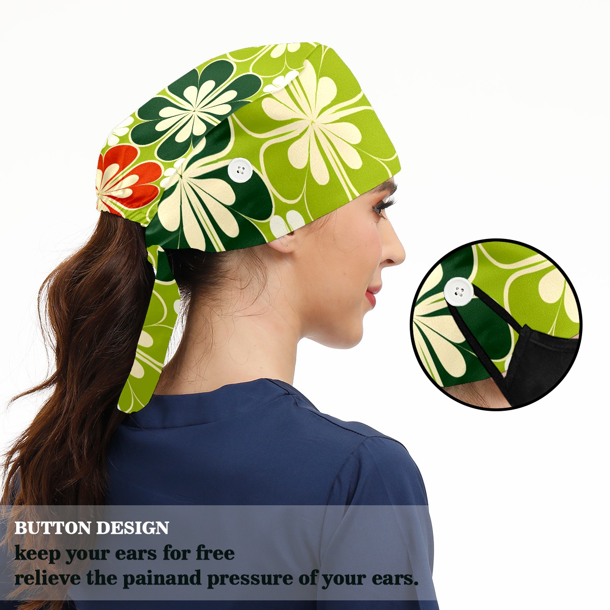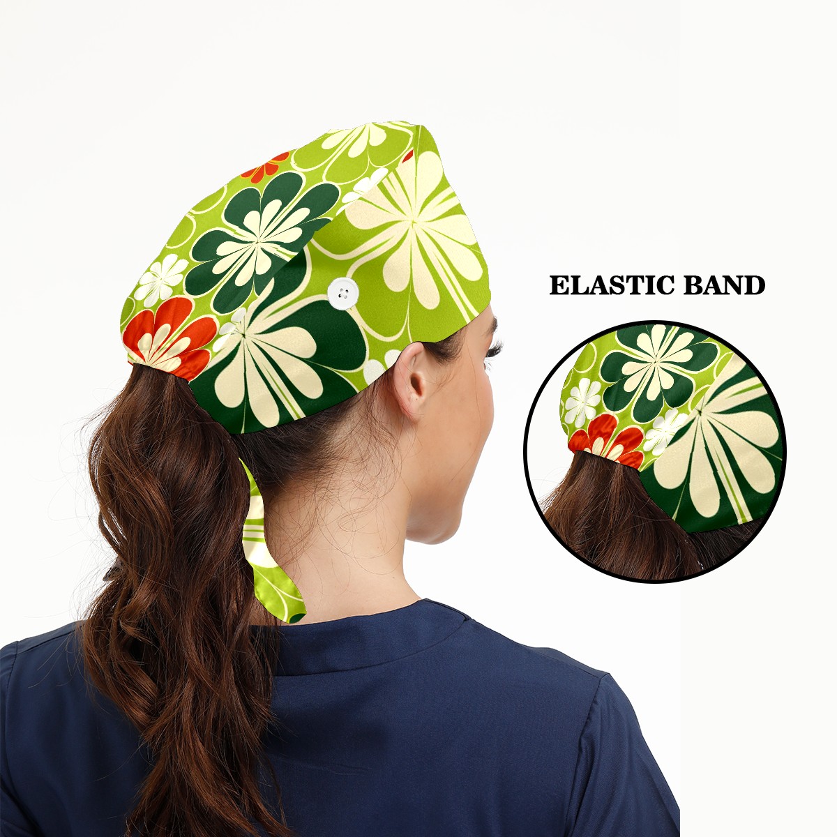 Working Caps with Button & Sweatband Satin Lined Cotton Adjustable Nurse Hats Elastic Band Scrub Cap Surgeon Hat Four Leaf Clover (59)
