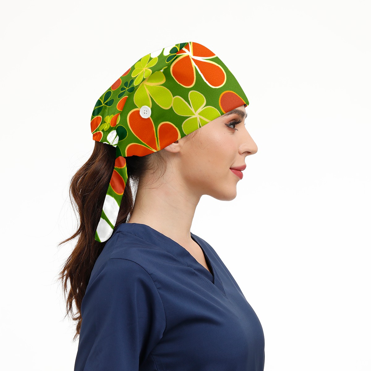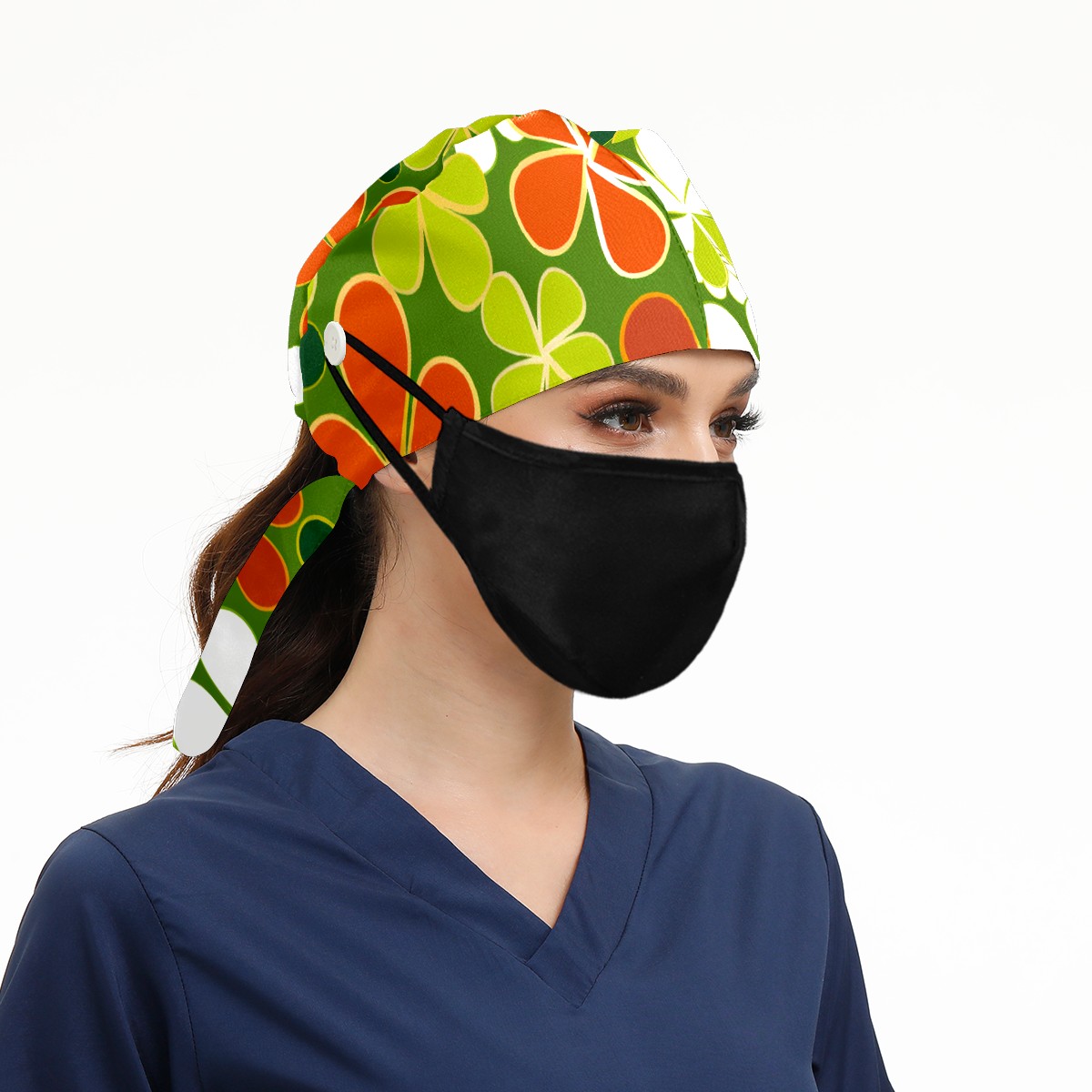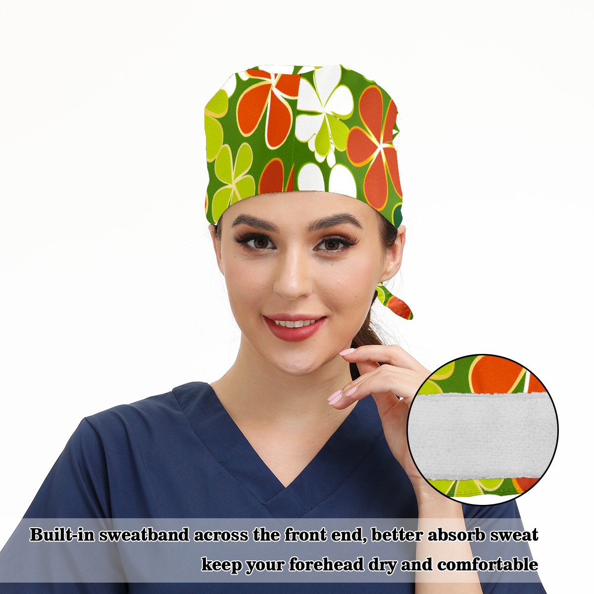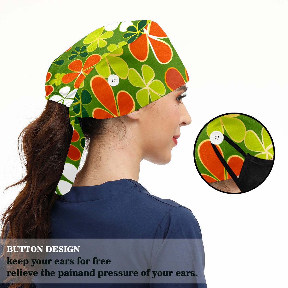 Working Caps with Button & Sweatband Satin Lined Cotton Adjustable Nurse Hats Elastic Band Scrub Cap Surgeon Hat Four Leaf Clover (57)
