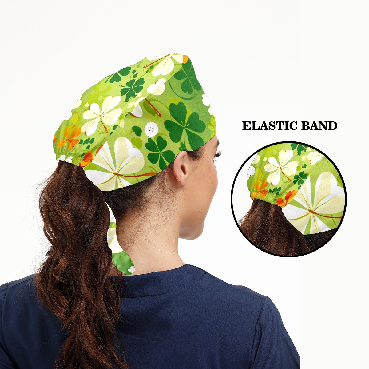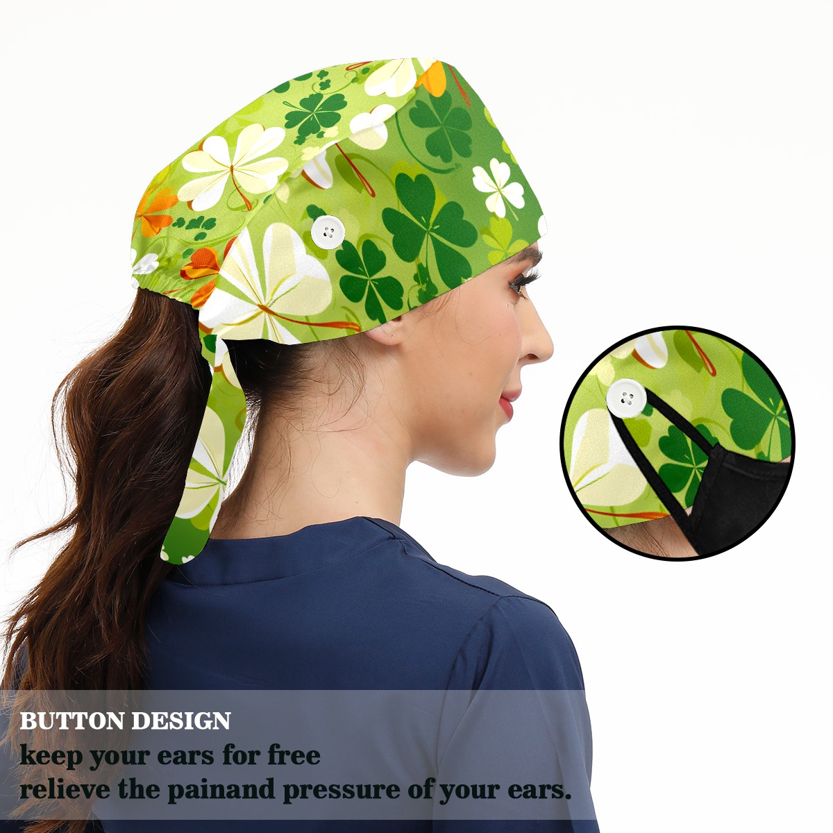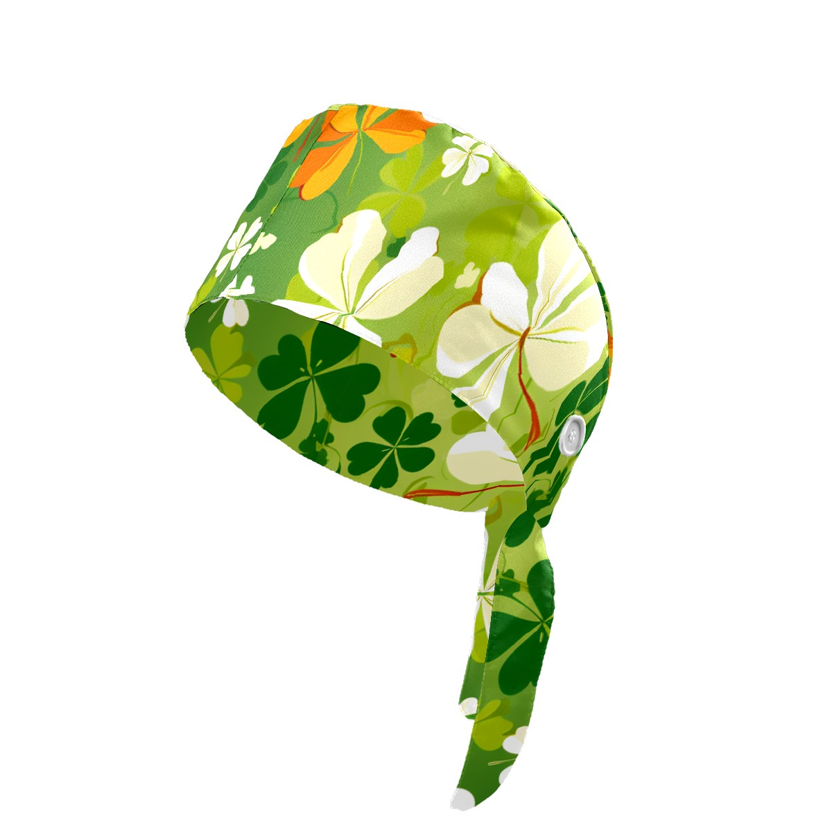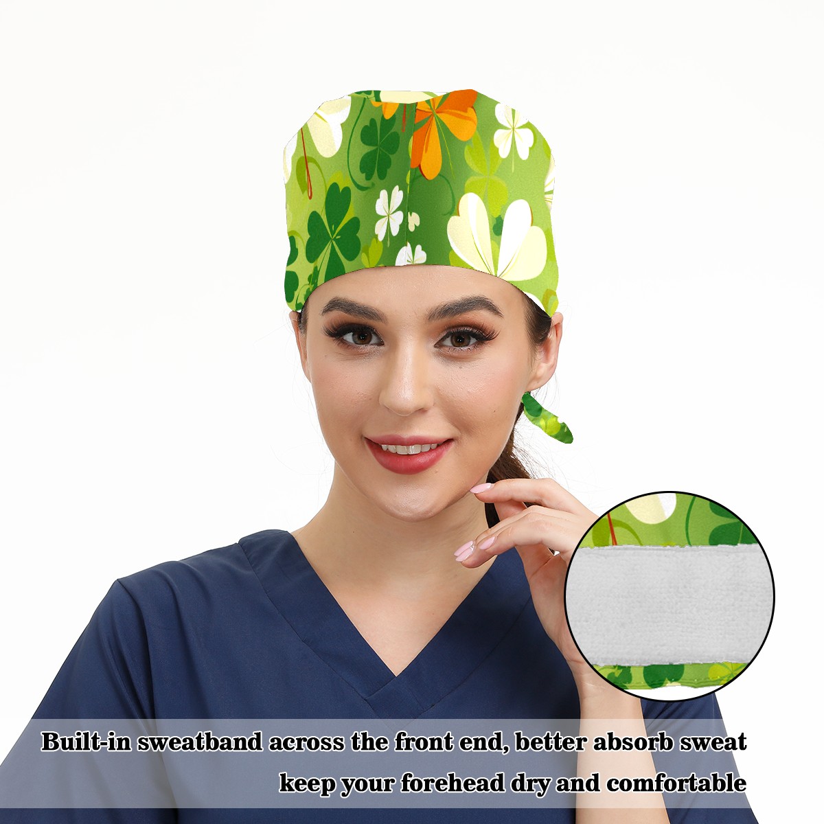 Working Caps with Button & Sweatband Satin Lined Cotton Adjustable Nurse Hats Elastic Band Scrub Cap Surgeon Hat Four Leaf Clover (43)