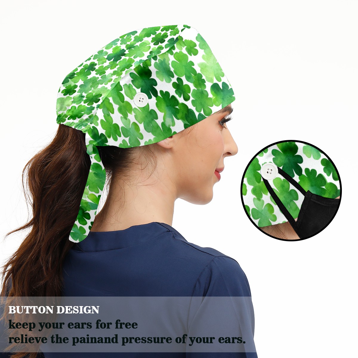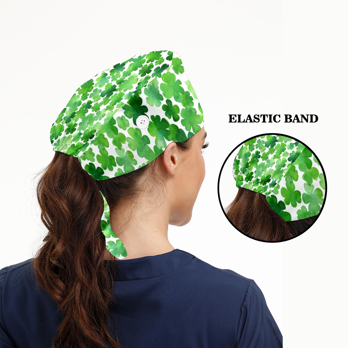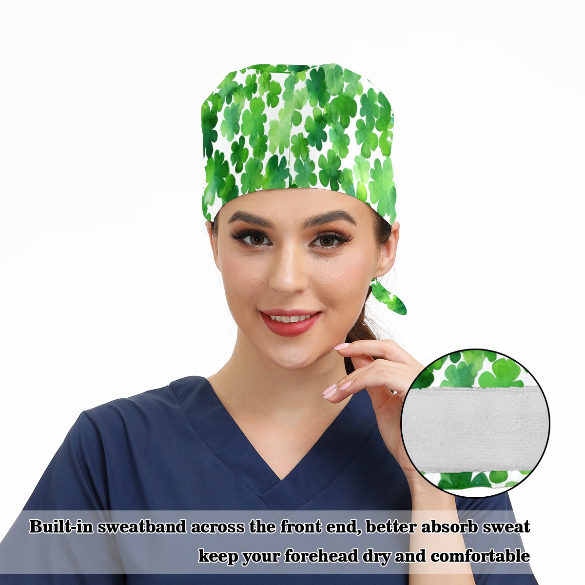 Working Caps with Button & Sweatband Satin Lined Cotton Adjustable Nurse Hats Elastic Band Scrub Cap Surgeon Hat Four Leaf Clover (13)